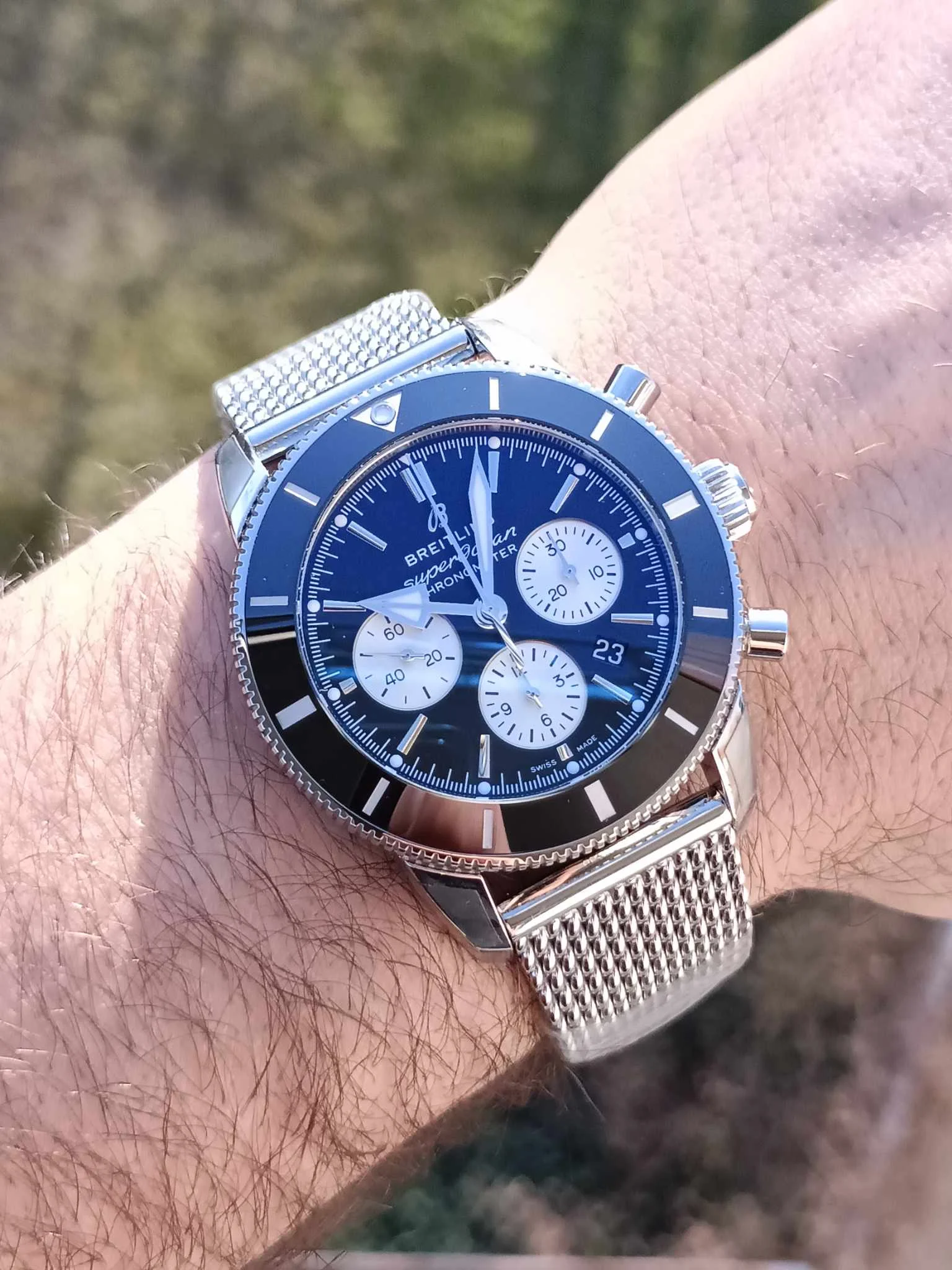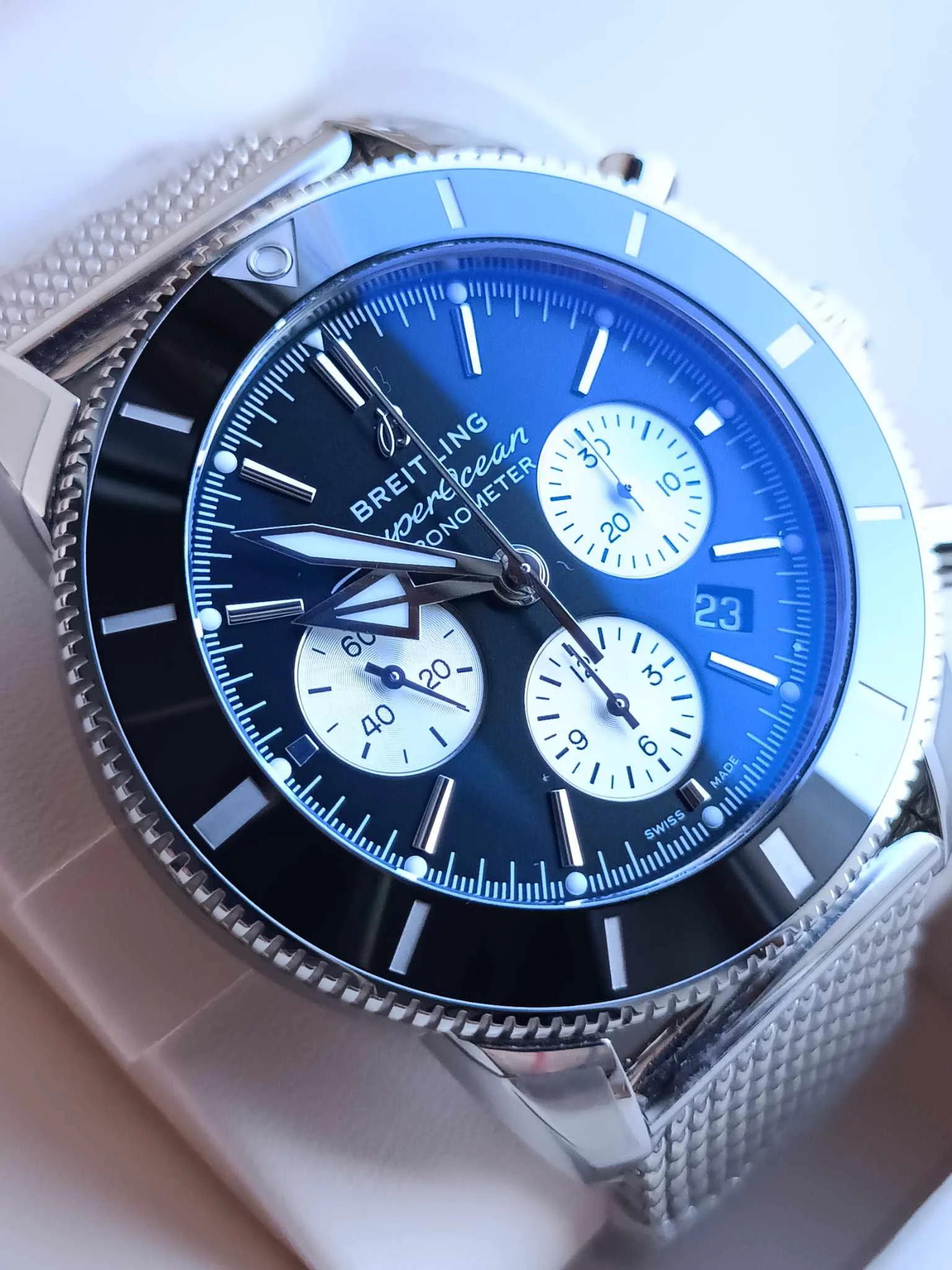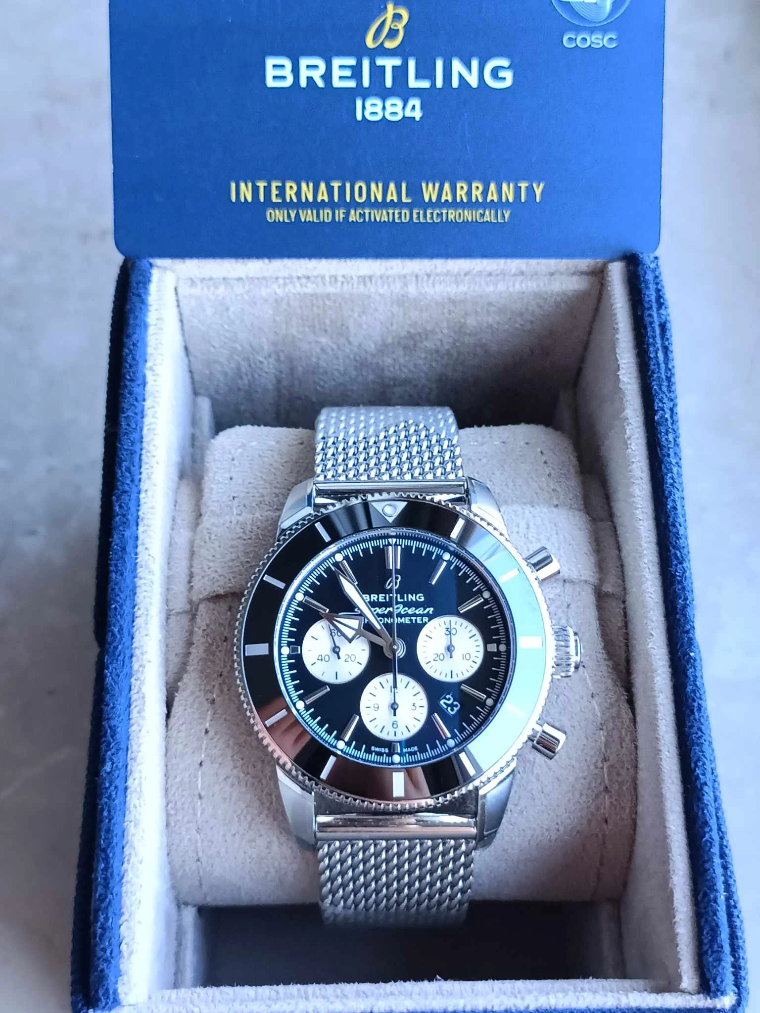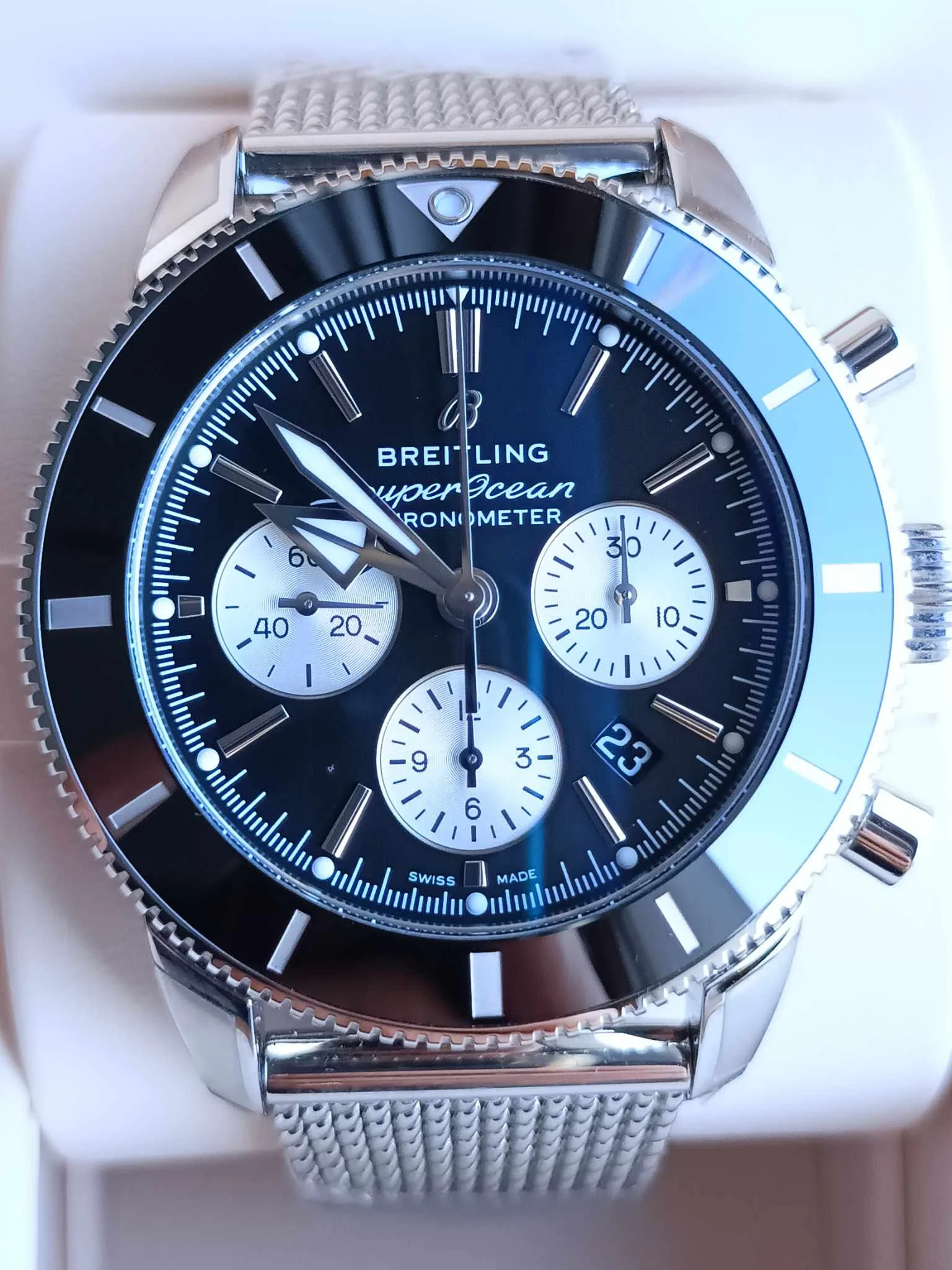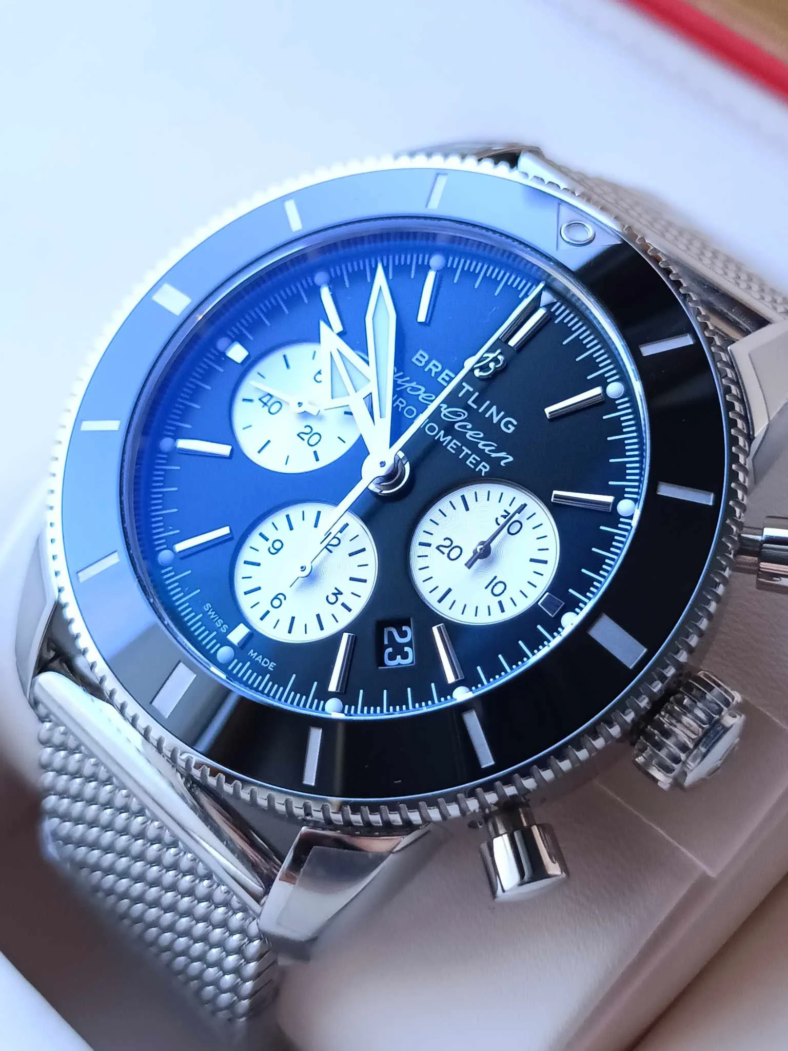 The Breitling Superocean Heritage B01 Chronograph is a harmonious combination of diving functionality with elegant retro style. The dynamic 44 mm stainless steel case hides an advanced B01 movement with COSC chronometer certification. The black dial with contrasting silvery sub-dials creates a classic, elegant look. The unidirectional ceramic rotating ring with a 60-minute scale ensures precise measurement of dive time. The distinctive arrow hands filled with Super-LumiNova guarantee excellent readability even in conditions of limited visibility. The glazed case back allows you to admire the unusual finish of the movement. A water resistance of up to 200 meters and a steel mesh bracelet with a characteristic mesh texture complete the image of this versatile timepiece. It is a proposal for people who value timeless elegance and advanced technology.