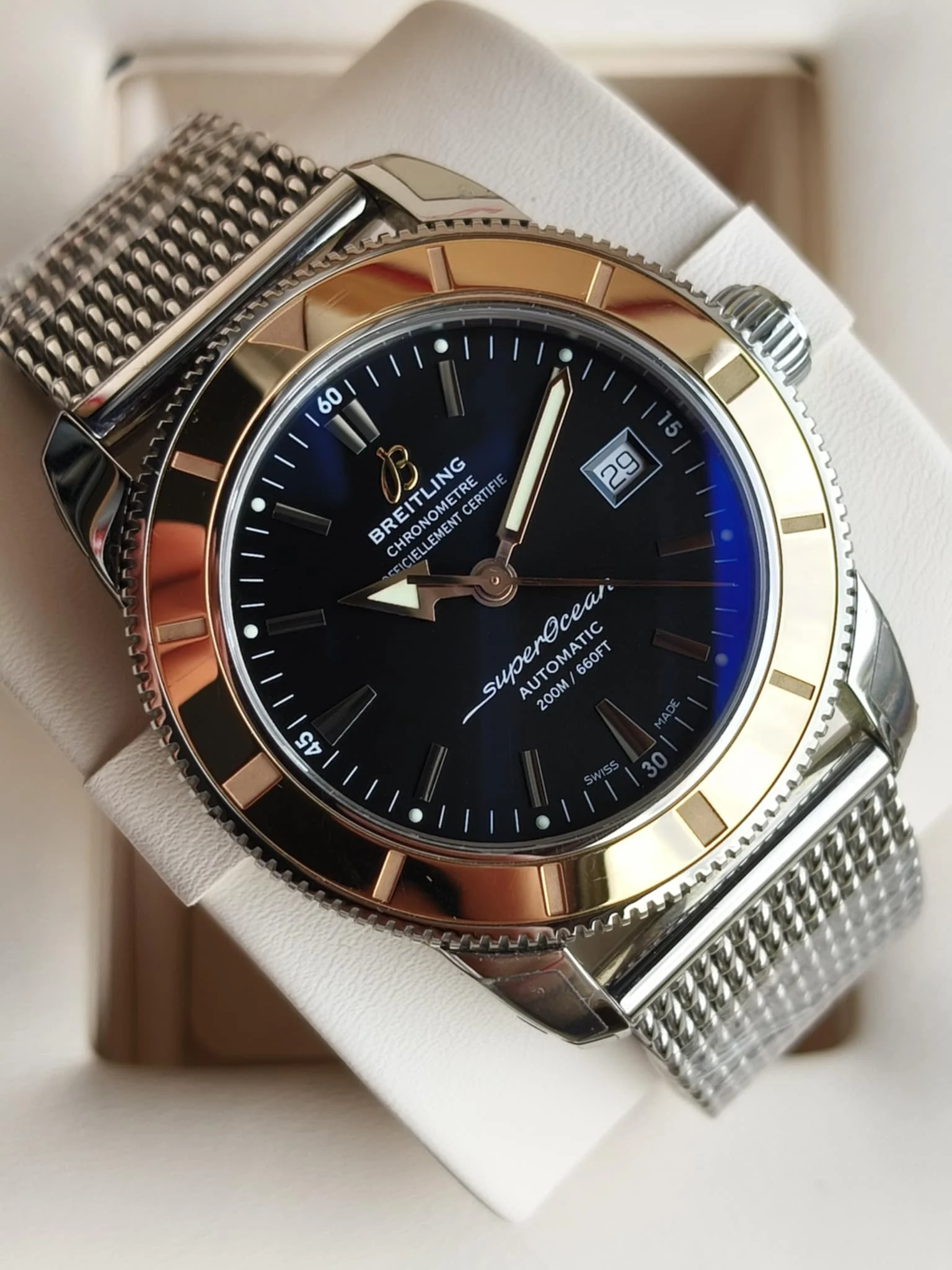 The Breitling Superocean Heritage 42 U1732112 is a stylish tribute to the brand’s diving heritage, combining retro design with modern technology. The 42 mm case, made of a combination of stainless steel and rose gold, refers to the aesthetics of the 50s, when the first Superocean line was created. The polished finish and the classic, slim bezel give the watch an elegant yet sporty character.