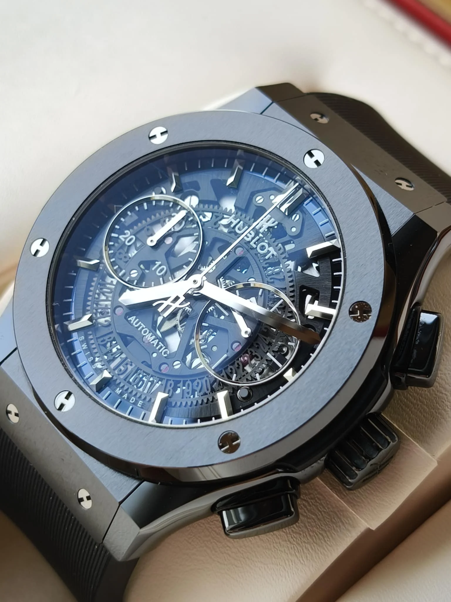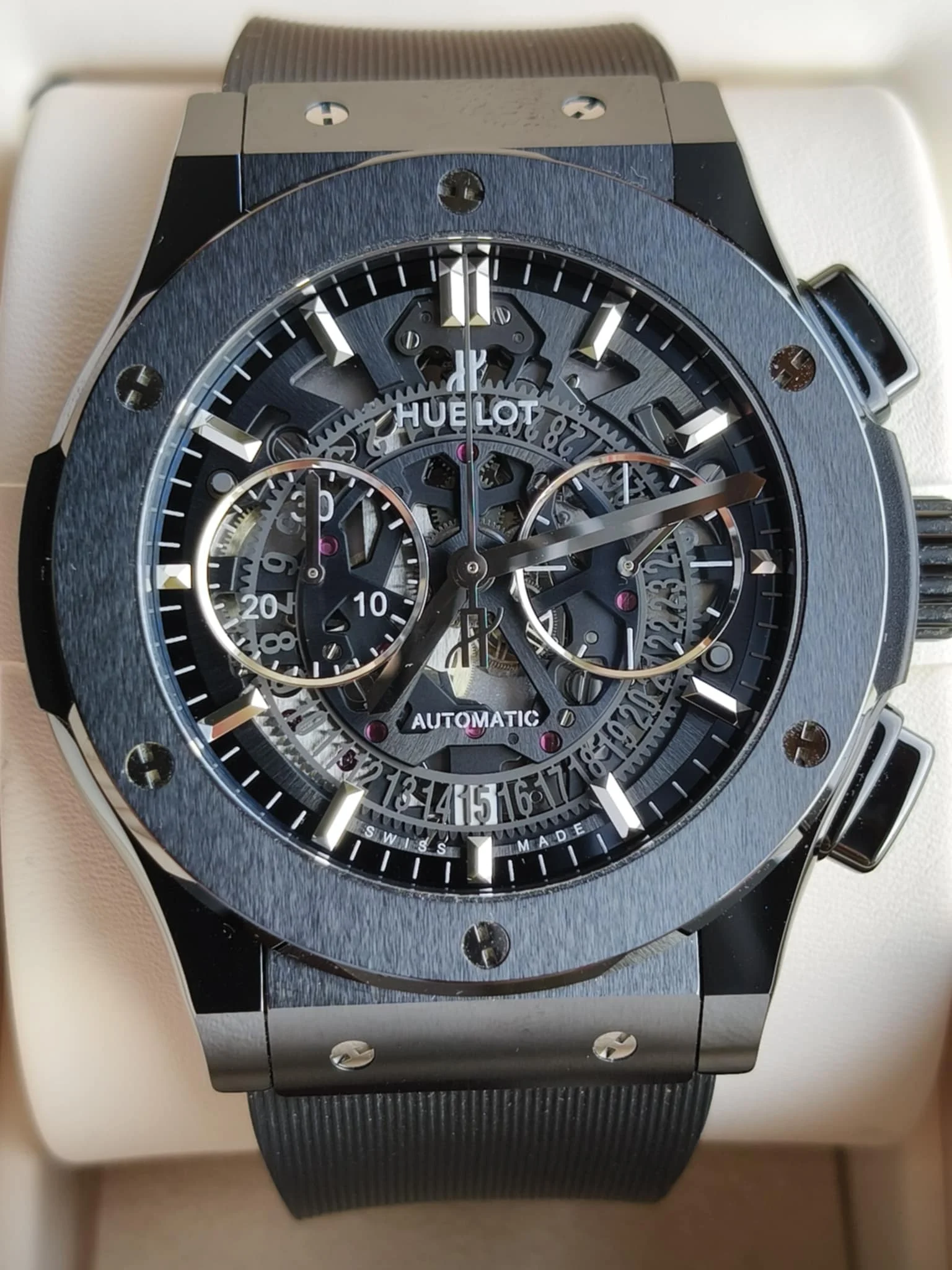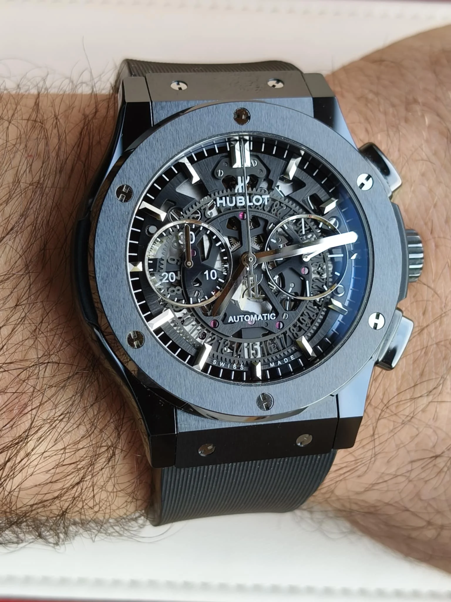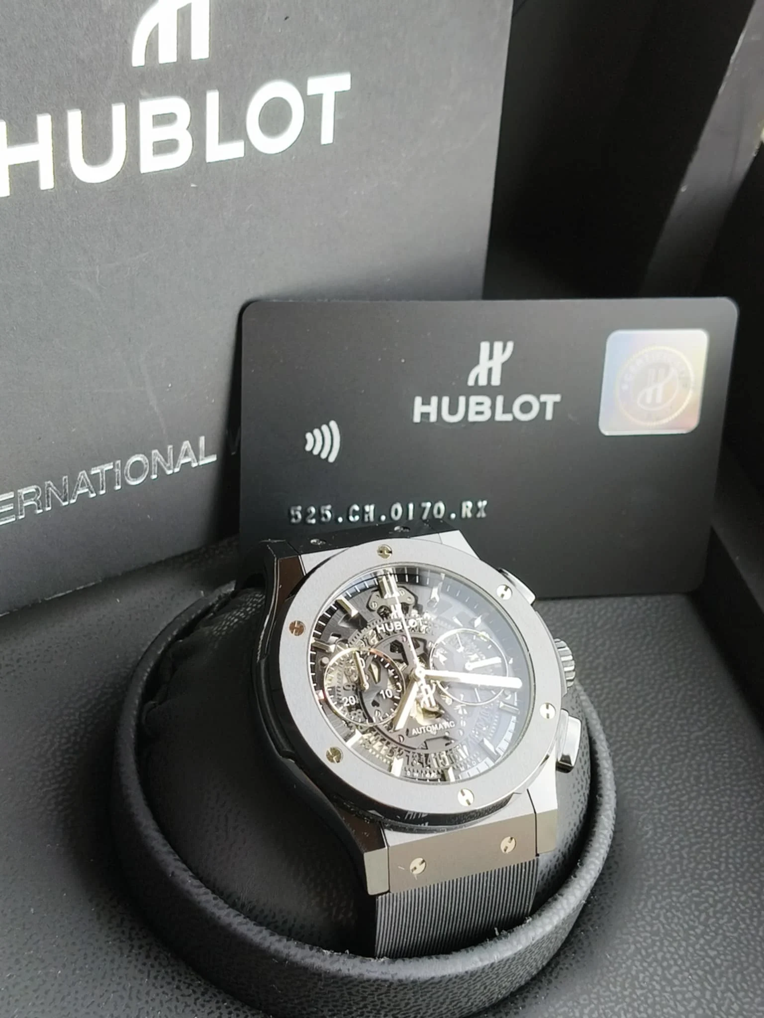 The Hublot Classic Fusion Aerofusion Black Magic 525.CM.0170.RX is a modern timepiece that boldly combines avant-garde design with advanced watchmaking technology. This model belongs to the acclaimed Classic Fusion collection, where Swiss precision meets the futuristic aesthetics and innovative materials for which Hublot is renowned. The watch features a large 45mm case crafted from black ceramic, providing exceptional durability, lightness, and scratch resistance. The matte finish of the ceramic lends an elegant industrial character, while six titanium screws in the distinctive “H” shape on the bezel immediately reveal the brand’s identity. One of the key distinguishing features of this model is the skeletonized dial, which reveals the complexity and beauty of the mechanism operating within the case. Black bridges, contrasting with metallic details, create a modern, technical look while ensuring high legibility thanks to the expressive hands and indexes coated with a luminescent layer. At the heart of the Aerofusion Black Magic is the Hublot HUB1155 automatic chronograph – a precision movement with a 42-hour power reserve, featuring a chronograph function, a small seconds dial, and a date display discreetly positioned at 6 o’clock. The entire watch is protected by an anti-reflective sapphire crystal and a transparent caseback, allowing you to admire the movement in action. The watch is offered on a black rubber strap with a titanium butterfly clasp, ensuring not only excellent comfort but also underlining the timepiece’s sporty, luxurious character. Water resistance to 50 meters (5 bar) makes this model ideal for everyday wear and occasions requiring refined style. The Hublot Classic Fusion Aerofusion Black Magic 525.CM.0170.RX is an expression of contemporary luxury and engineering audacity. Created for those who demand a unique look, the highest quality craftsmanship, and an uncompromising approach to design – both in the world of business and modern lifestyle.
