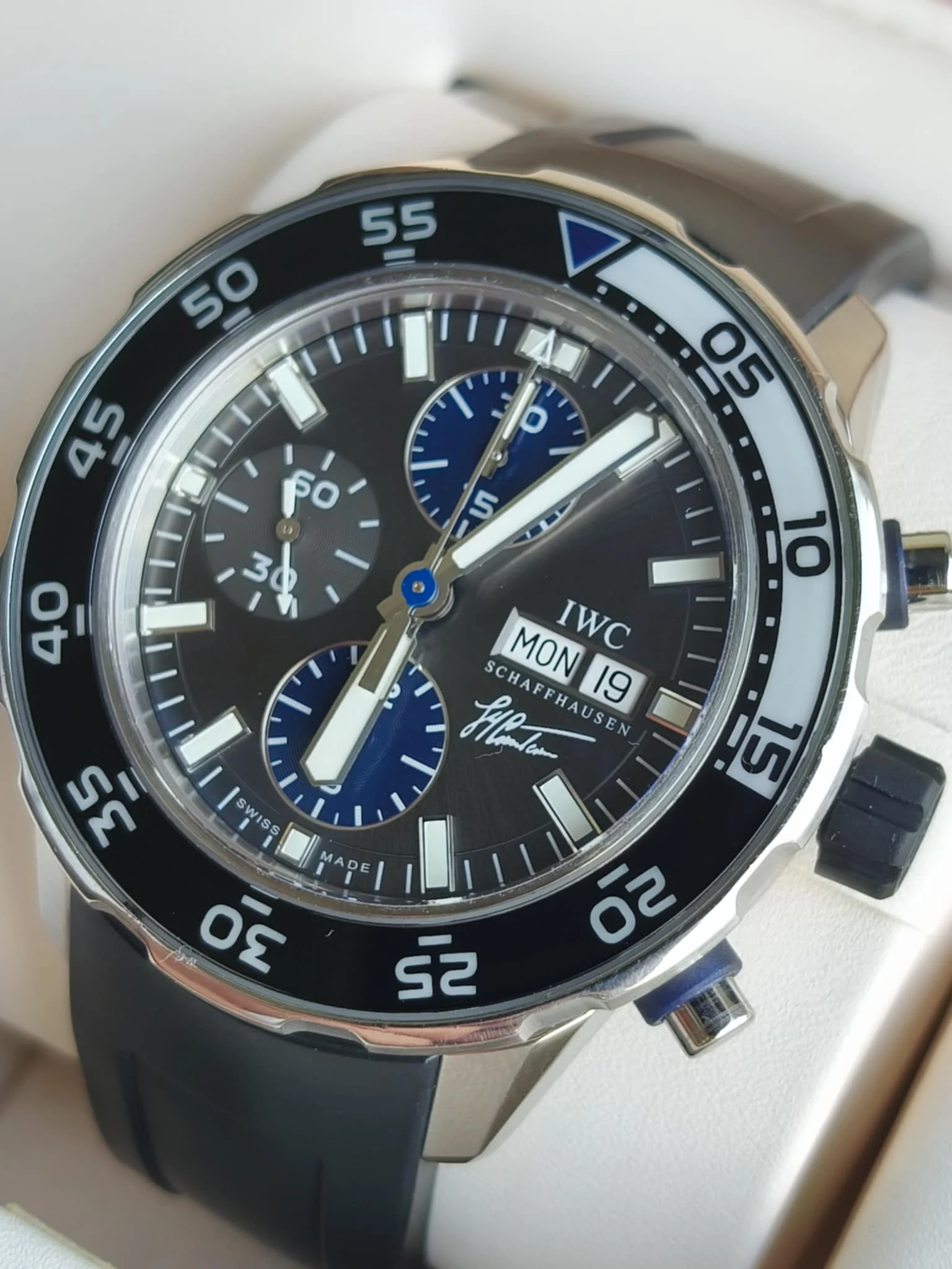 IWC Schaffhausen Aquatimer Chronograph Edition Jacques-Yves Costeau IW376706 to wydany w 2010 r. z okazji 100. rocznicy urodzin Jacques’a‑Yves’a Cousteau, słynnego odkrywcy oceanów. Był częścią serii specjalnych wydań IWC na rzecz Cousteau Society. Ten model łączy w sobie solidne funkcje gotowe do nurkowania z eleganckimi akcentami estetycznymi na cześć Jacques’a-Yves’a Cousteau.
