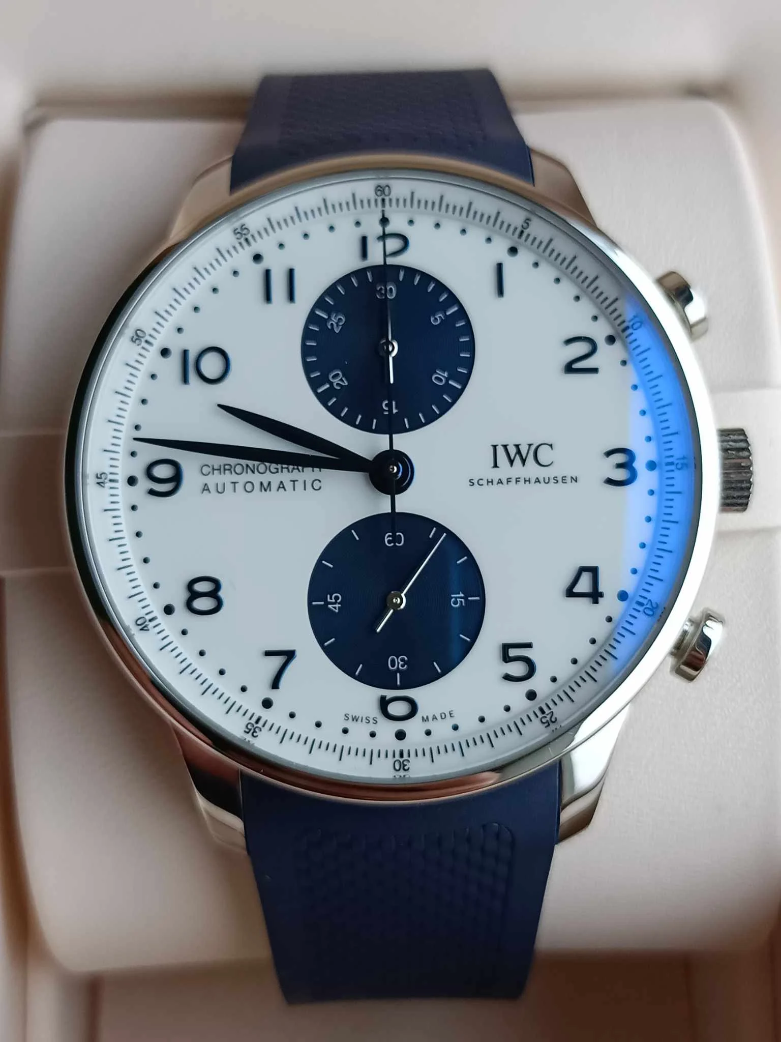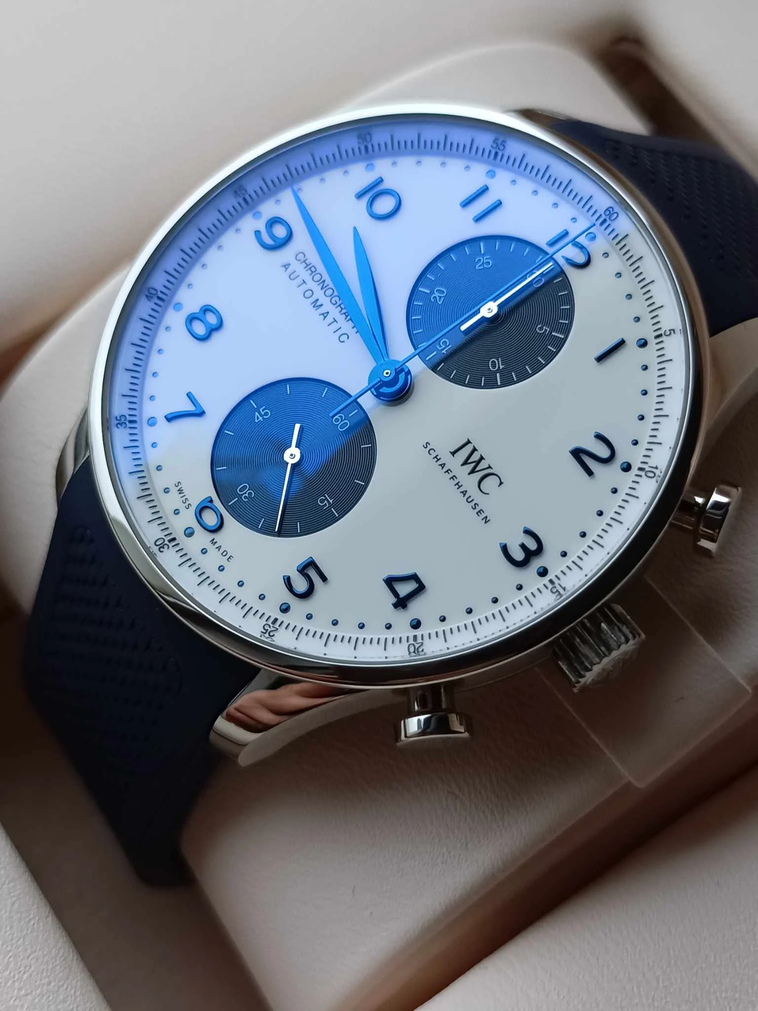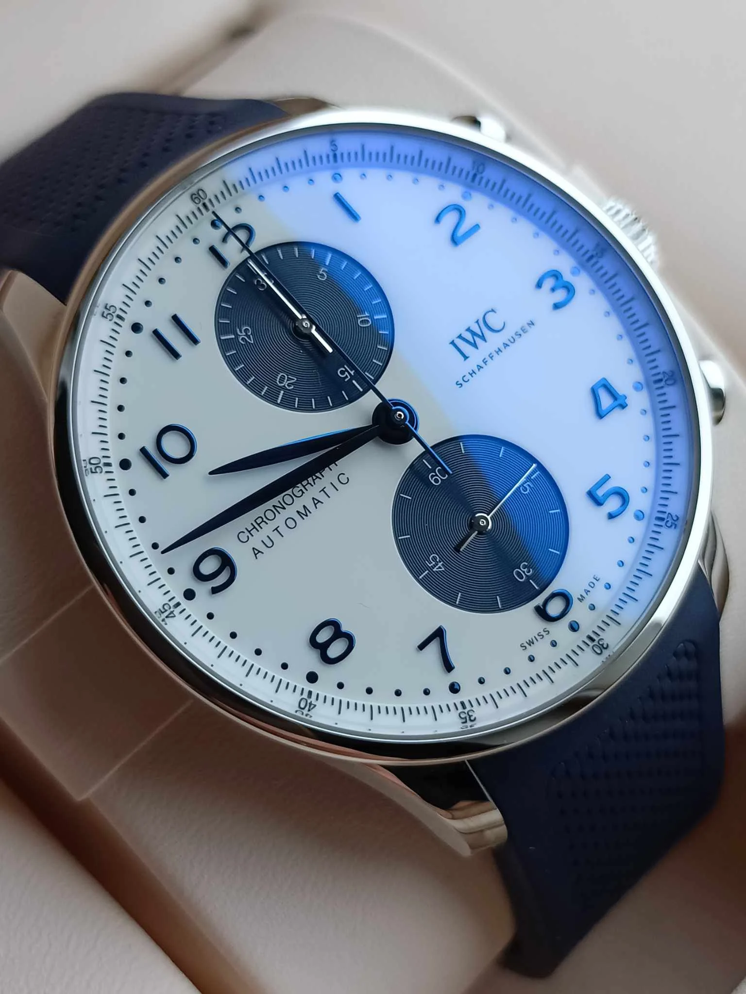 IWC Schaffhausen Portugieser Chronograph IW371620 to wyrafinowana, biało-niebieska
