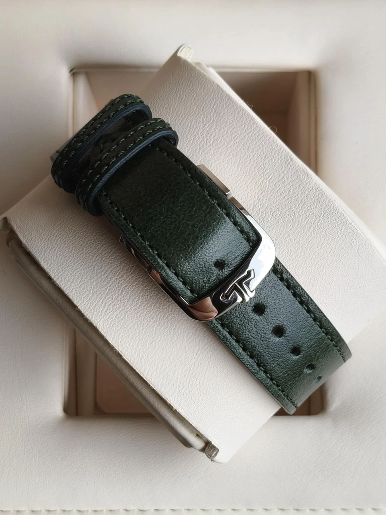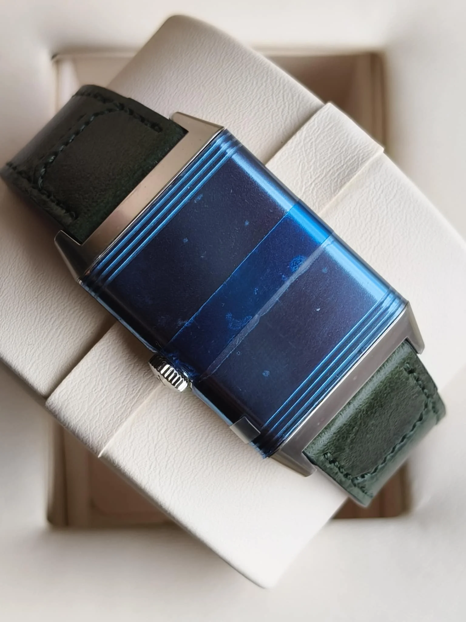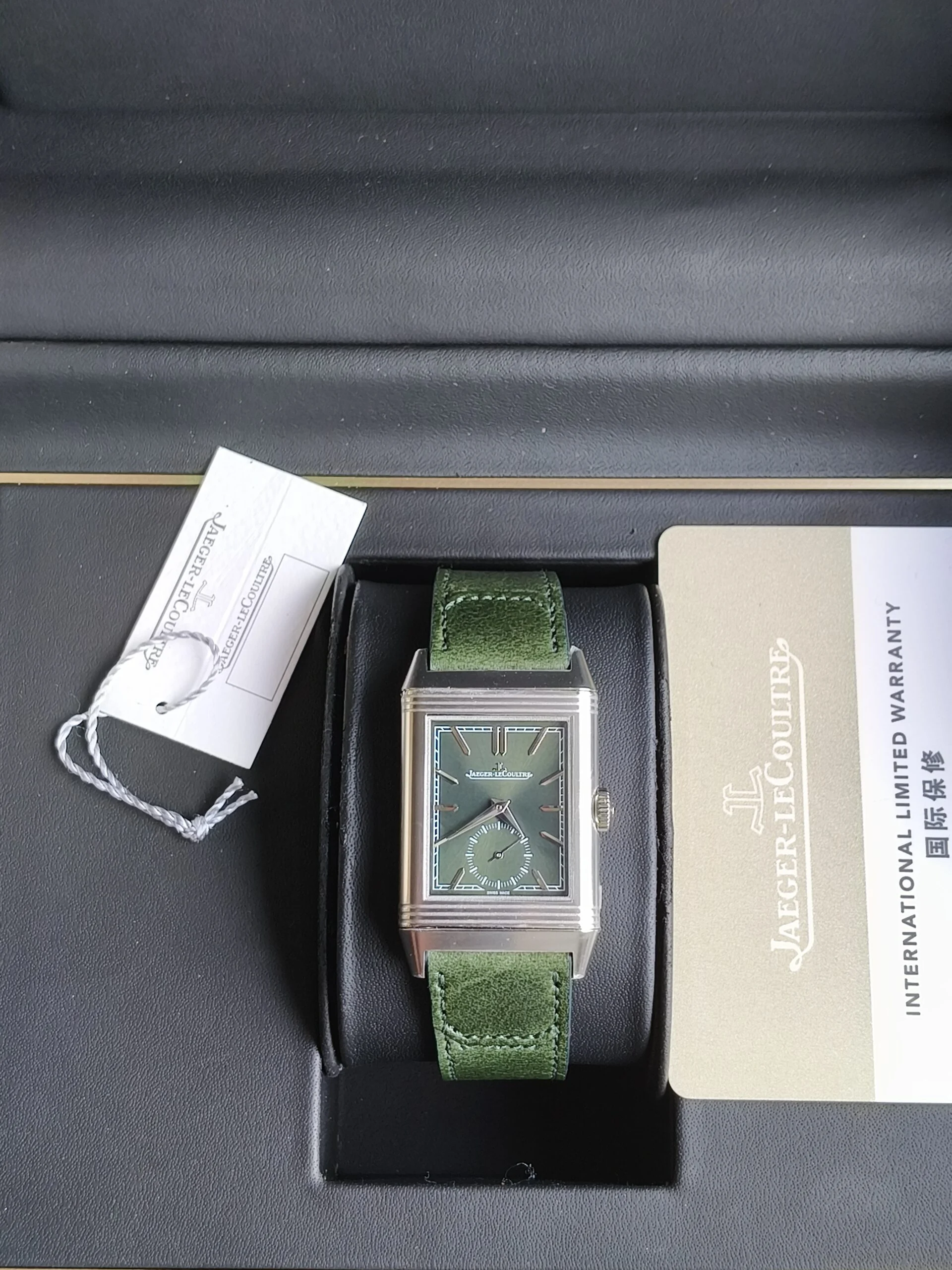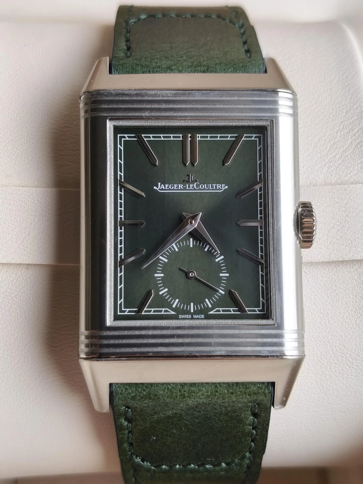 Jaeger-LeCoultre Reverso Tribute Small Seconds Q3978430 to wyrafinowana i nowoczesna interpretacja kultowego Reverso z 1931 roku, cenionego za design w stylu Art Deco i odwracalną kopertę.Ten model, wprowadzony w 2021 roku, ma charakterystyczną, głęboko zieloną, lakierowaną tarczę z promieniami słonecznymi, uzupełnioną pasującym zielonym paskiem ze skóry cielęcej wykonanym przez znaną firmę Casa Fagliano.