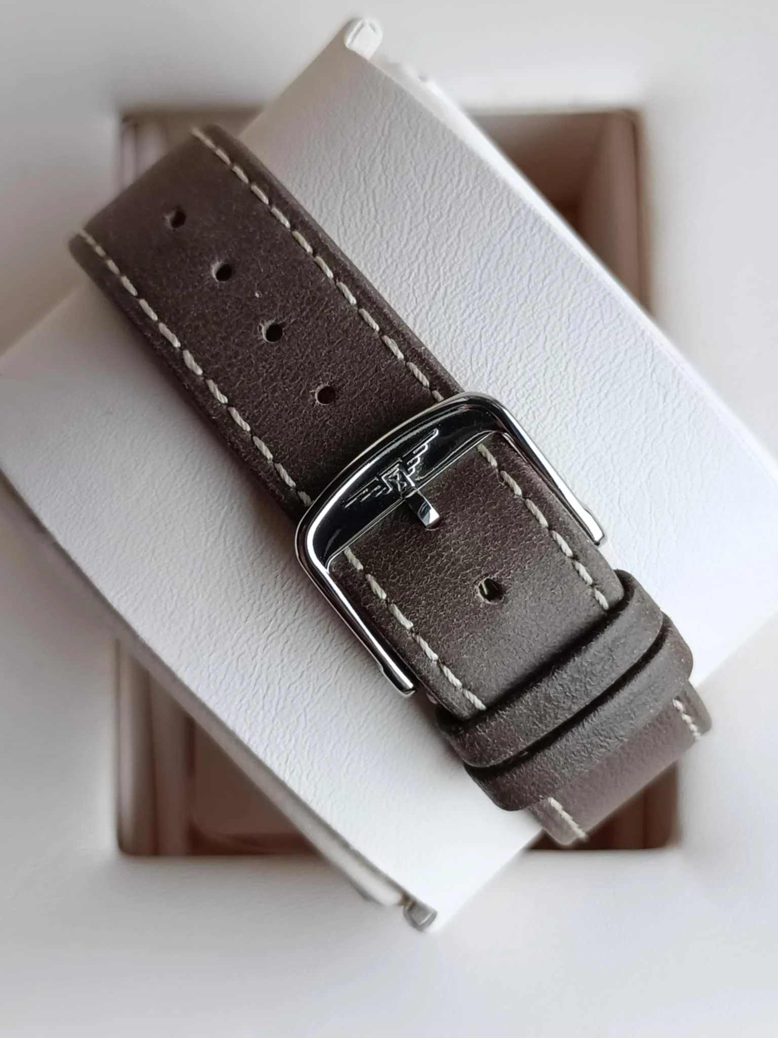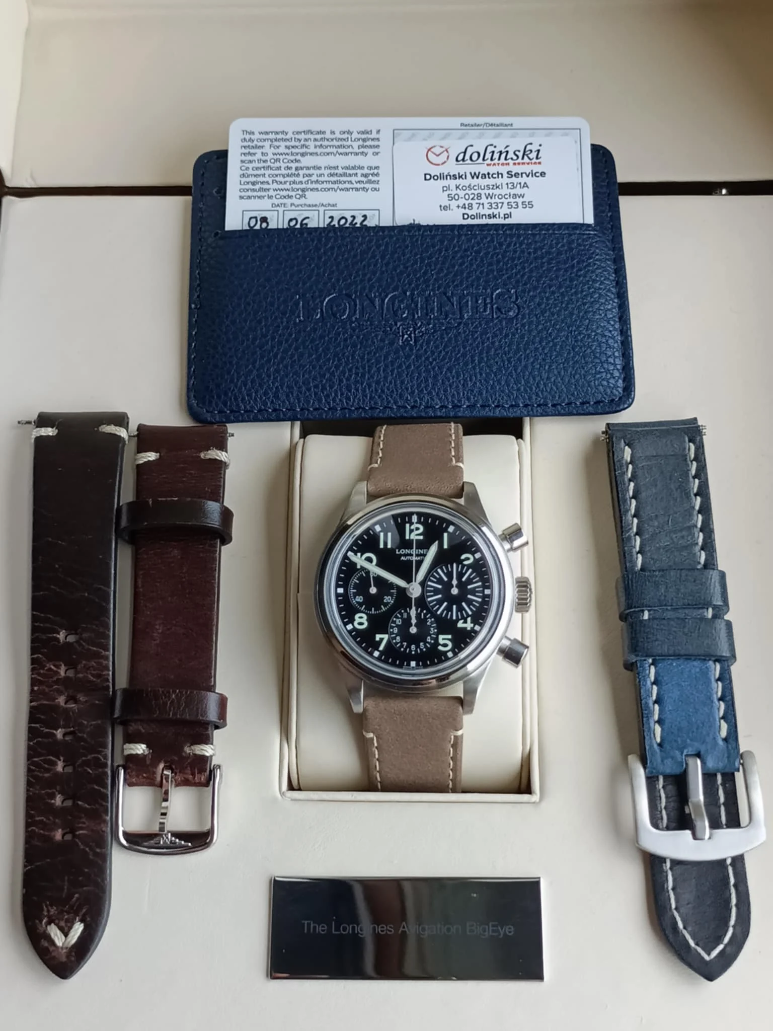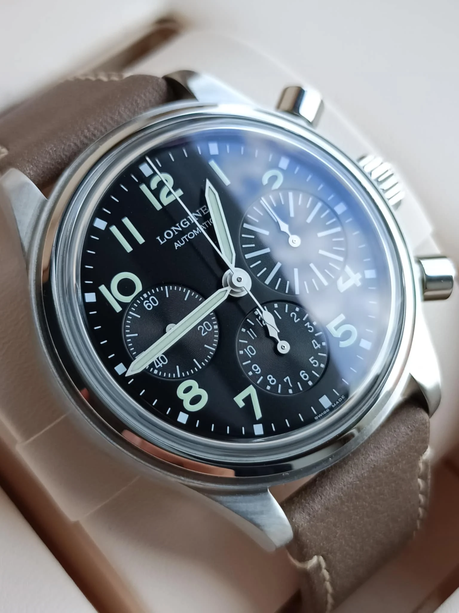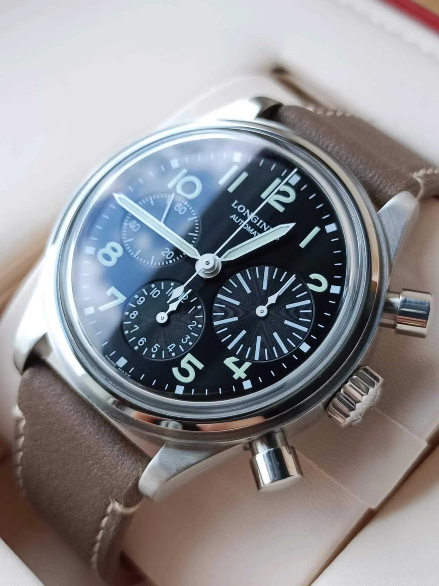 Longines Avigation BigEye L2.816.4.53.2 to współczesna reedycja chronografu z 1971 roku, łącząca zabytkową estetykę lotnictwa ze współczesnym szwajcarskim zegarmistrzostwem. Ten model jest częścią kolekcji Heritage Avigation firmy Longines, która czerpie inspirację z historycznych związków marki z lotnictwem.Przydomek „BigEye” pochodzi od powiększonego 30-minutowego licznika na godzinie 3, charakterystycznej cechy, która poprawia czytelność dla pilotów — ukłon w stronę chronografów lotniczych z początku XX wieku. 41-milimetrowa koperta ze stali nierdzewnej ma półmatową czarną tarczę z malowanymi cyframi arabskimi i wskazówkami pokrytymi powłoką Super-LumiNova® dla lepszej czytelności.Wypukłe szkło szafirowe z powłoką antyrefleksyjną zapewnia trwałość i przejrzystość.Zegarek jest wodoodporny do 3 barów (30 metrów).