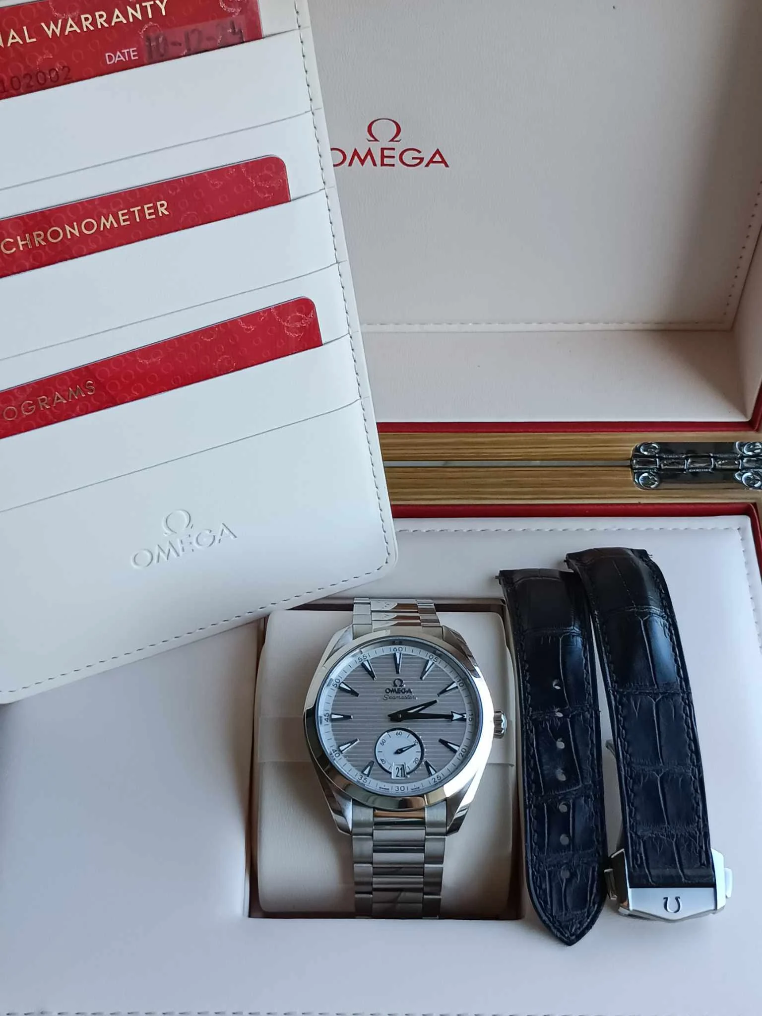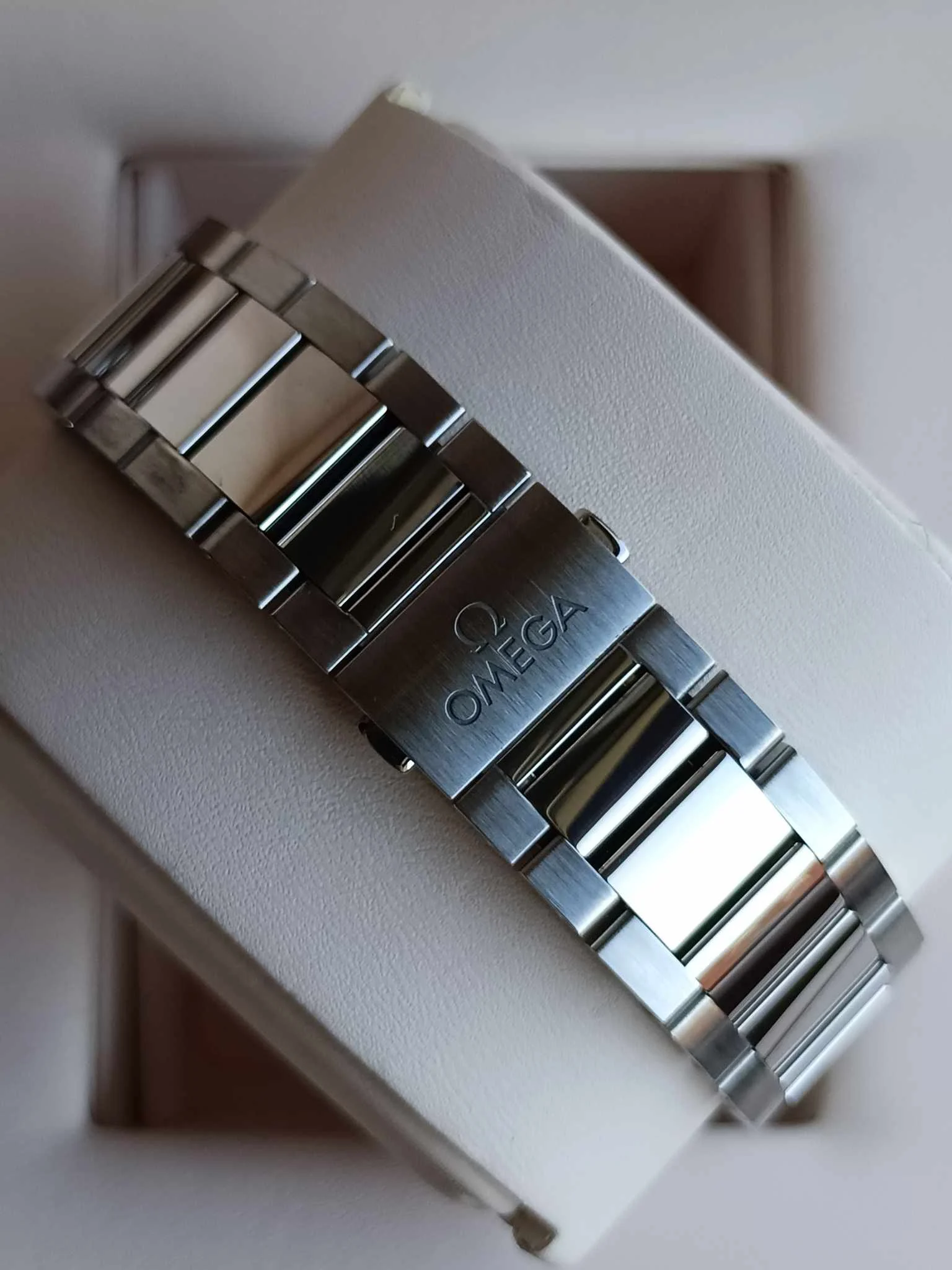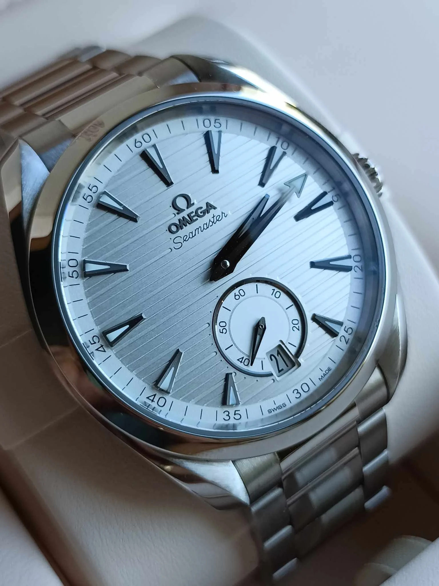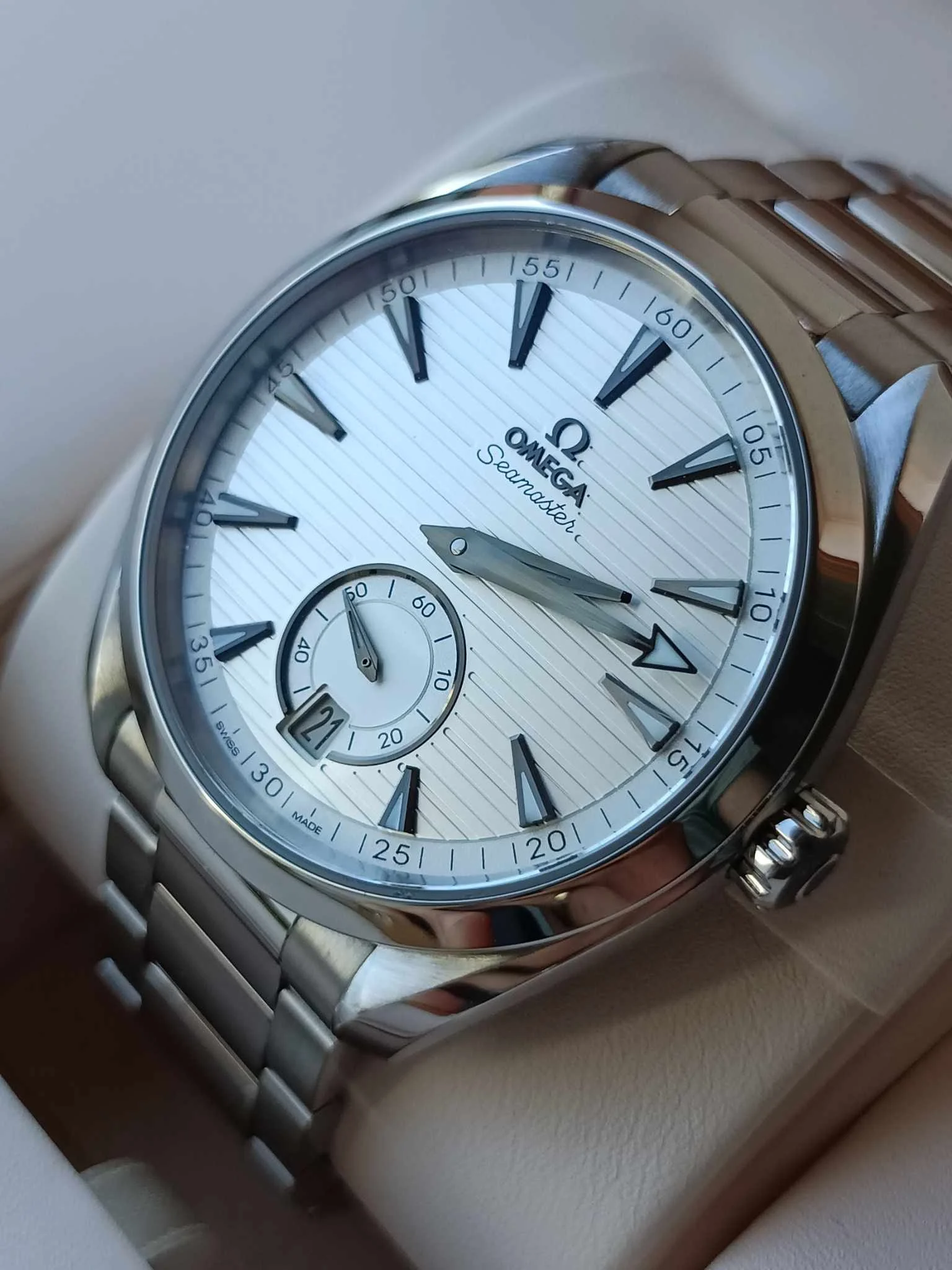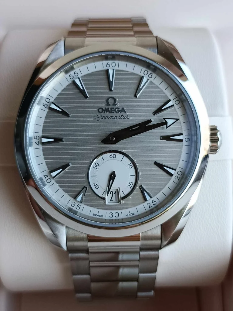Omega Seamaster Aqua Terra Small Seconds 220.10.41.21.02.002 to esencja eleganckiego sportowego stylu. Koperta o średnicy 41 mm ze stali szlachetnej skrywa zaawansowany mechanizm z koaksjalnym wychwytem i certyfikatem Master Chronometer. Srebrzysta tarcza z charakterystycznym poziomym wzorem “teak”, inspirowanym drewnianymi pokładami luksusowych jachtów, nadaje zegarkowi subtelny morski charakter. Datownik o godz. 6 oraz strzałkowe wskazówki wypełnione Super-LumiNova zapewniają doskonałą czytelność wskazań. Wodoszczelność do 150 metrów w połączeniu z elegancką stalową bransoletą sprawiają, że zegarek doskonale sprawdzi się zarówno podczas biznesowego spotkania, jak i weekendowego rejsu. To wszechstronny czasomierz dla osób ceniących sobie wyrafinowaną prostotę i wysoką jakość wykonania.