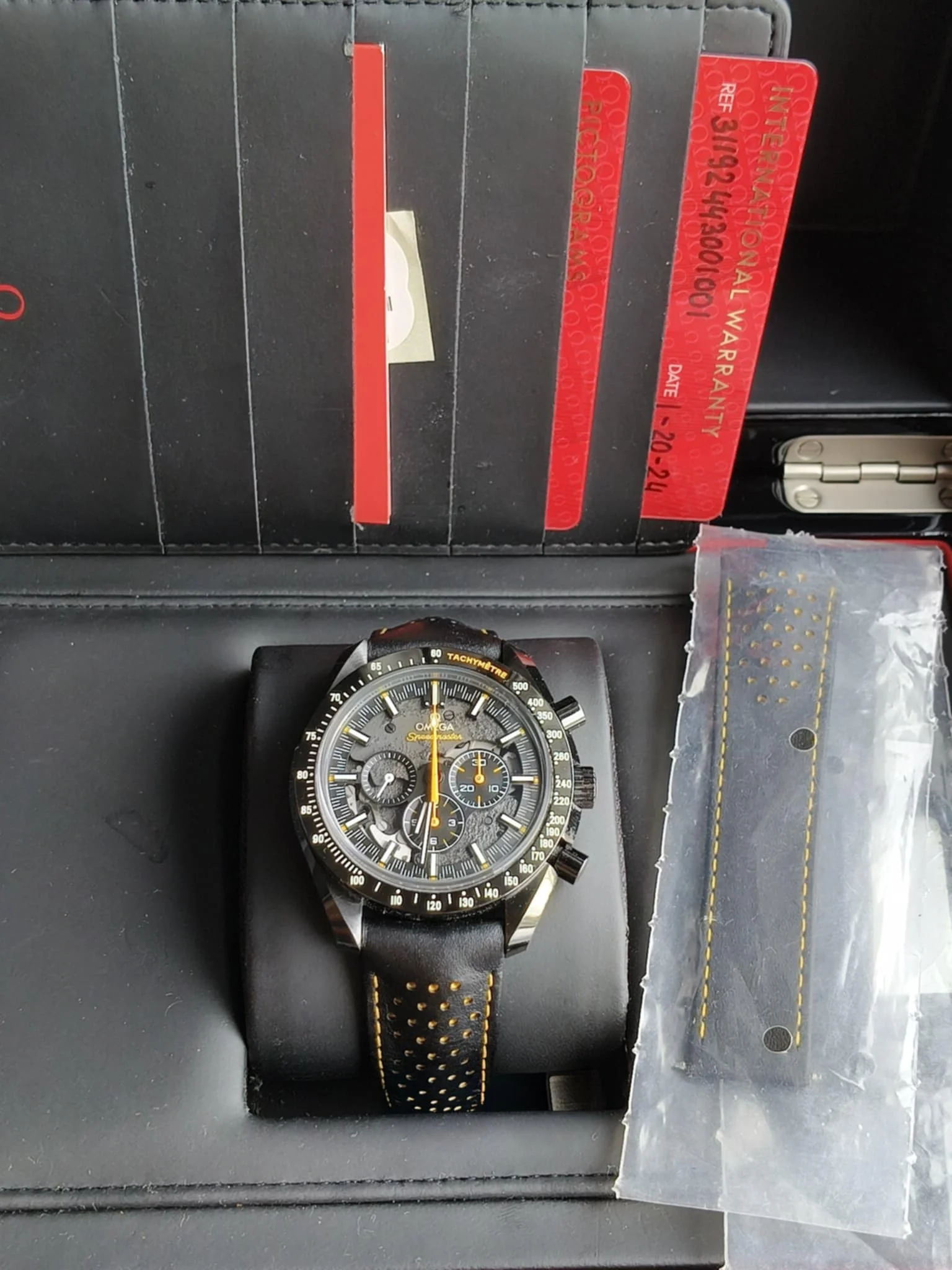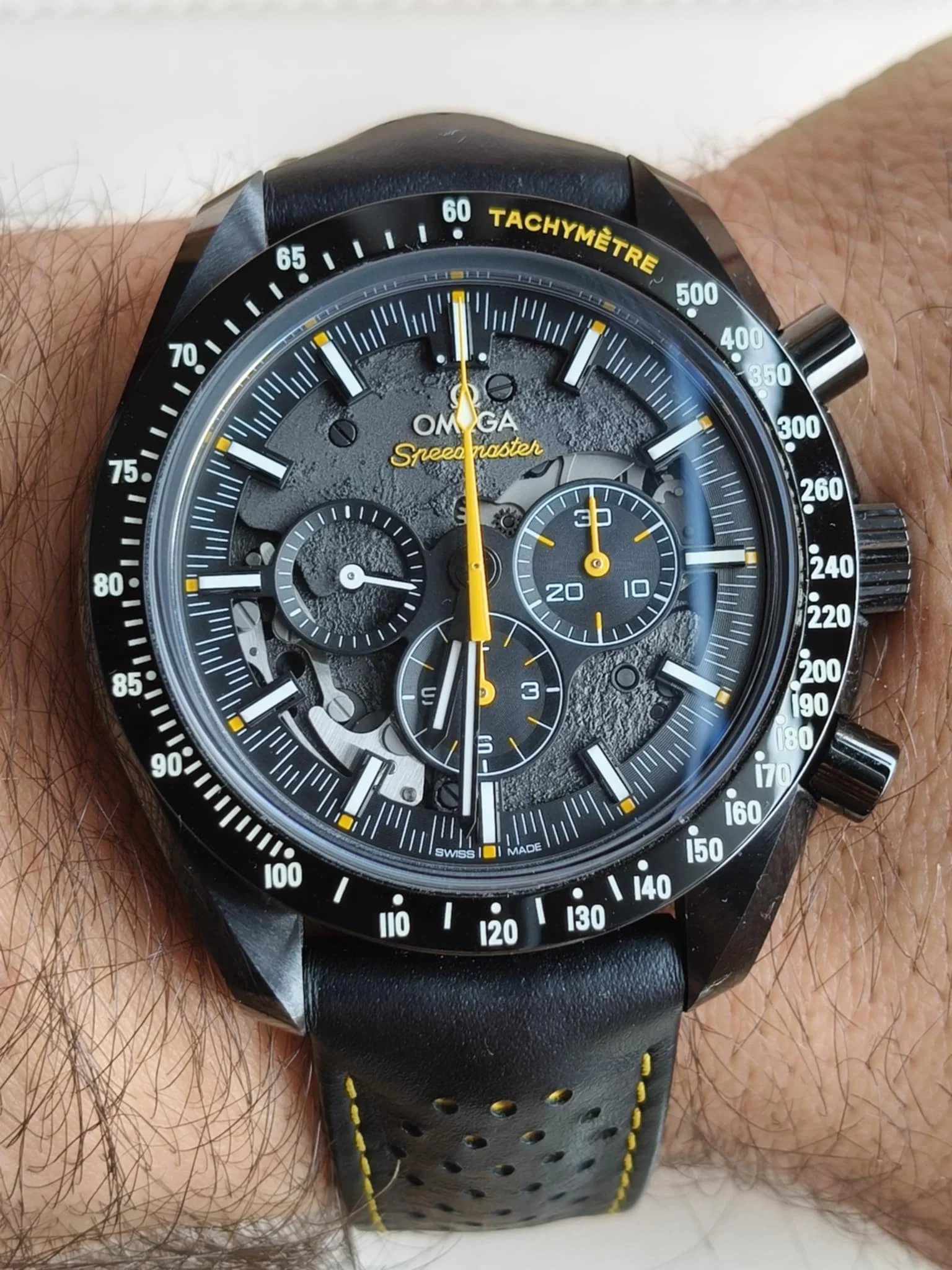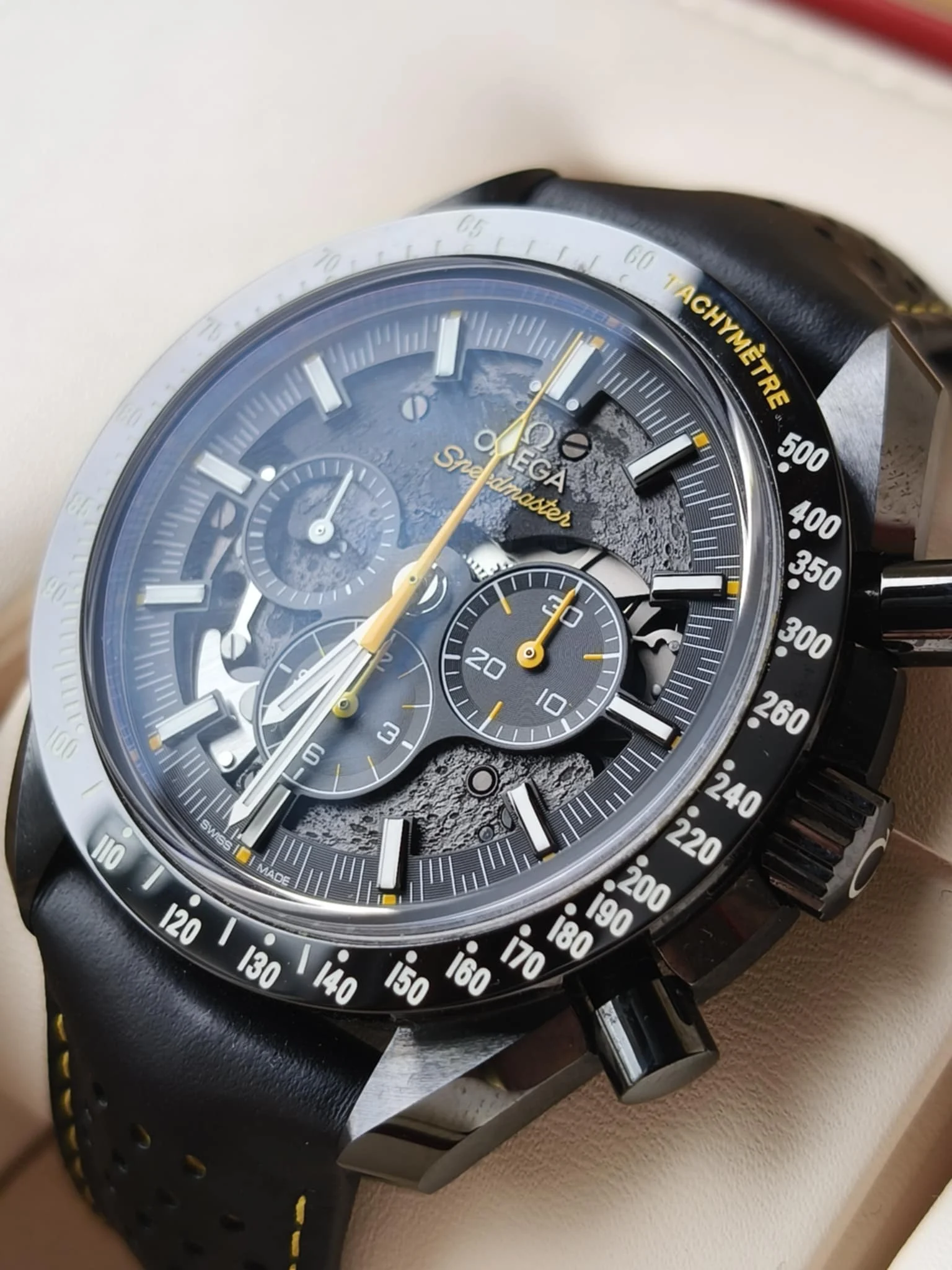 The watch features a lightweight, all-black ceramic case with a diameter of 44.25 mm, giving it a modern and distinctive character. The true work of art, however, is the skeletonized Omega caliber 1869 movement, hand-decorated to resemble the surface of the moon – its “dark side” on the dial side and the “light side” visible from the back through the transparent caseback.