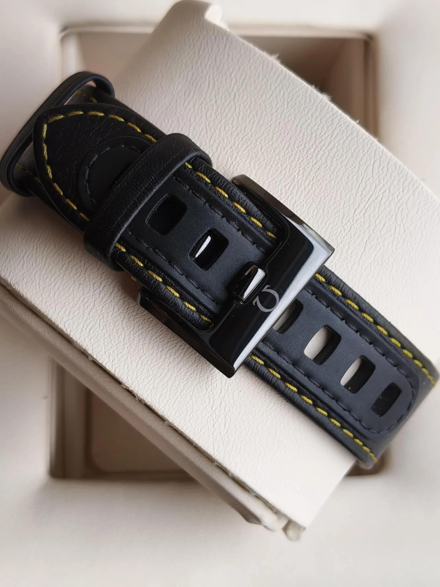 Contrasting yellow accents on the hands and chronograph scale give the watch a sporty, dynamic style, while the perforated leather strap with yellow lining underscores its unique character. This is not only a tribute to space pioneers but also a demonstration of the highest precision and watchmaking craftsmanship.