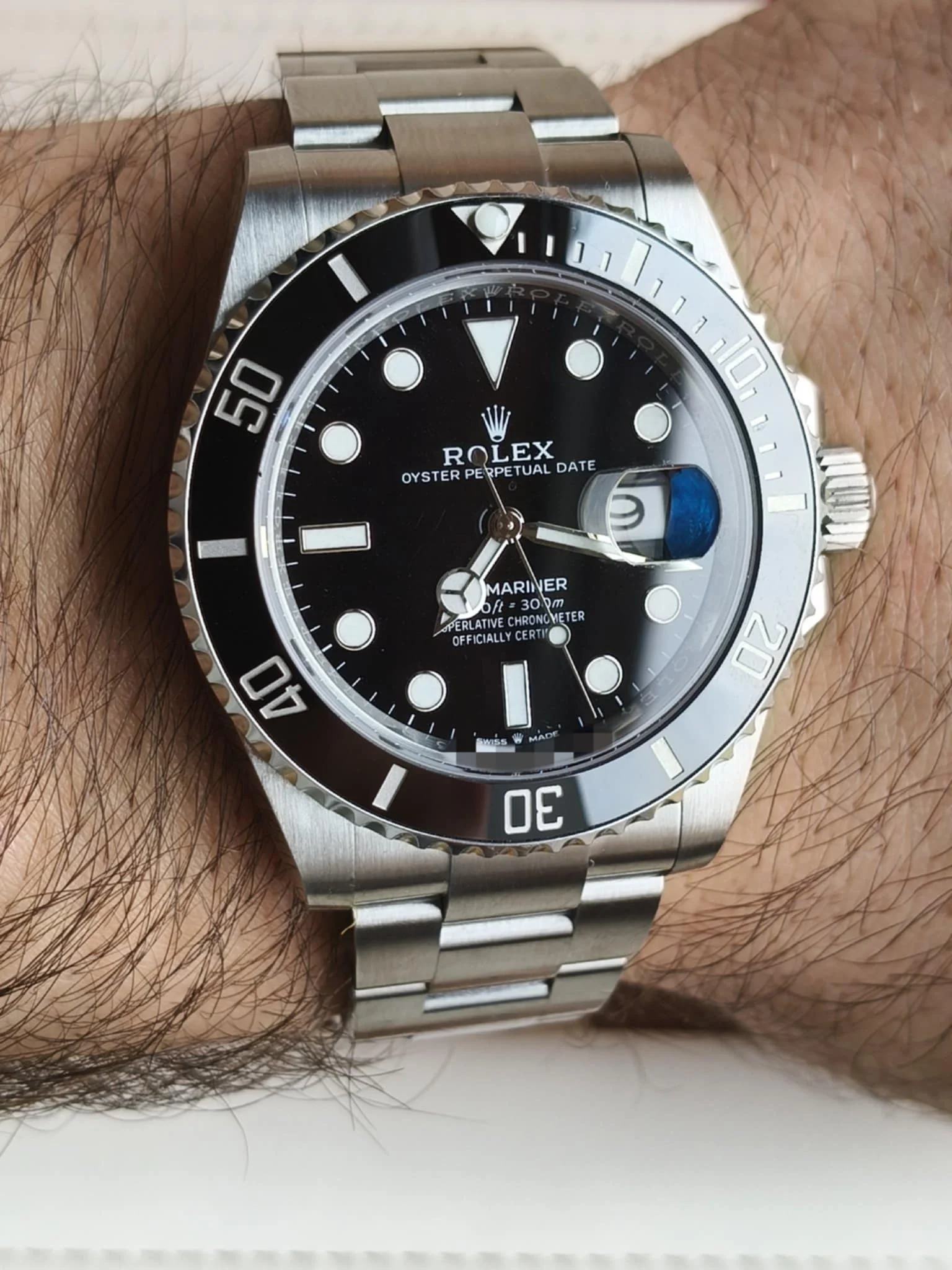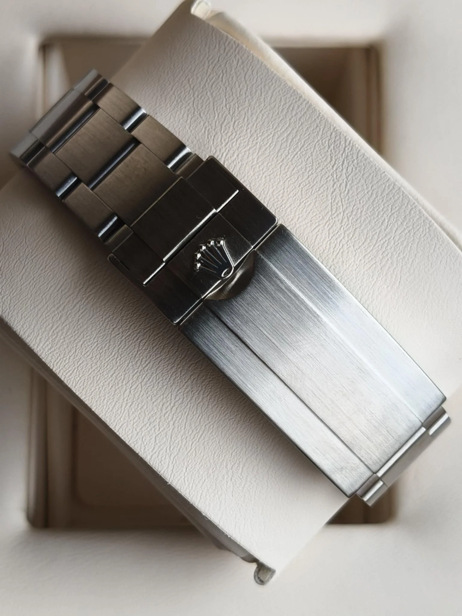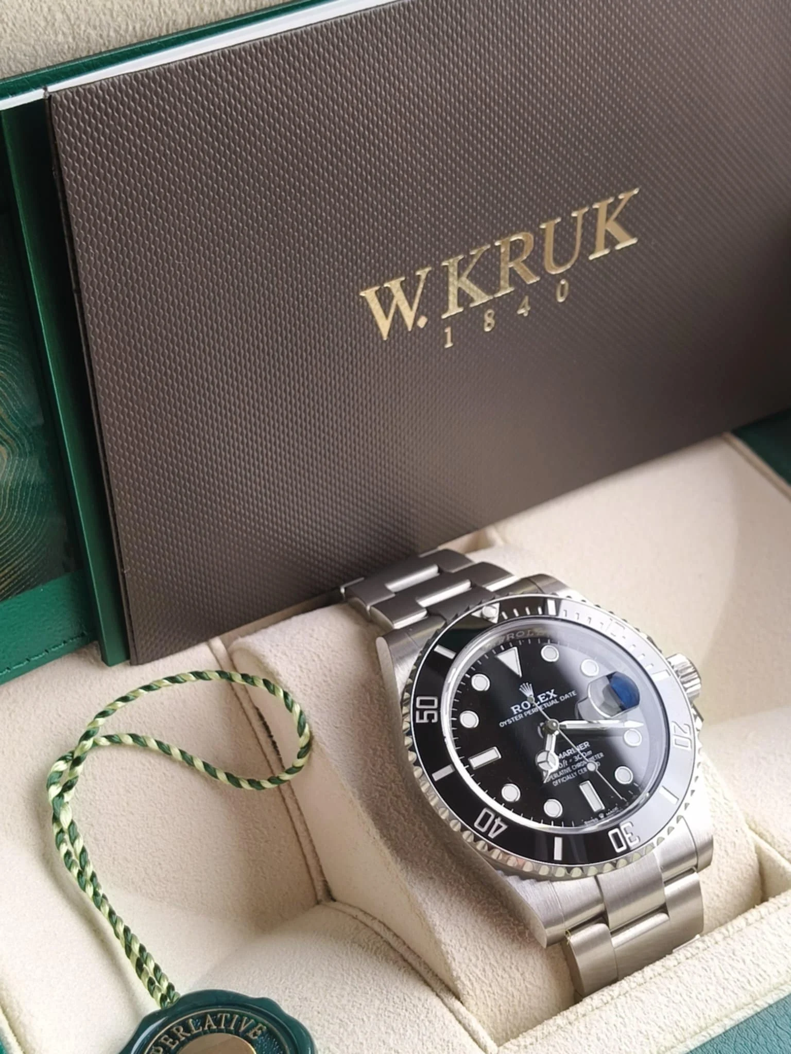 The Rolex Submariner 126610LN is an icon among diving watches, the quintessence of precision, durability and timeless elegance. Part of the prestigious Submariner collection, this legendary model has been designed for professional divers and underwater enthusiasts, without sacrificing the luxurious feel that Rolex is known for. The watch is distinguished by a 41 mm case made of proprietary Oystersteel, known for its exceptional resistance to corrosion and mechanical damage. The distinctive black bezel made of extremely hard Cerachrom ceramic, with a precisely engraved diving scale, harmonizes with the deep black of the dial, creating a classic yet modern look. The large indices and massive hands are coated with Chromalight luminescent substance, which provides long-lasting and intense glow-blue visibility in the dark – irreplaceable when diving in the depths. The 126610LN is powered by the advanced Rolex Calibre 3235 automatic movement, offering an impressive power reserve of up to 70 hours and Superlative Chronometer certification, confirming its exceptional precision and reliability. The Submariner offers professional water resistance up to 300 meters (30 bar), a unidirectional rotating bezel with non-slip milling, and a screw-down crown with a triple Triplock sealing system. The watch is mounted on a sturdy, sporty Oyster bracelet made of Oystersteel, equipped with a Glidelock extension system, allowing for precise length adjustment without the use of tools – even on a diving suit. The Rolex Submariner 126610LN is the perfect combination of functionality, reliability and luxury. This is a watch for those who expect the highest standards both underwater and on a daily basis – regardless of the occasion.