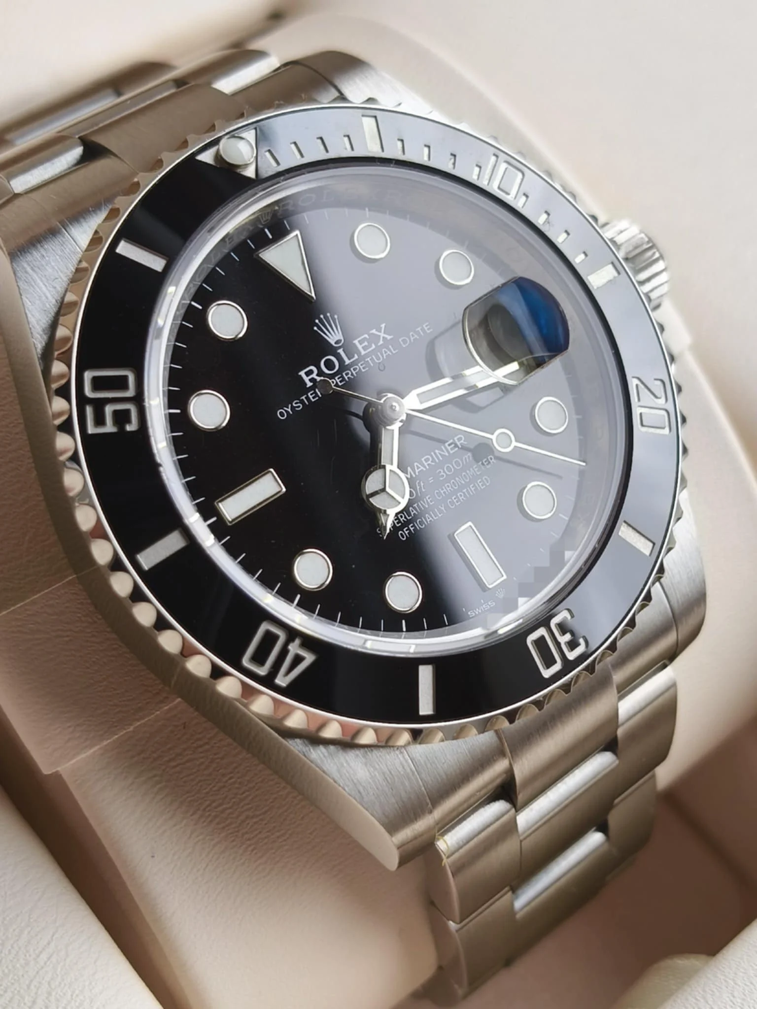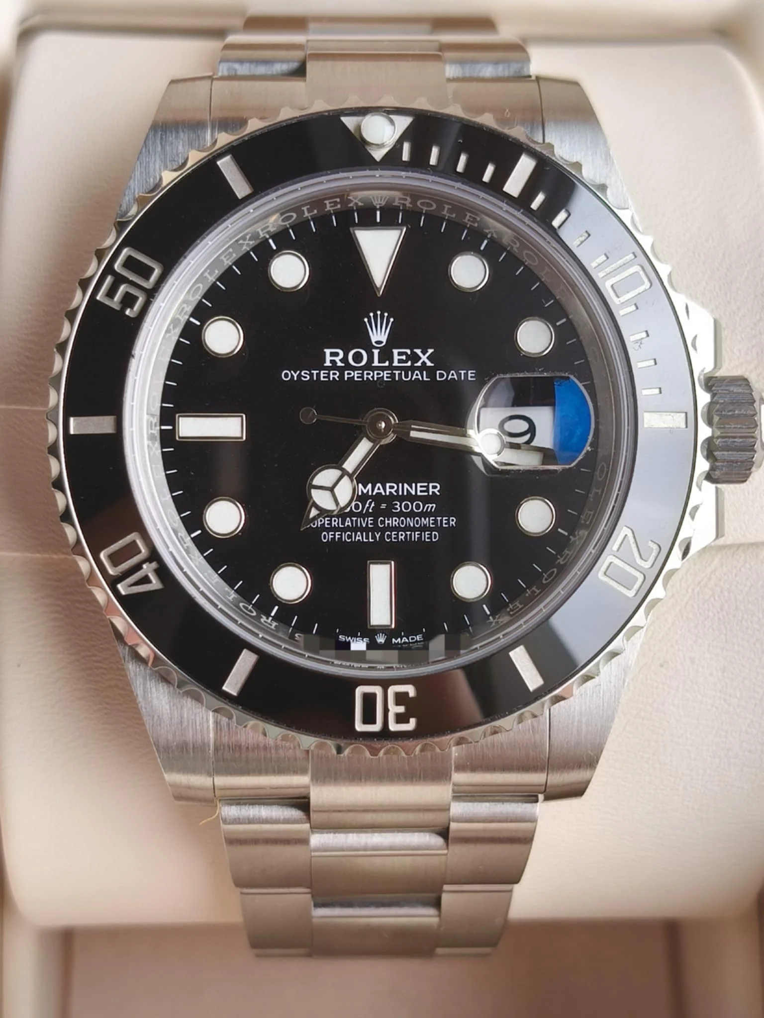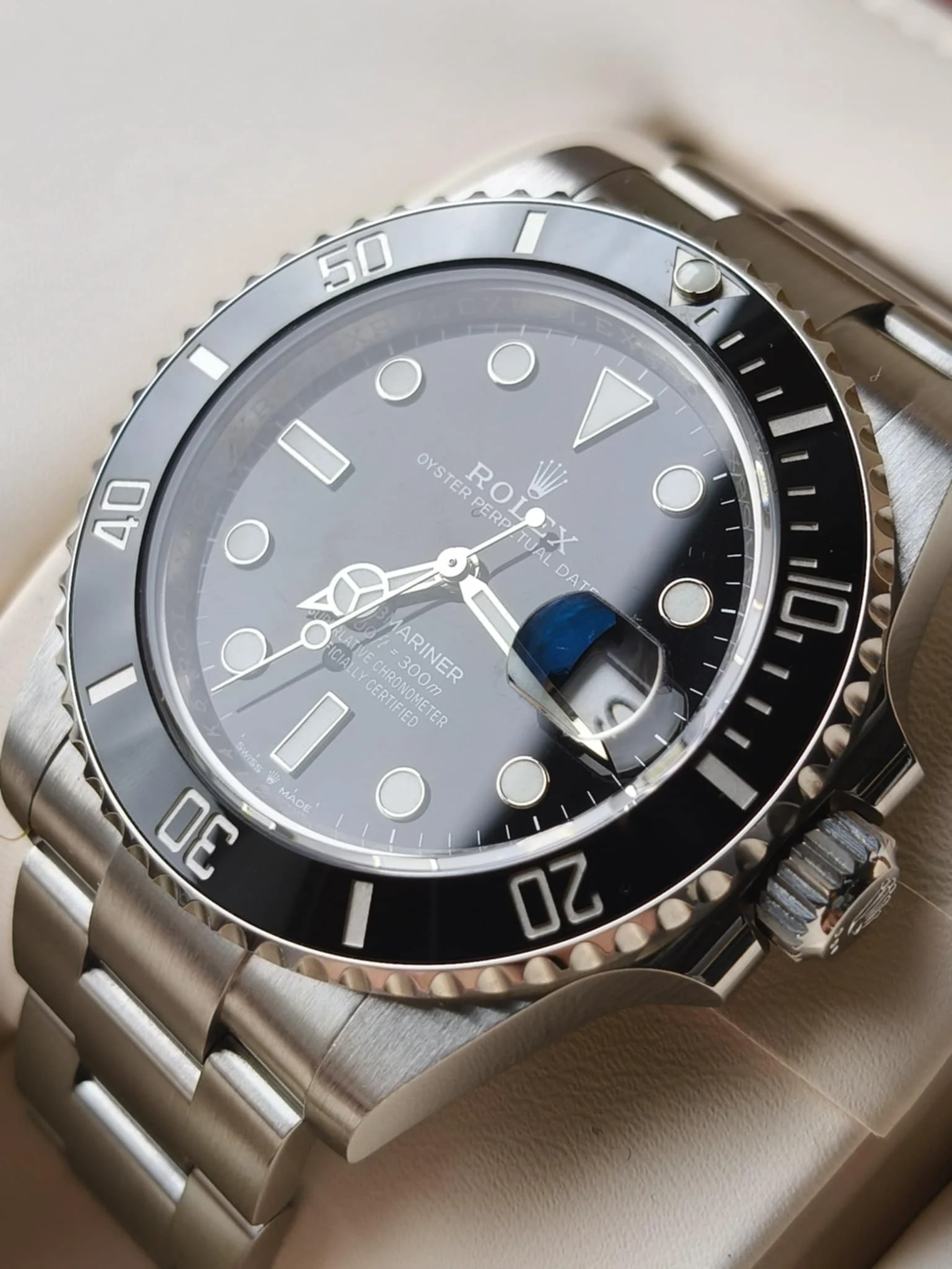 The Rolex Submariner 126610LN is an icon among diving watches, the quintessence of precision, durability and timeless elegance. Part of the prestigious Submariner collection, this legendary model has been designed for professional divers and underwater enthusiasts, without sacrificing the luxurious feel that Rolex is known for. The watch is distinguished by a 41 mm case made of proprietary Oystersteel, known for its exceptional resistance to corrosion and mechanical damage. The distinctive black bezel made of extremely hard Cerachrom ceramic, with a precisely engraved diving scale, harmonizes with the deep black of the dial, creating a classic yet modern look. The large indices and massive hands are coated with Chromalight luminescent substance, which provides long-lasting and intense glow-blue visibility in the dark – irreplaceable when diving in the depths. The 126610LN is powered by the advanced Rolex Calibre 3235 automatic movement, offering an impressive power reserve of up to 70 hours and Superlative Chronometer certification, confirming its exceptional precision and reliability. The Submariner offers professional water resistance up to 300 meters (30 bar), a unidirectional rotating bezel with non-slip milling, and a screw-down crown with a triple Triplock sealing system. The watch is mounted on a sturdy, sporty Oyster bracelet made of Oystersteel, equipped with a Glidelock extension system, allowing for precise length adjustment without the use of tools – even on a diving suit. The Rolex Submariner 126610LN is the perfect combination of functionality, reliability and luxury. This is a watch for those who expect the highest standards both underwater and on a daily basis – regardless of the occasion.