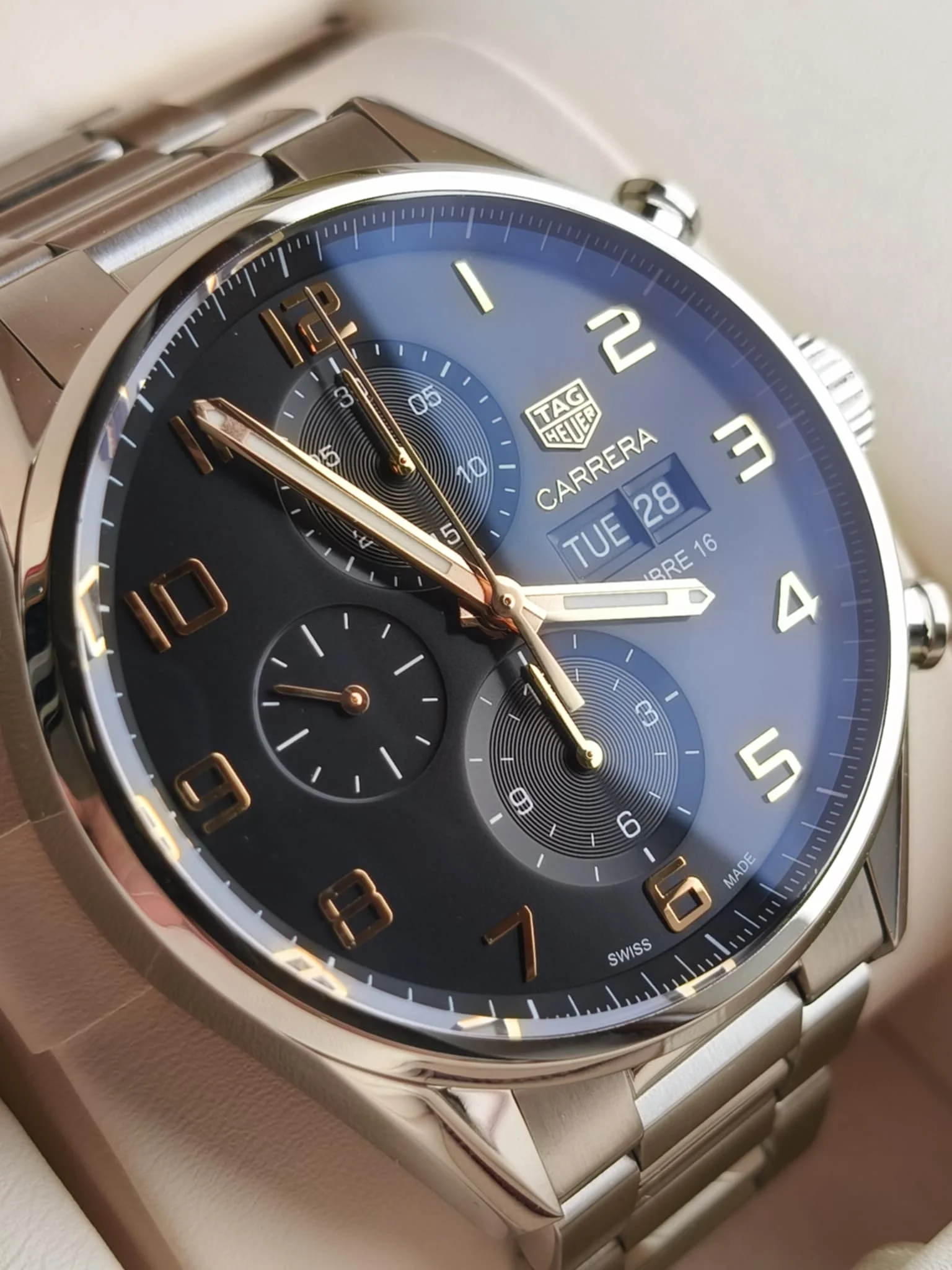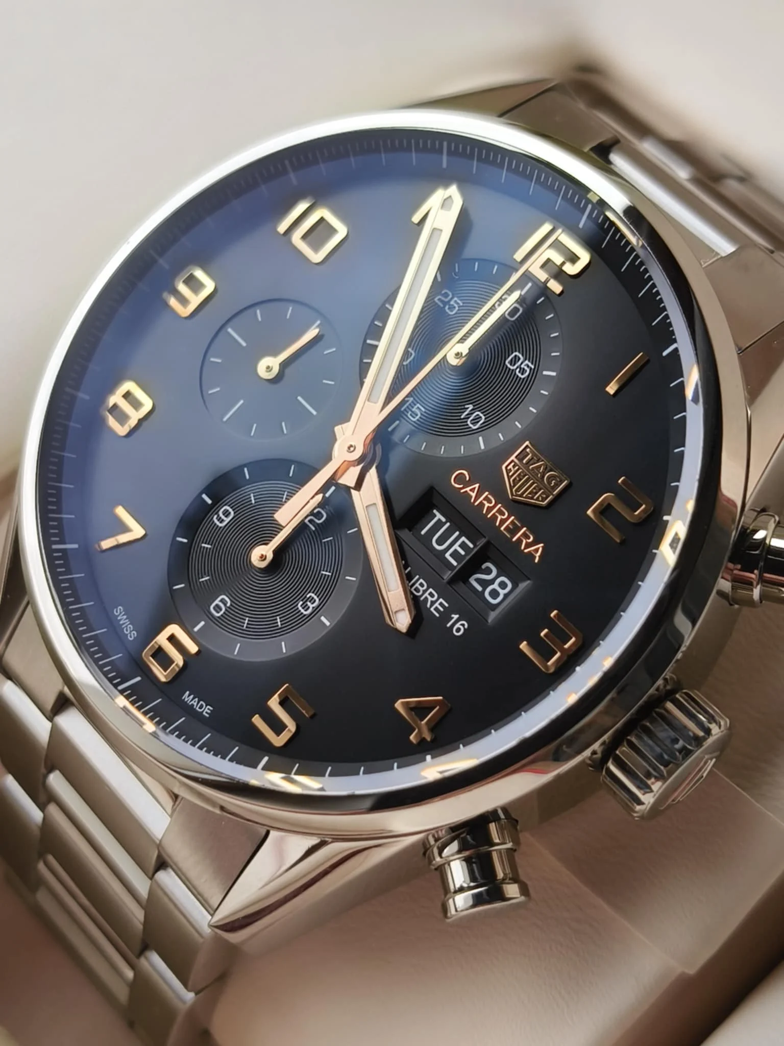 TAG Heuer Carrera CV2A1AB. The BA0738 is a dynamic chronograph created for motorsport enthusiasts who value the combination of racing spirit with elegant, masculine aesthetics. This model belongs to the iconic Carrera collection, inspired by the legendary Carrera Panamericana race and identified for years with precision, speed and pure design. The watch is distinguished by a case with a diameter of 43 mm, made of polished and brushed stainless steel, which, thanks to its solid construction and expressive lines, looks extremely modern and sporty. The black sunray dial with contrasting white details and red accents underlines its racing DNA, while offering excellent legibility and a dynamic character. The model is equipped with three chronograph sub-dials and a date window with the day of the week and the date at three o’clock – a practical and functional solution that does not disturb the coherent composition of the dial. Large indices and skeletal hands covered with Super-LumiNova® ensure perfect visibility in all conditions. At the heart of the watch is the Calibre 16 automatic movement, based on the proven Valjoux 7750 design, offering up to 42 hours of power reserve and precise operation even in the most dynamic situations. Through the glazed sapphire glass caseback, you can admire the operation of the mechanism – a real treat for watchmaking enthusiasts. Model CV2A1AB. The BA0738 offers a water resistance of up to 100 meters (10 bar), making it suitable for both the racetrack and everyday use. The watch is mounted on a stainless steel bracelet with a secure butterfly clasp and release buttons, guaranteeing comfort and confidence. TAG Heuer Carrera CV2A1AB. The BA0738 is a watch for men with passion – those who live fast but classy. It’s a great choice for those looking for a strong, reliable chronograph that looks just as good behind the wheel as it does in the office.