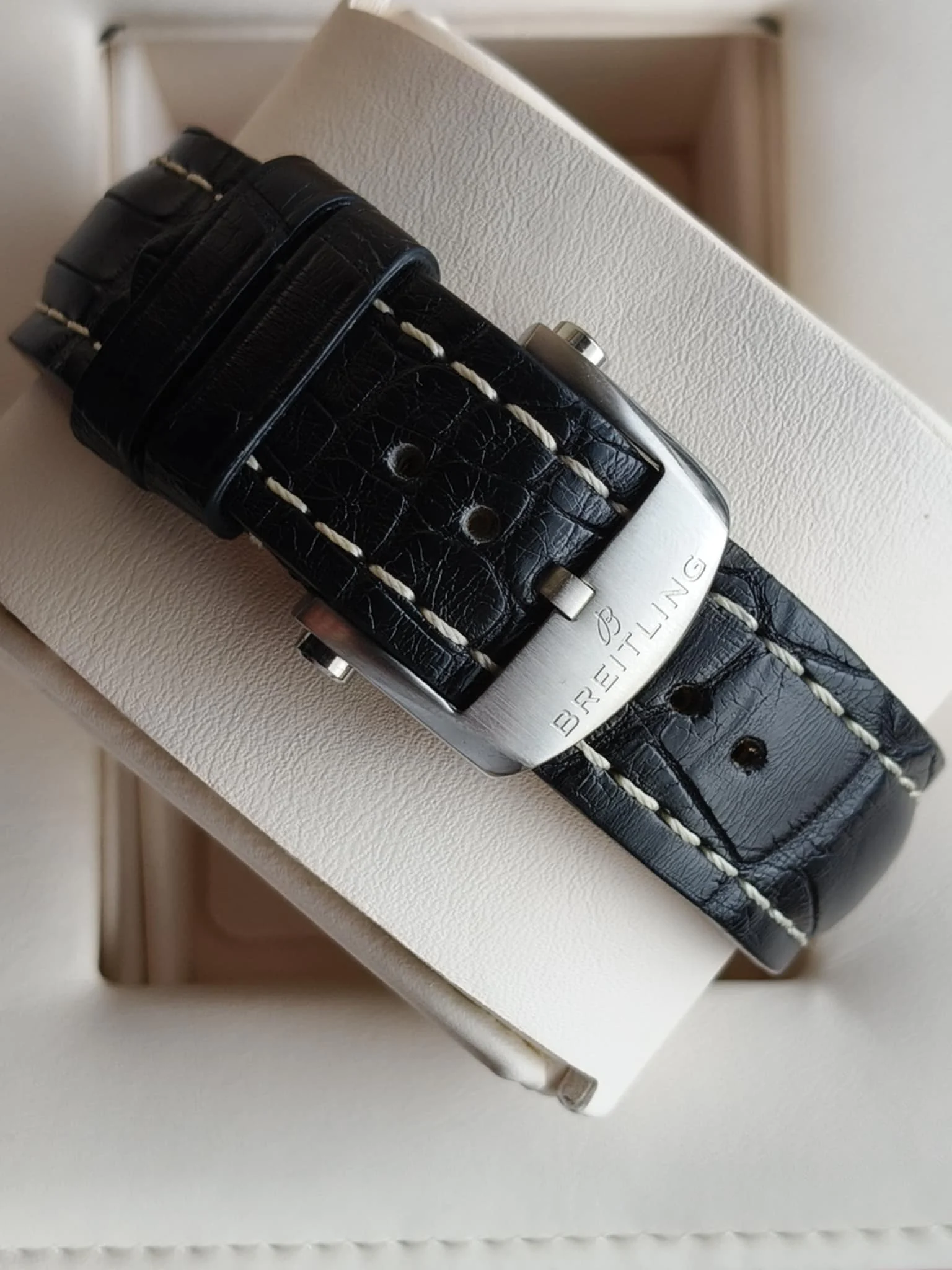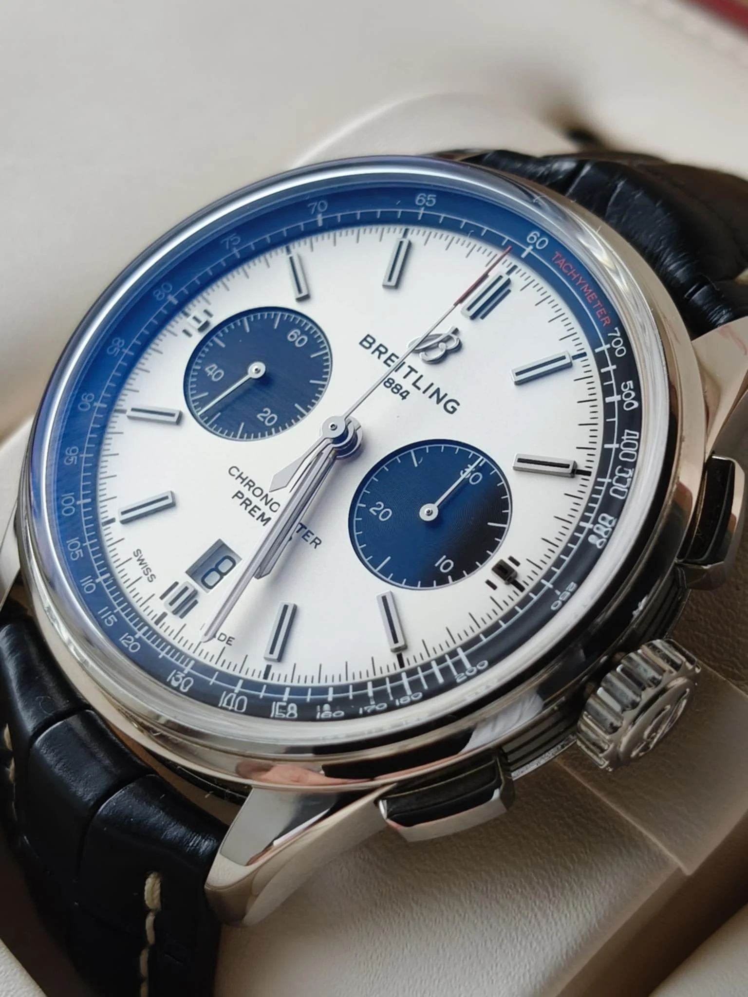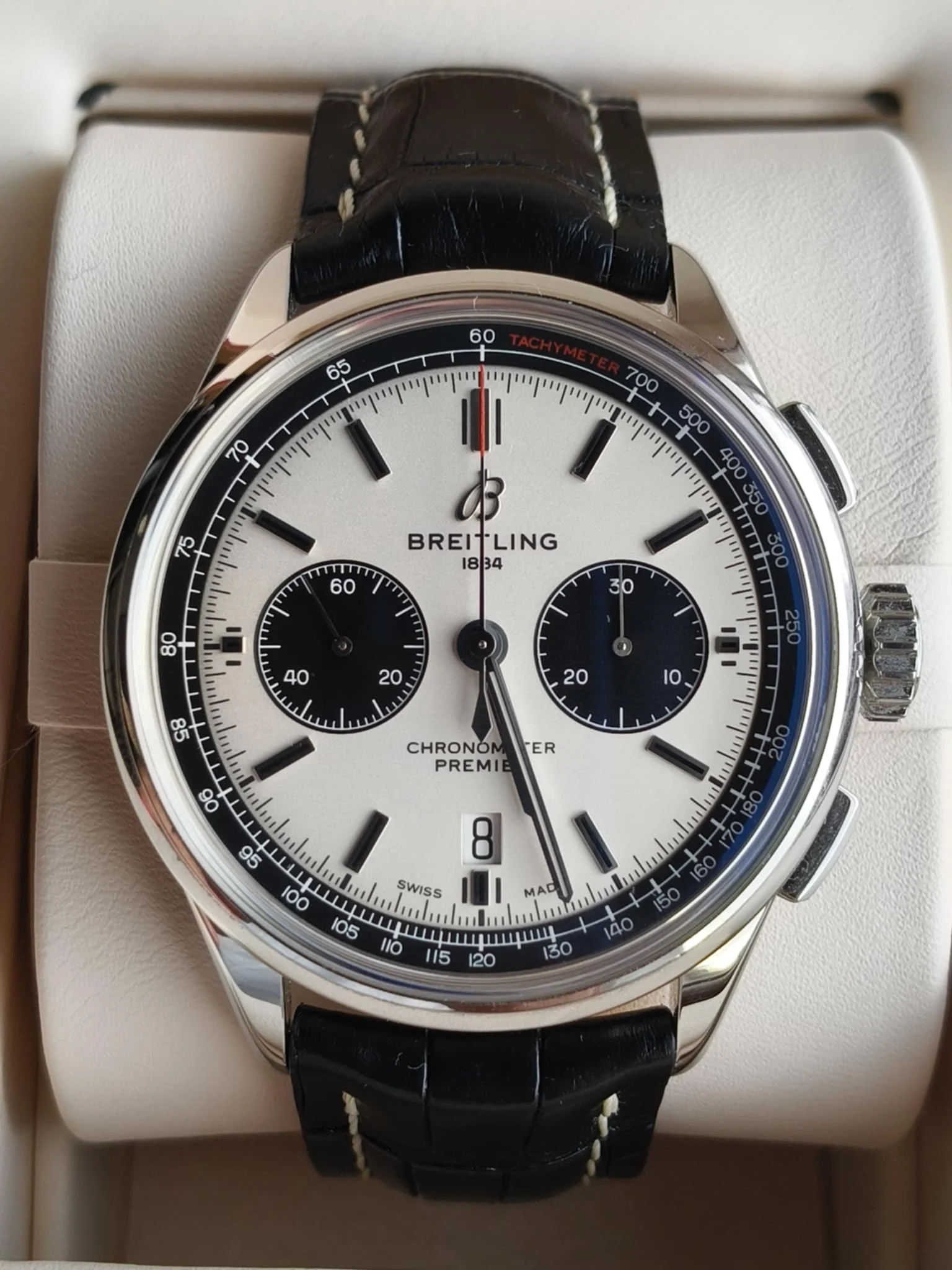 The Breitling Premier B01 Chronograph AB0118221G1P1 is a refined interpretation of an elegant chronograph. Its refined 42mm stainless steel case houses the advanced, COSC-certified in-house B01 movement. The white dial with black subdials creates a classic look, reminiscent of historic chronographs from the 1960s. The distinctive ribbed case sides and slim chronograph pushers underline the model’s elegant character. A see-through caseback allows for admiring the precisely finished movement with its distinctive red column wheel. Water resistance to 100 meters and an elegant green alligator leather strap complete the refined character of this timepiece. This is the perfect choice for those who appreciate the combination of classic elegance and modern watchmaking technique.