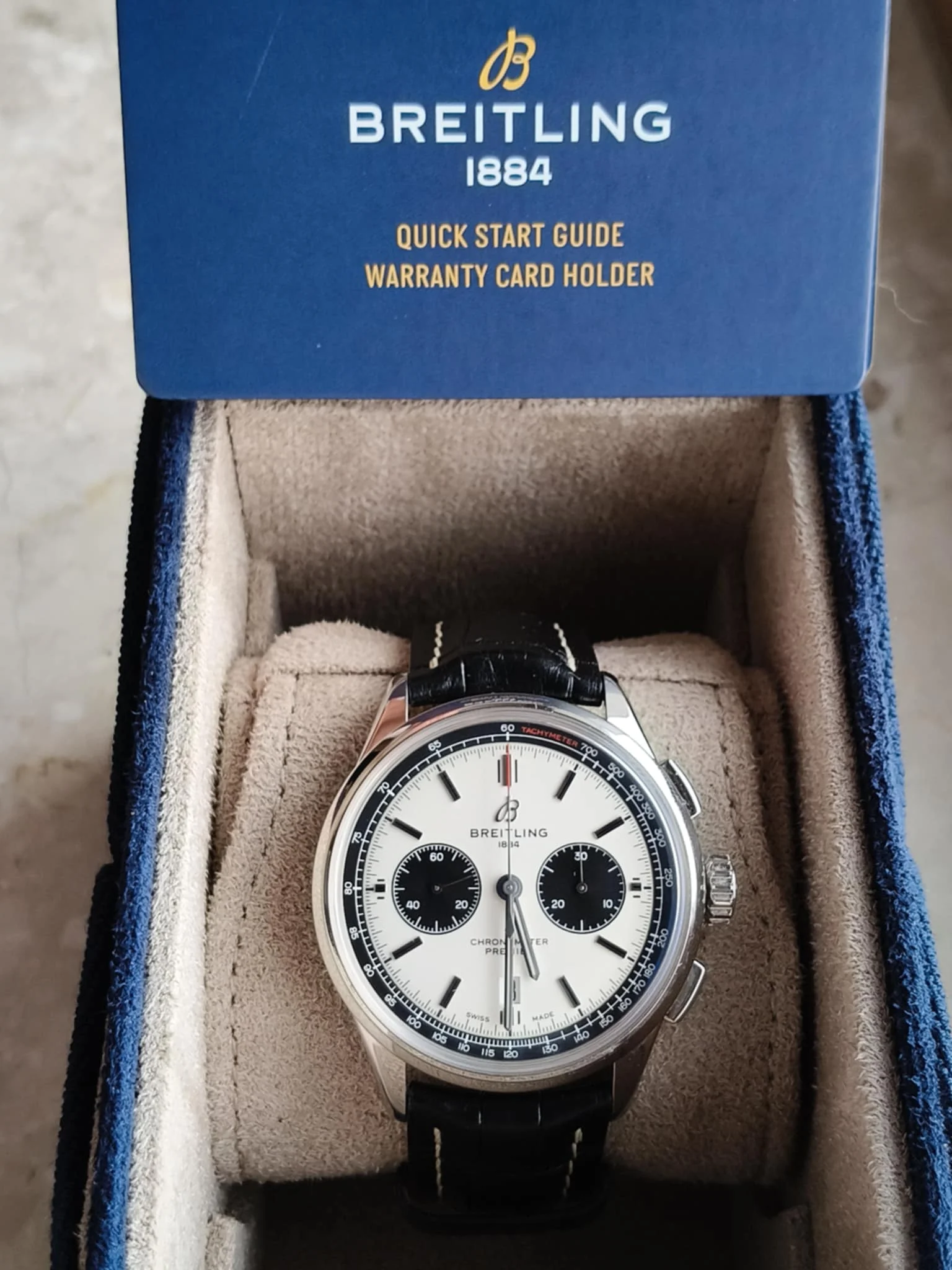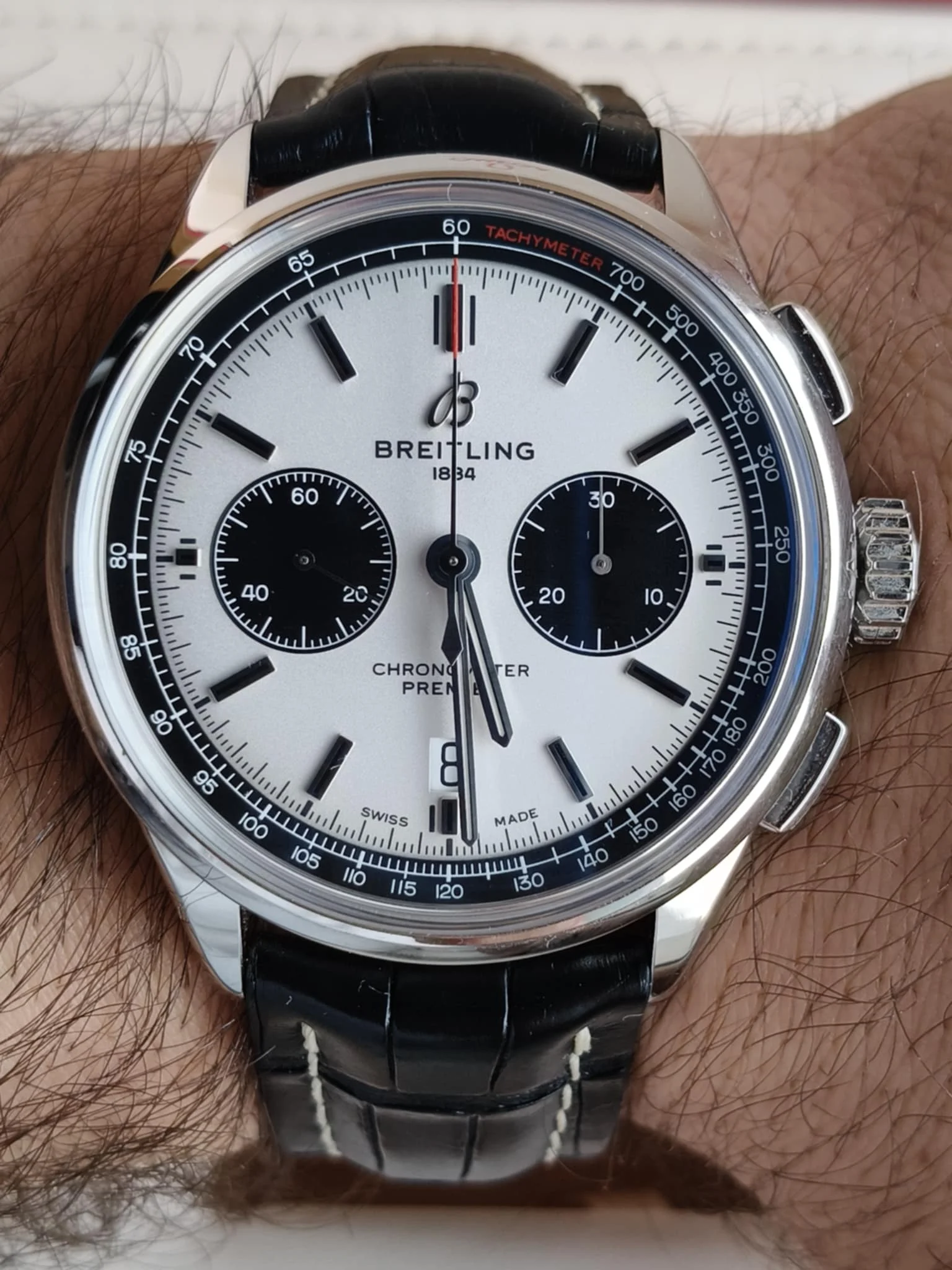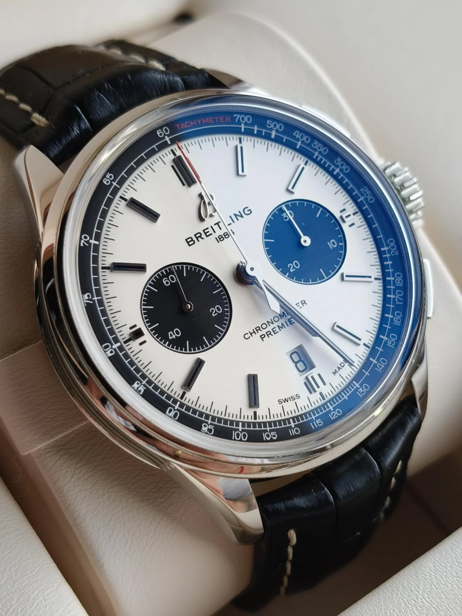 The Breitling Premier B01 Chronograph AB0118221G1P1 is a refined interpretation of an elegant chronograph. Its refined 42mm stainless steel case houses the advanced, COSC-certified in-house B01 movement. The white dial with black subdials creates a classic look, reminiscent of historic chronographs from the 1960s. The distinctive ribbed case sides and slim chronograph pushers underline the model’s elegant character. A see-through caseback allows for admiring the precisely finished movement with its distinctive red column wheel. Water resistance to 100 meters and an elegant green alligator leather strap complete the refined character of this timepiece. This is the perfect choice for those who appreciate the combination of classic elegance and modern watchmaking technique.