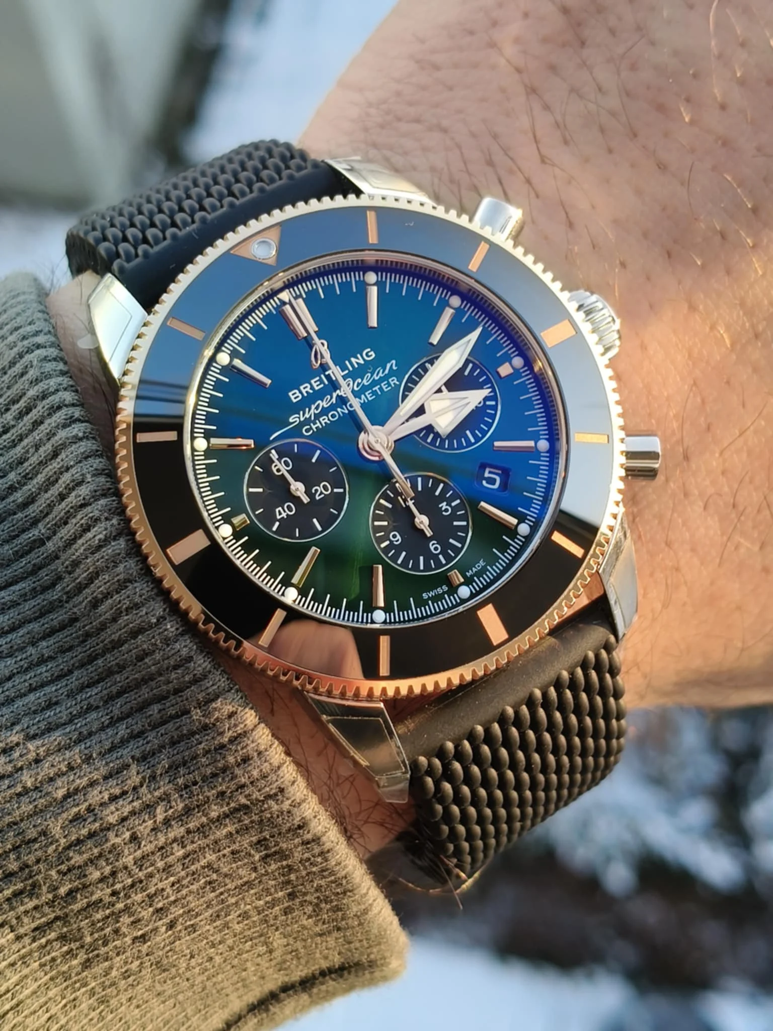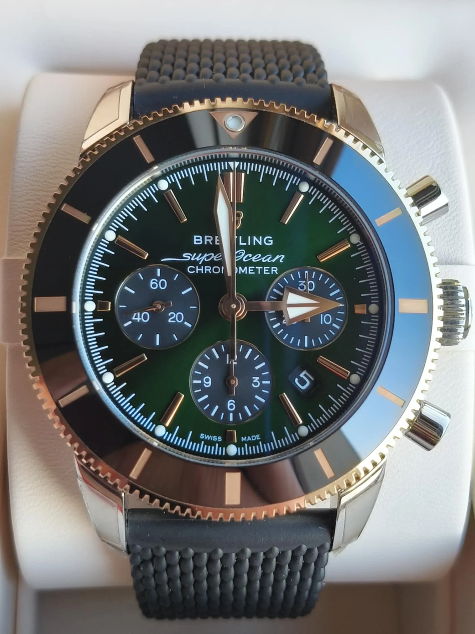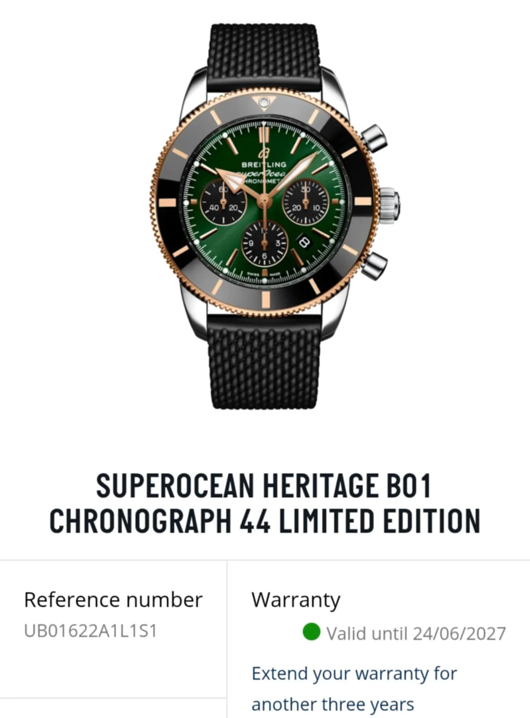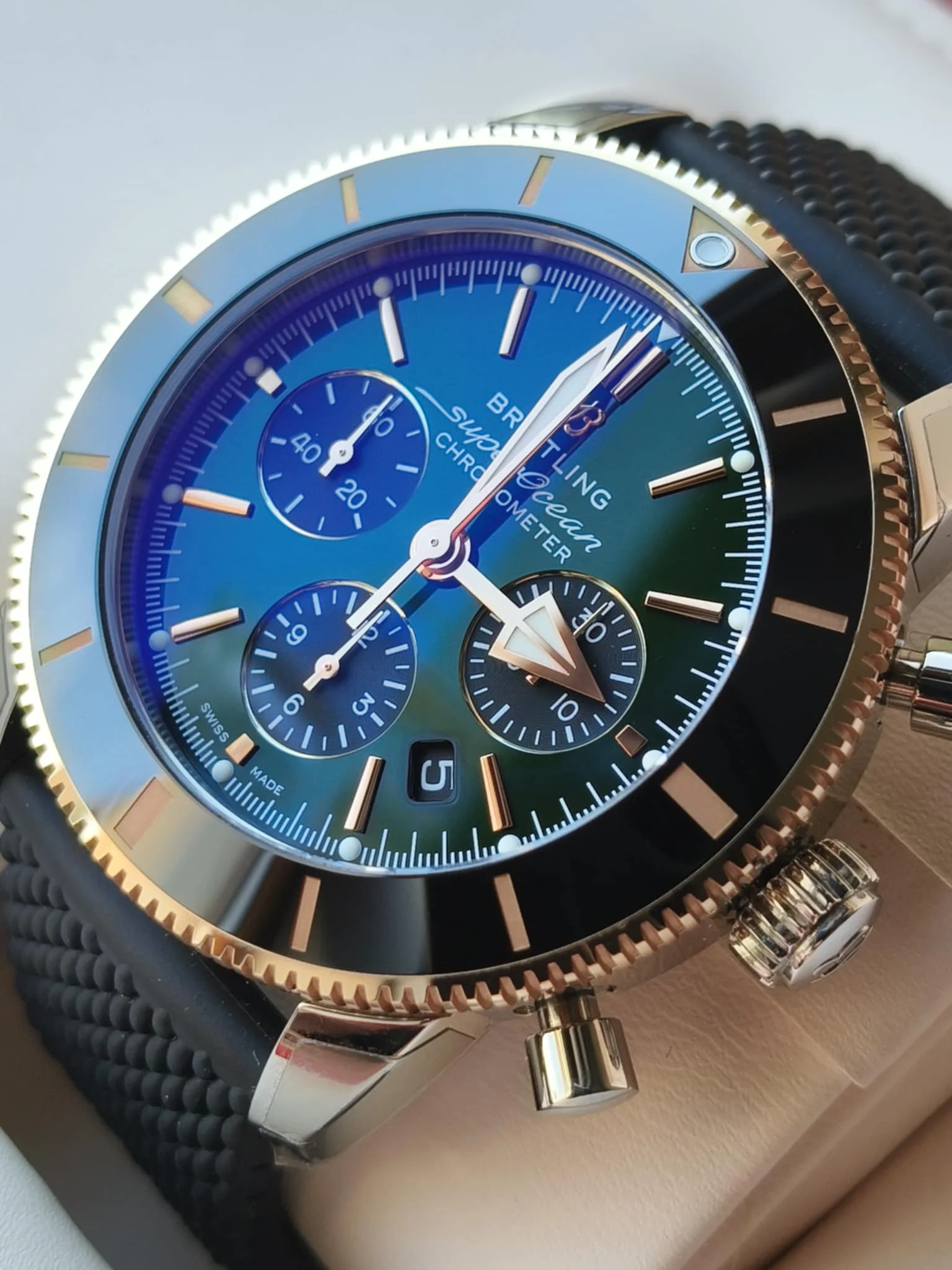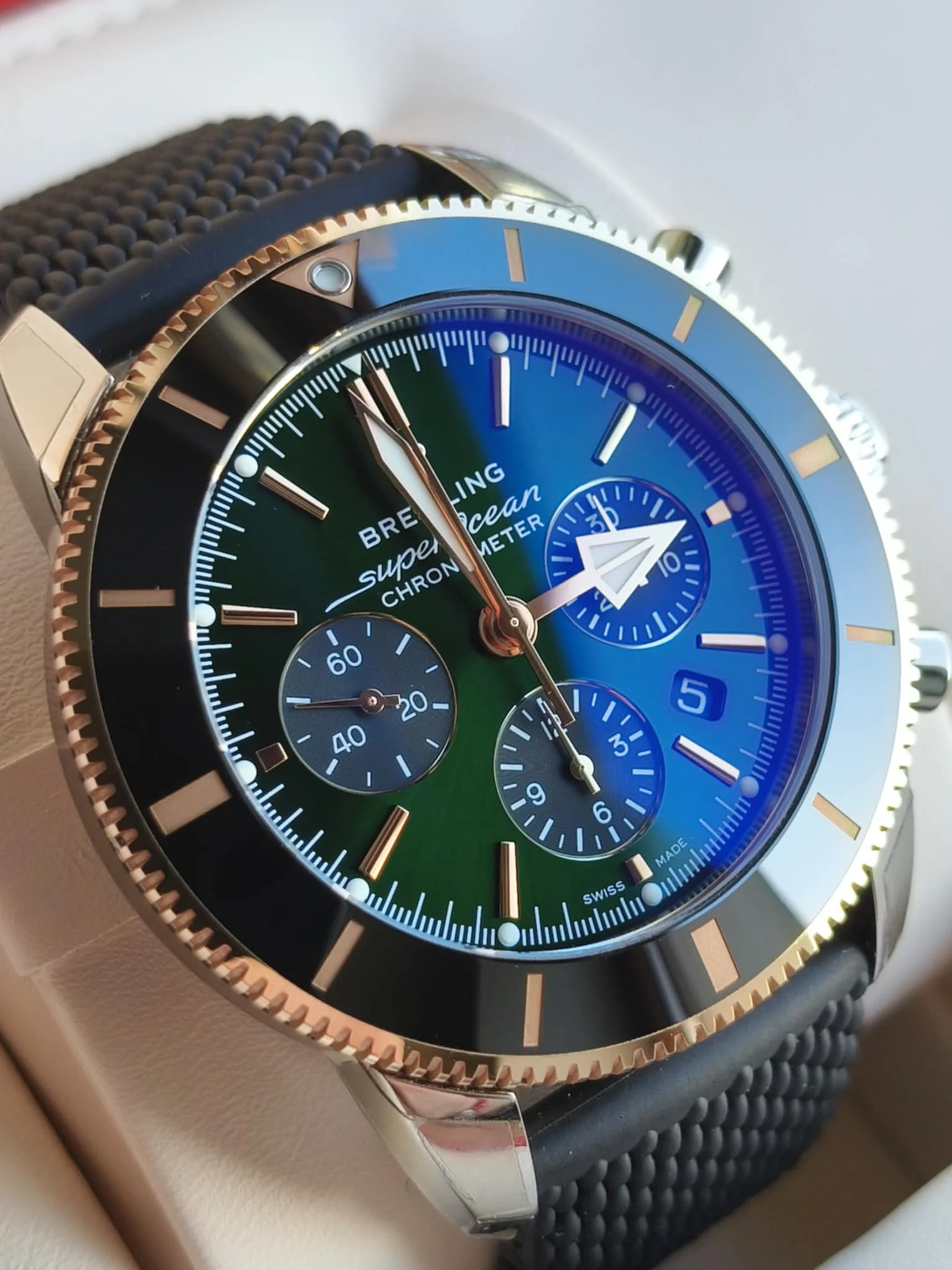The Breitling Superocean Heritage B01 Chronograph 44 (UB01622A1L1S1) is an exclusive limited edition luxury diving chronograph, created for connoisseurs looking for rare and expressive models. The 44 mm case made of stainless steel and 18 ct red gold creates a prestigious, two-tone combination, emphasizing the unique character of the watch. The deep green dial with contrasting chronograph sub-dials and gold details gives the whole thing a modern yet noble look.