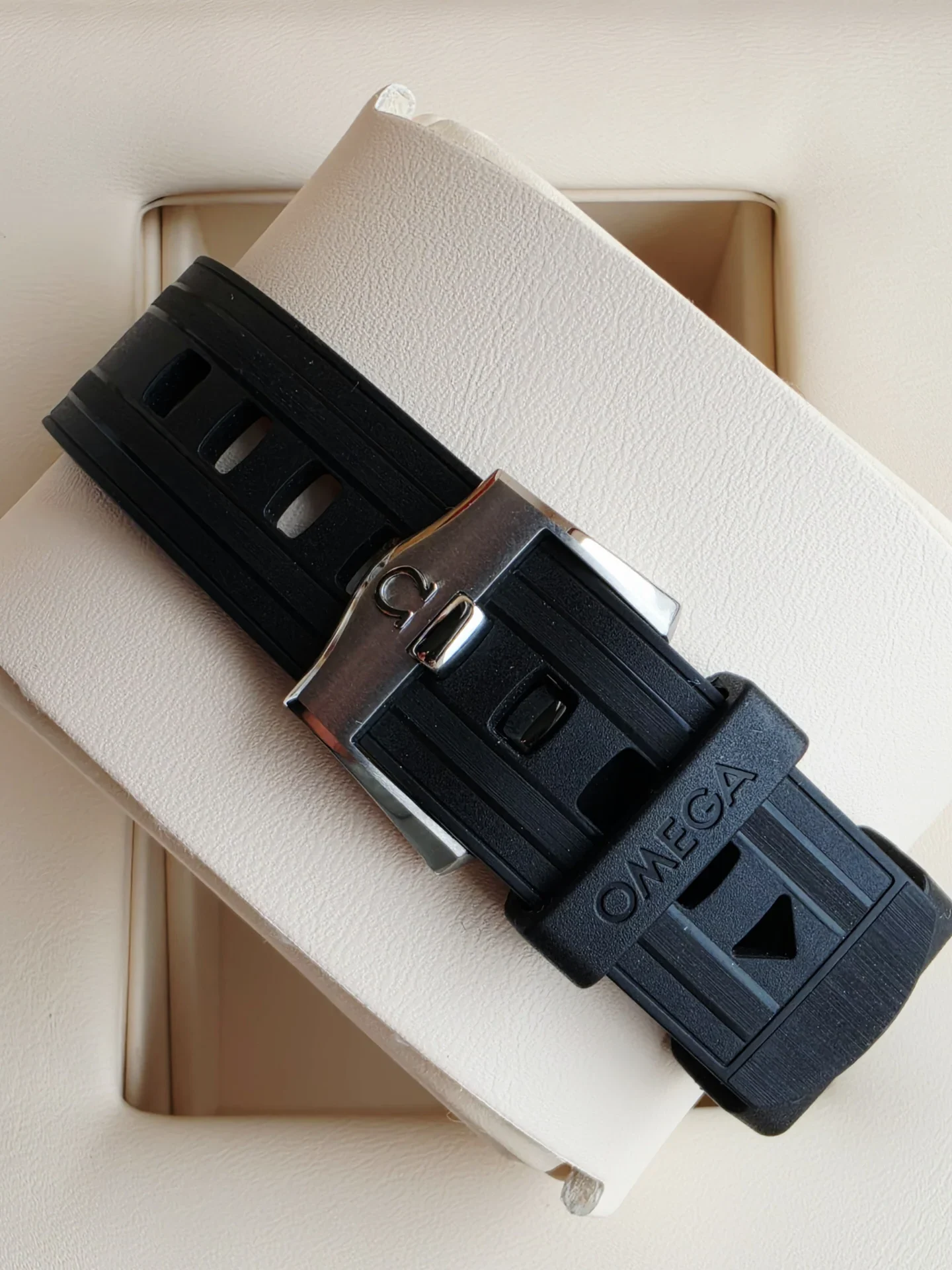 The watch is fitted with an elegant black rubber strap that highlights the model’s sporty character while ensuring wearing comfort. Water resistance up to 300 meters makes the Seamaster 300M Chronograph just as functional underwater as it is striking on land.