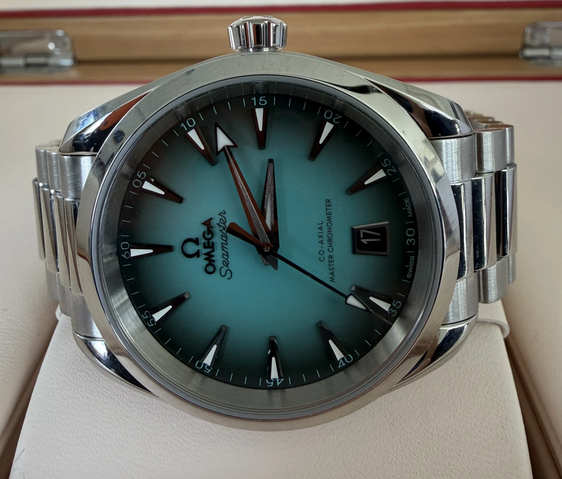 The Aqua Terra model 220.10.38.20.03.005 also stands out with an impressive water resistance of up to 150 meters, making it an ideal companion for both urban activities and encounters with water. Through the sapphire crystal caseback, one can admire the meticulously finished movement, adorned with the characteristic Côtes de Genève arabesque pattern.