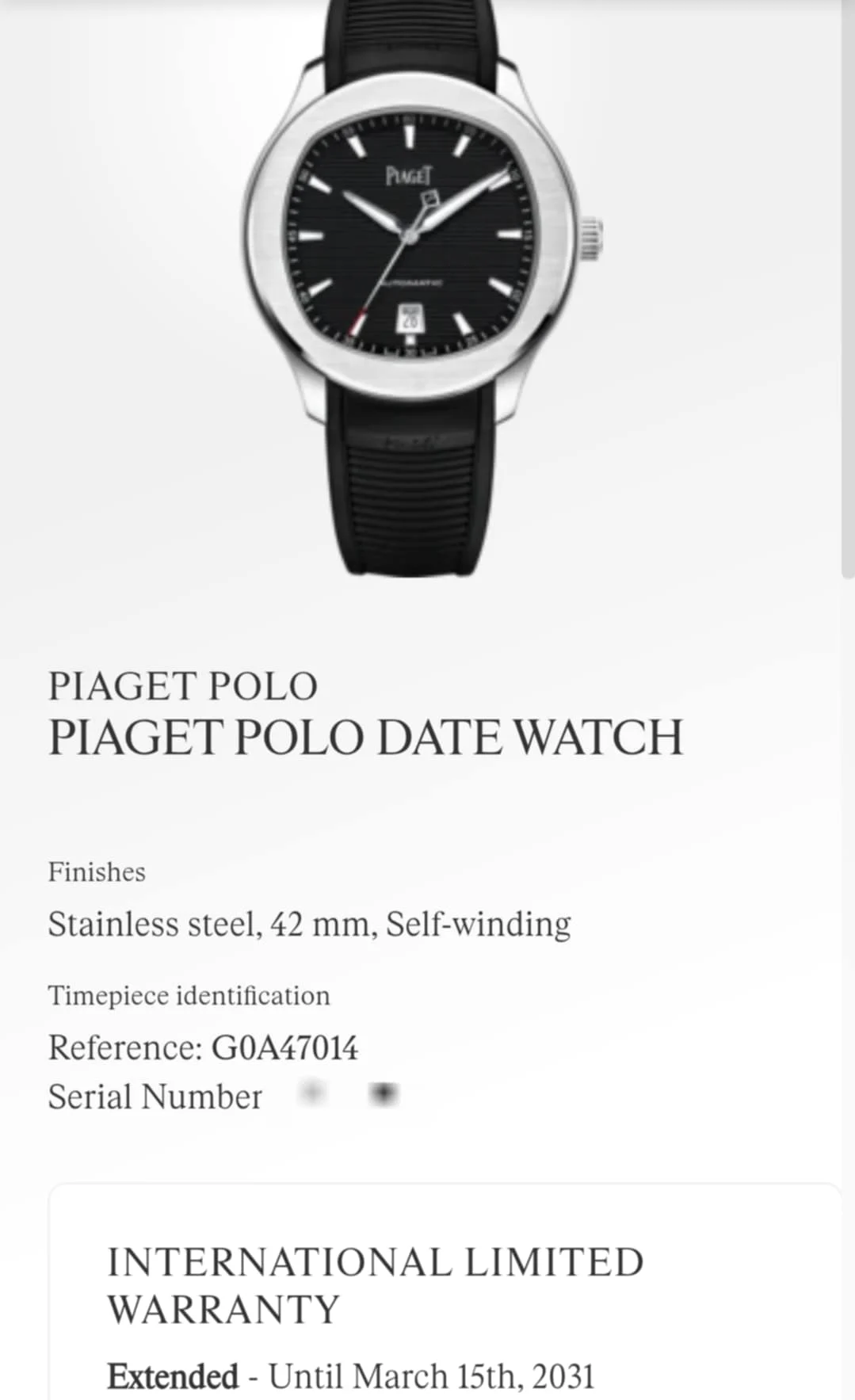 The Piaget Polo Date G0A47014 is a perfect choice for those who appreciate refined details and sporty elegance with a modern twist. Its distinctive black dial gives this model a dynamic yet luxurious look. Its precise movement, exquisite finish, and unmistakable Piaget styling make this watch perfect for both everyday wear and more formal occasions. It’s an ideal choice for both seasoned collectors and those just beginning their journey into the world of prestigious watches.