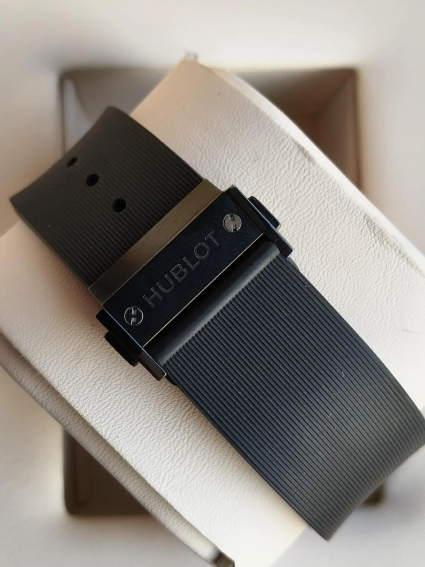 Zegarek osadzono na charakterystycznym pasku z gumy, wykończonym delikatną strukturą i podszytym dla maksymalnego komfortu noszenia. Elastyczny, odporny i perfekcyjnie dopasowujący się do nadgarstka pasek podkreśla sportowo-luksusowy charakter modelu, czyniąc go idealnym towarzyszem zarówno do eleganckiego garnituru, jak i nowoczesnego, casualowego stylu.