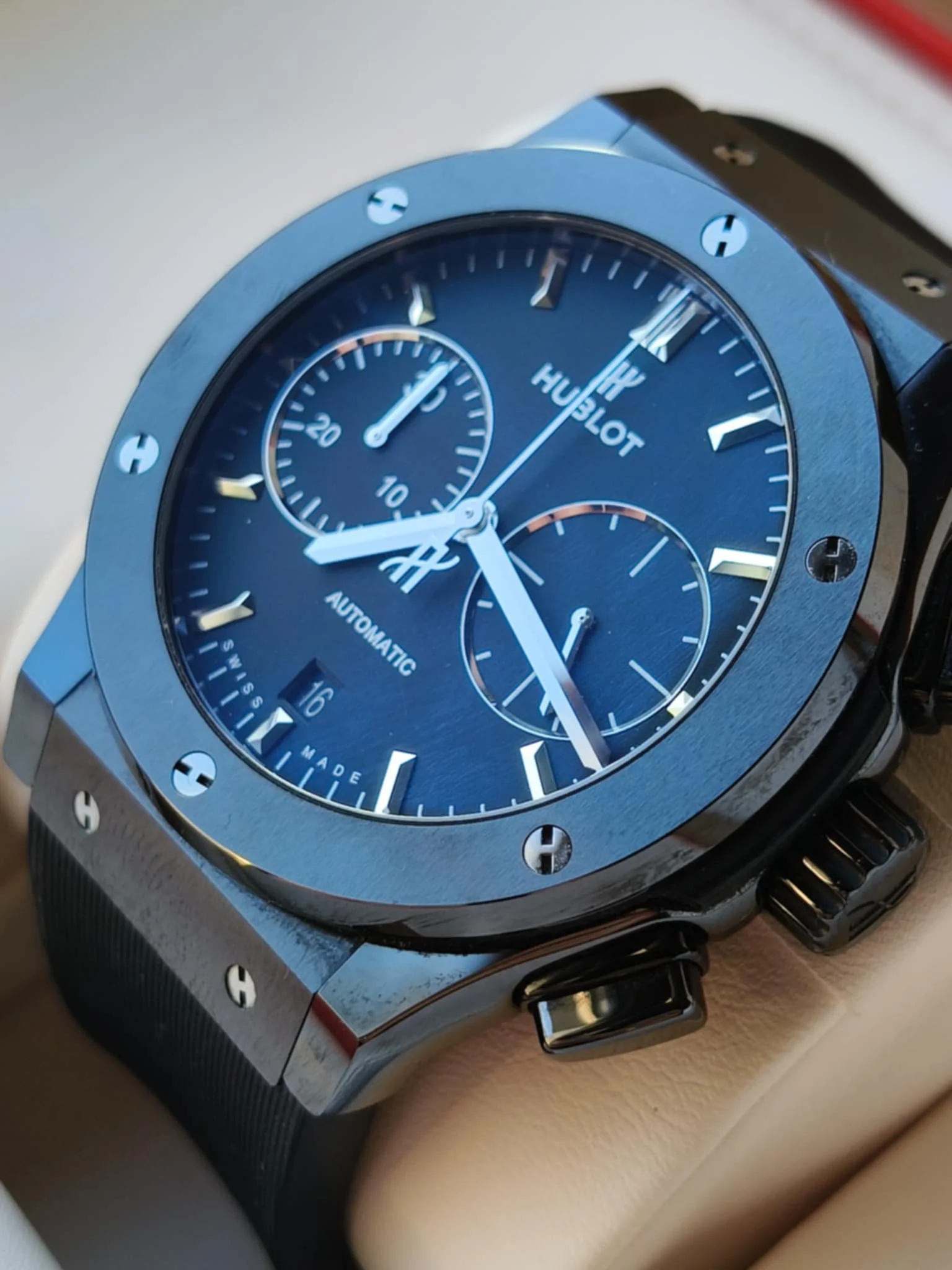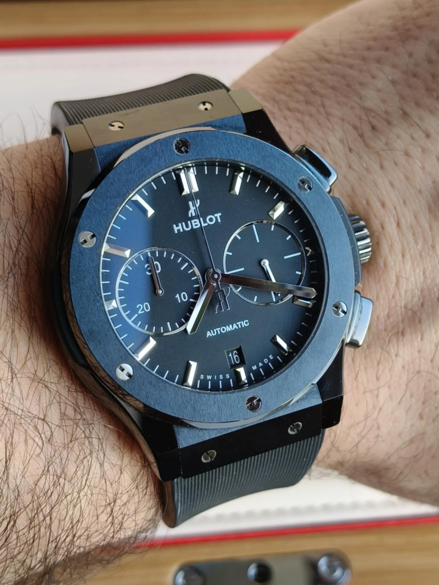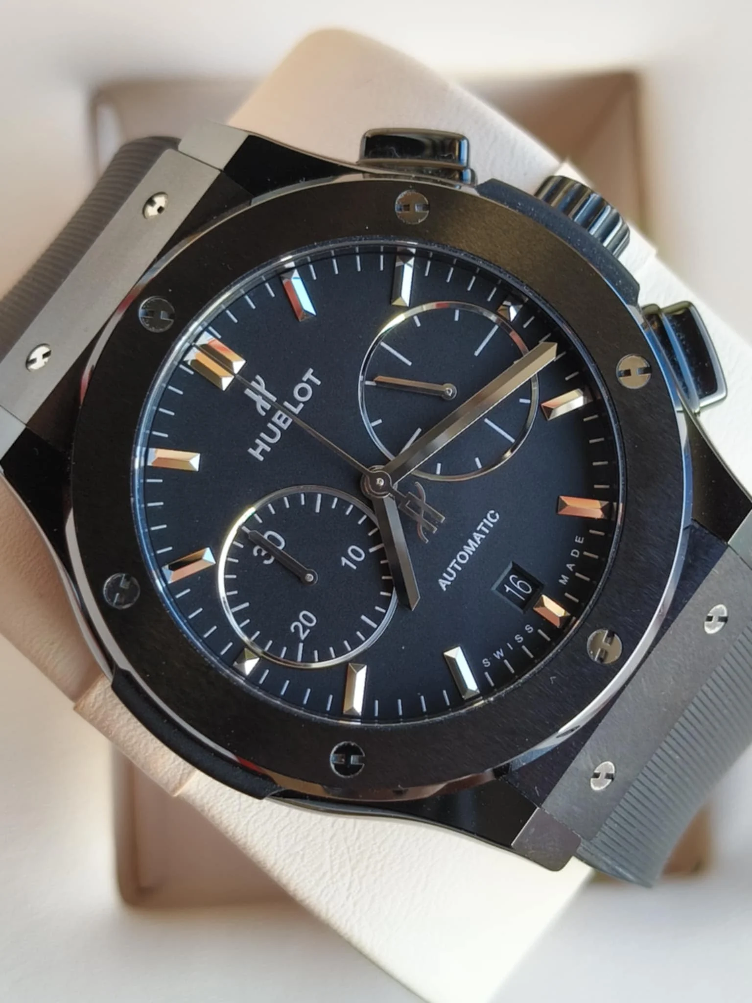 Koperta o średnicy 45 mm została wykonana z czarnej ceramiki — materiału ultralekkiego, niezwykle odpornego na zarysowania i absolutnie niewrażliwego na upływ czasu. Jej satynowo-polerowana powierzchnia nadaje zegarkowi głębi i nowoczesnego charakteru, a charakterystyczne dla Hublota śruby w kształcie litery „H” osadzone w bezelu stanowią rozpoznawalny znak technologicznego luksusu. Smukły profil koperty sprawia, że mimo imponujących rozmiarów zegarek doskonale układa się na nadgarstku, zachowując elegancką harmonię proporcji. Wodoszczelność do 50 metrów zapewnia bezpieczeństwo w codziennym użytkowaniu, bez kompromisów stylistycznych.