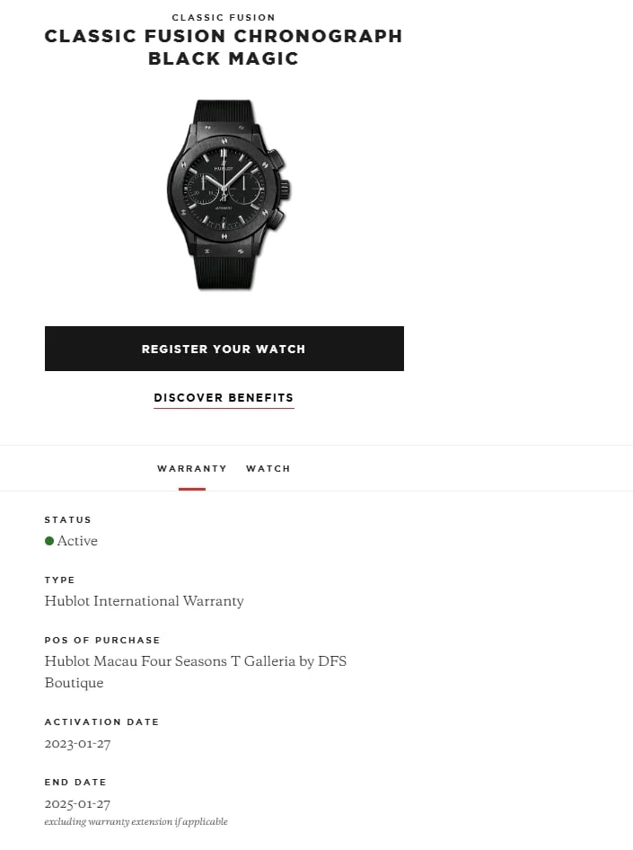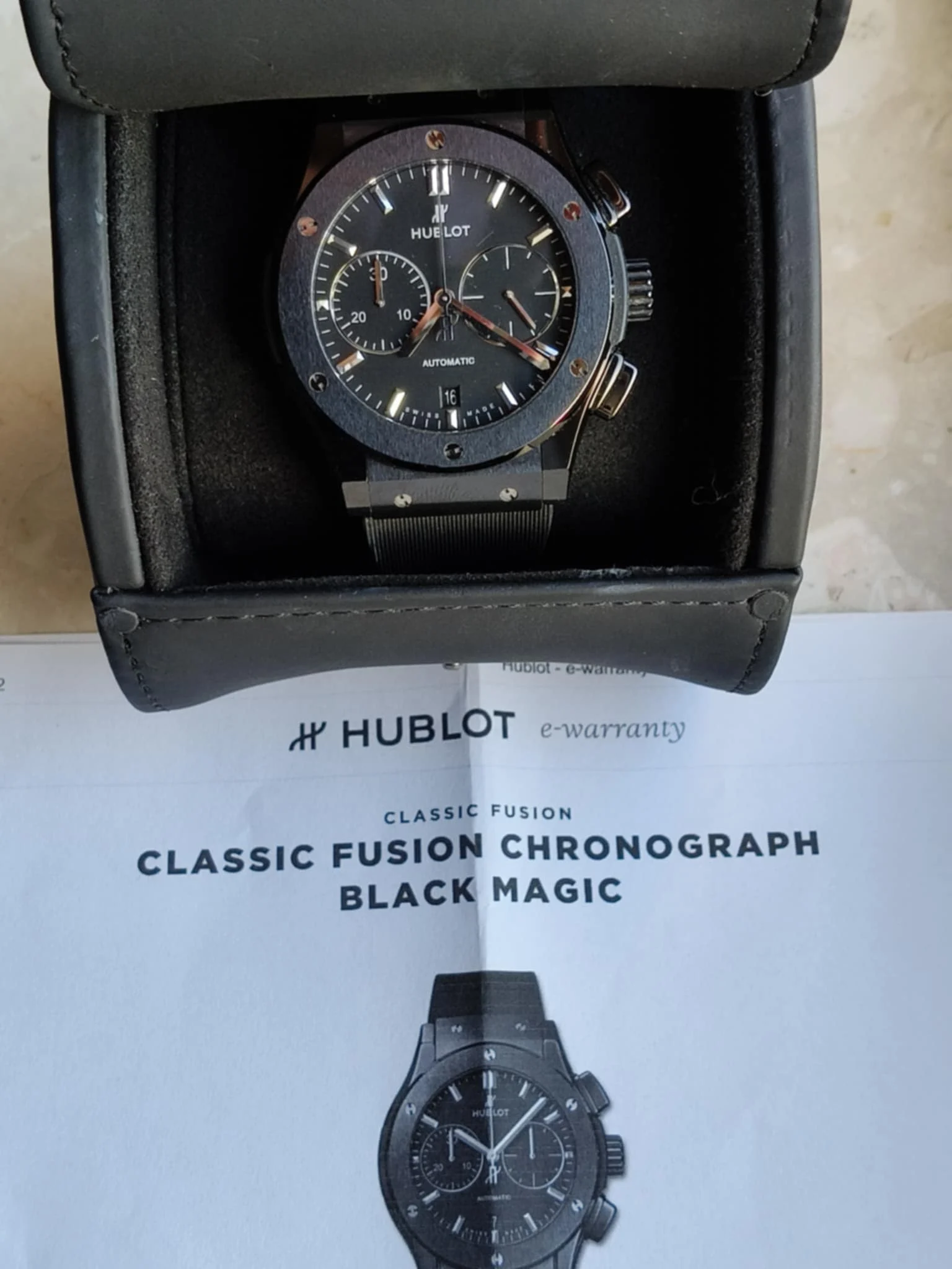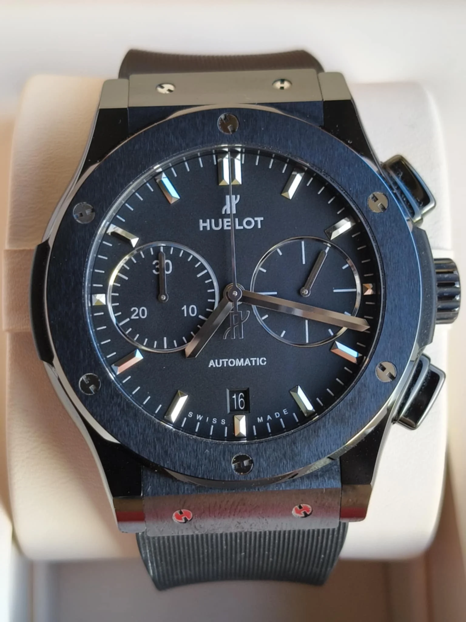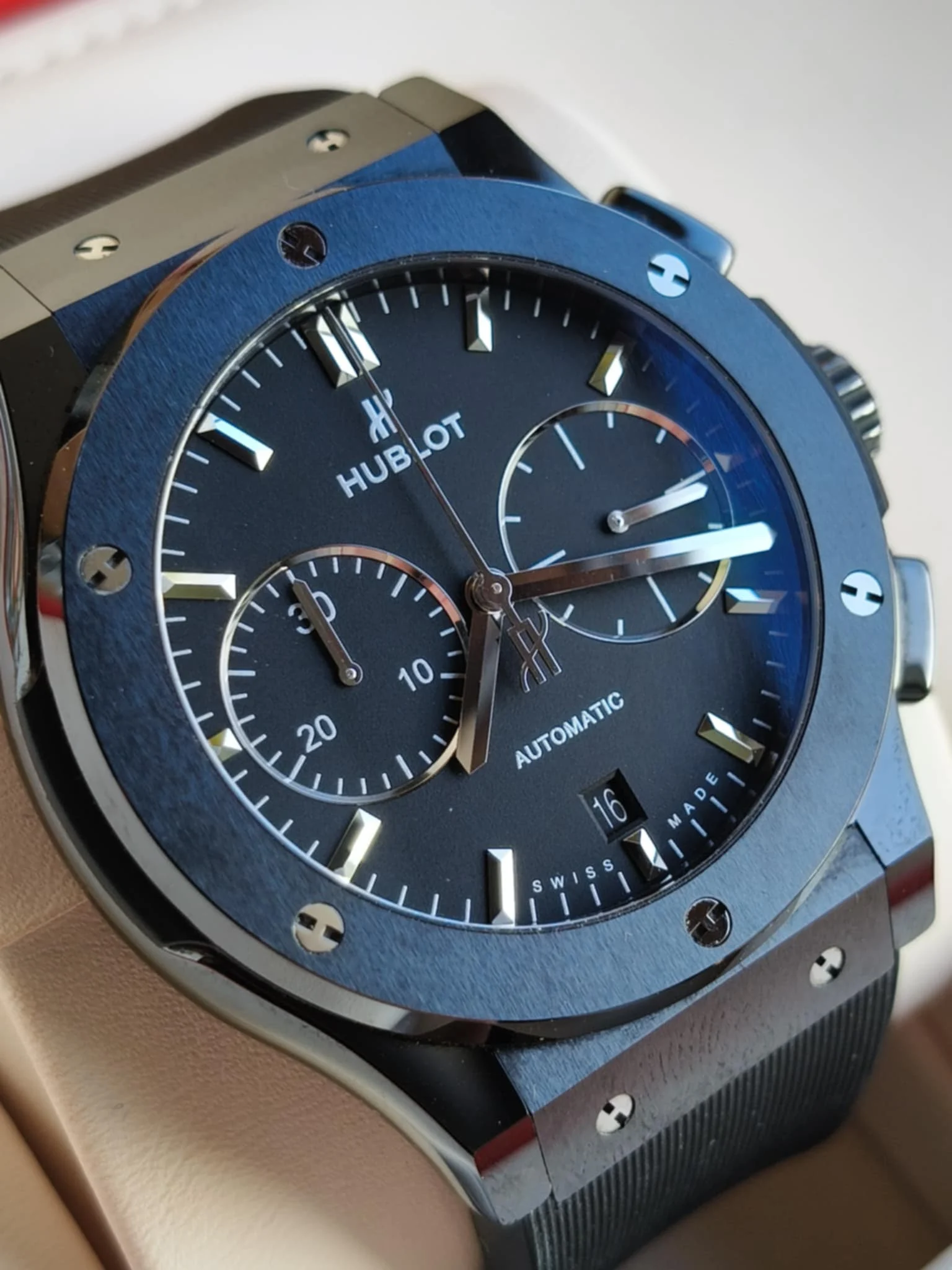 Koperta o średnicy 45 mm została wykonana z czarnej ceramiki — materiału ultralekkiego, niezwykle odpornego na zarysowania i absolutnie niewrażliwego na upływ czasu. Jej satynowo-polerowana powierzchnia nadaje zegarkowi głębi i nowoczesnego charakteru, a charakterystyczne dla Hublota śruby w kształcie litery „H” osadzone w bezelu stanowią rozpoznawalny znak technologicznego luksusu. Smukły profil koperty sprawia, że mimo imponujących rozmiarów zegarek doskonale układa się na nadgarstku, zachowując elegancką harmonię proporcji. Wodoszczelność do 50 metrów zapewnia bezpieczeństwo w codziennym użytkowaniu, bez kompromisów stylistycznych.