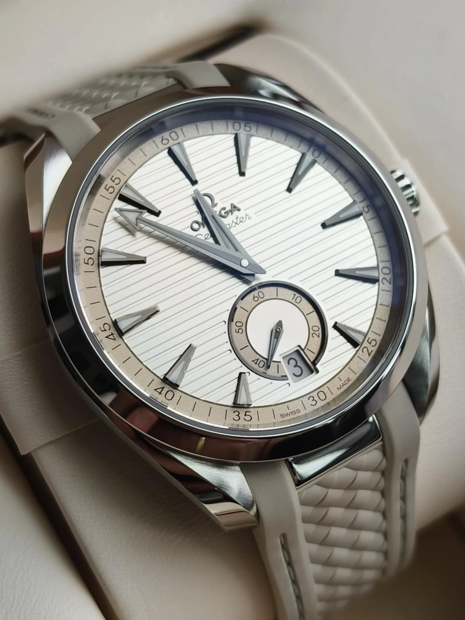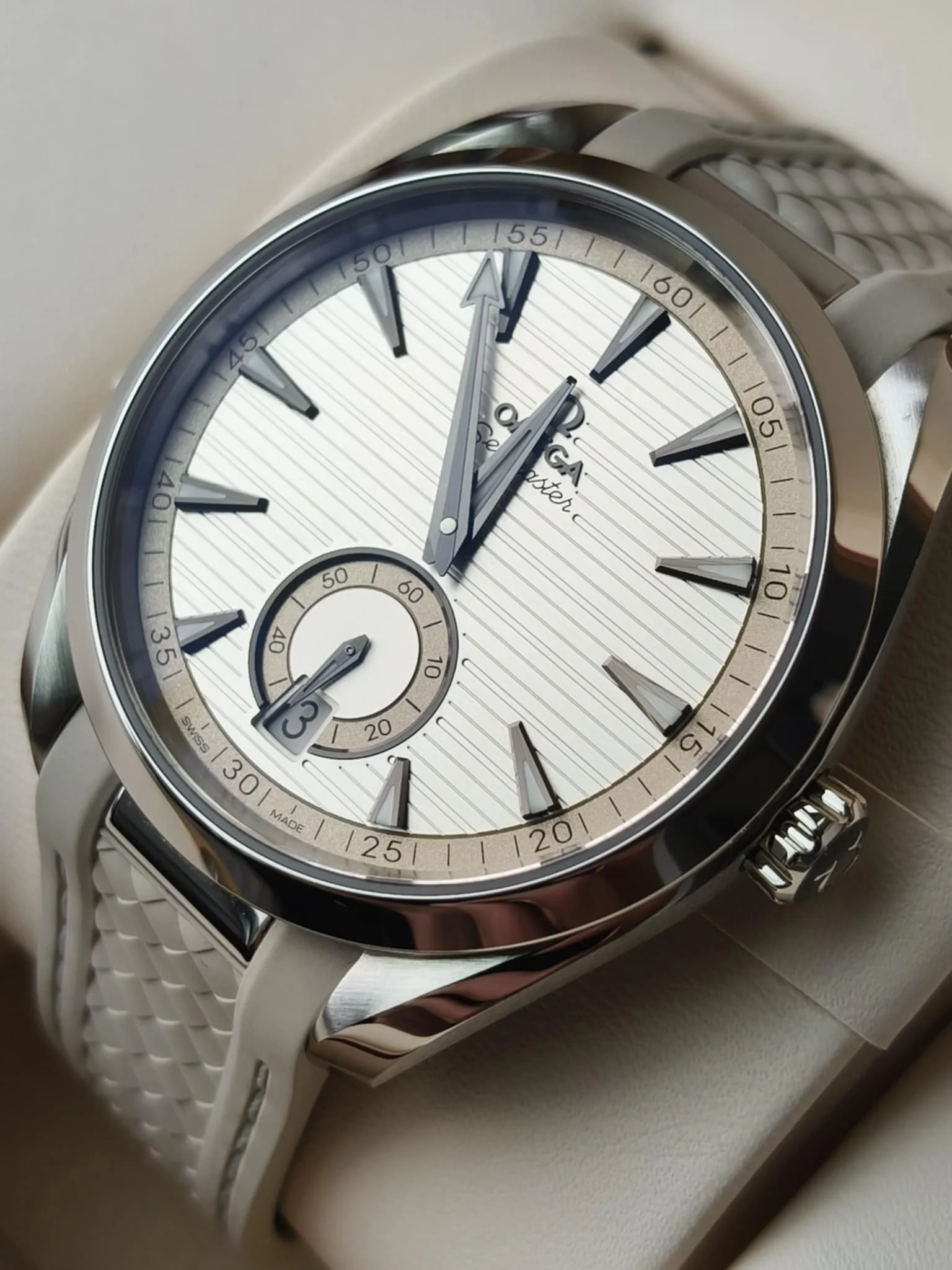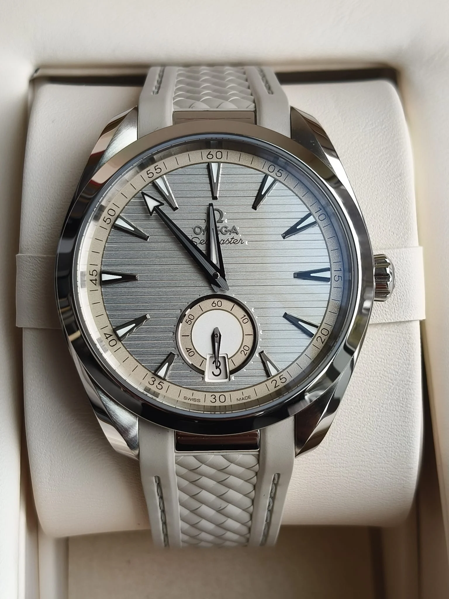 Omega Seamaster Aqua Terra Small Seconds 220.12.41.21.02.005 to ucieleśnienie harmonii między sportową funkcjonalnością a elegancją najwyższej próby — zegarek dla mężczyzny, który porusza się pewnie zarówno w dynamicznym, miejskim świecie, jak i na styku żywiołów. To propozycja dla tych, którzy cenią czystą, uporządkowaną estetykę, a jednocześnie oczekują od swojego czasomierza bezkompromisowej niezawodności, jaką niesie ze sobą dziedzictwo linii Seamaster. Koperta o średnicy 41 mm wykonana została z wyselekcjonowanej stali szlachetnej, której klasyczne proporcje i doskonale wyprofilowane linie zdradzają prawdziwie zegarmistrzowski kunszt. Charakterystyczne dla Aqua Terra szczotkowane powierzchnie i polerowane akcenty tworzą fascynującą grę światła, a delikatnie zakrzywione uszy nadają sylwetce zegarka lekkości i ergonomii. To konstrukcja zaprojektowana do codziennej aktywności — elegancka, ale gotowa na znacznie więcej niż biurowy rytm dnia. Srebrno-beżowa tarcza o subtelnej strukturze teak nawiązuje do pokładów luksusowych jachtów, jednocześnie budząc skojarzenia z czystością, przestrzenią i jasnością otwartych horyzontów. Wyraziste indeksy oraz masywne wskazówki pokryte Super-LumiNova gwarantują perfekcyjną czytelność, a mała sekunda na godzinie szóstej nadaje kompozycji wyjątkowego charakteru i zegarmistrzowskiej głębi. To tarcza pełna harmonii, ale z wyraźnym, nowoczesnym akcentem. Wodoszczelność do 150 metrów sprawia, że Aqua Terra Small Seconds czuje się równie pewnie na wodzie, jak i na lądzie. To zegarek, który można zabrać bez wahania w podróż, trening, weekendowy żeglarski wypad lub intensywny dzień w mieście — zawsze pozostając w pełni przygotowanym na zmianę otoczenia. W jego sercu pracuje manufakturowy mechanizm OMEGA Co-Axial Master Chronometer Calibre 8916 — certyfikowany przez METAS, odporny na ekstremalne pola magnetyczne (do 15 000 gausów), niewiarygodnie stabilny i niezwykle precyzyjny. Rezerwa chodu wynosząca około 60 godzin oraz nowoczesna konstrukcja oparta na technologii Co-Axial czynią z niego mechanizm zaprojektowany na lata intensywnego użytkowania. To napęd, który łączy naukową precyzję z tradycją mistrzów z Biel. Całość uzupełnia wygodny, sportowy pasek w odcieniu beżowym — wykonany z wysokiej jakości gumy, doskonale dopasowujący się do nadgarstka. Jego struktura i kolorystyka nadają zegarkowi lekko morskiego, dynamicznego ducha, a jednocześnie podkreślają nowoczesną elegancję modelu. Omega Seamaster Aqua Terra Small Seconds 220.12.41.21.02.005 to zegarek dla tych, którzy nie chcą wybierać między sportem a elegancją, między technologią a stylem. To narzędzie stworzone dla ludzi aktywnych, świadomych, pewnych swojej drogi — tych, którzy cenią precyzję i piękno w równych proporcjach. Aqua Terra nie tylko dopasowuje się do Twojego rytmu — ona wyznacza własny, konsekwentny i absolutnie niezawodny.