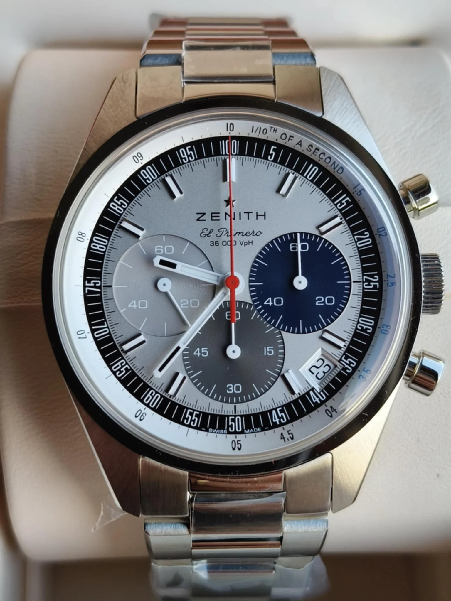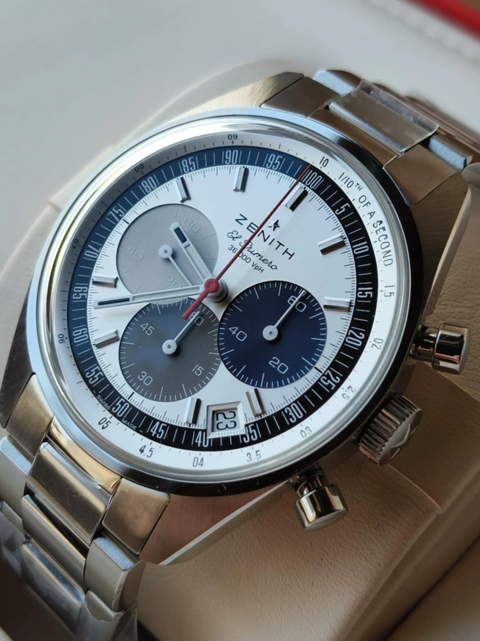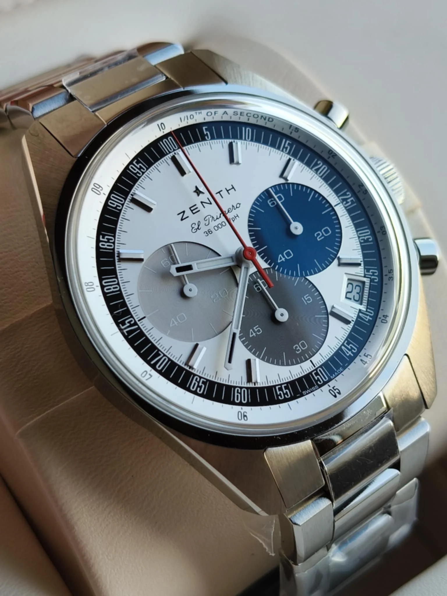 the characteristic blue column wheel. Water resistance up to 100 meters and steel bracelet with triple safety clasp complete the sporty character of this modern chronograph. This is an offer for true watchmaking enthusiasts who appreciate the revolutionary El Primero movement.