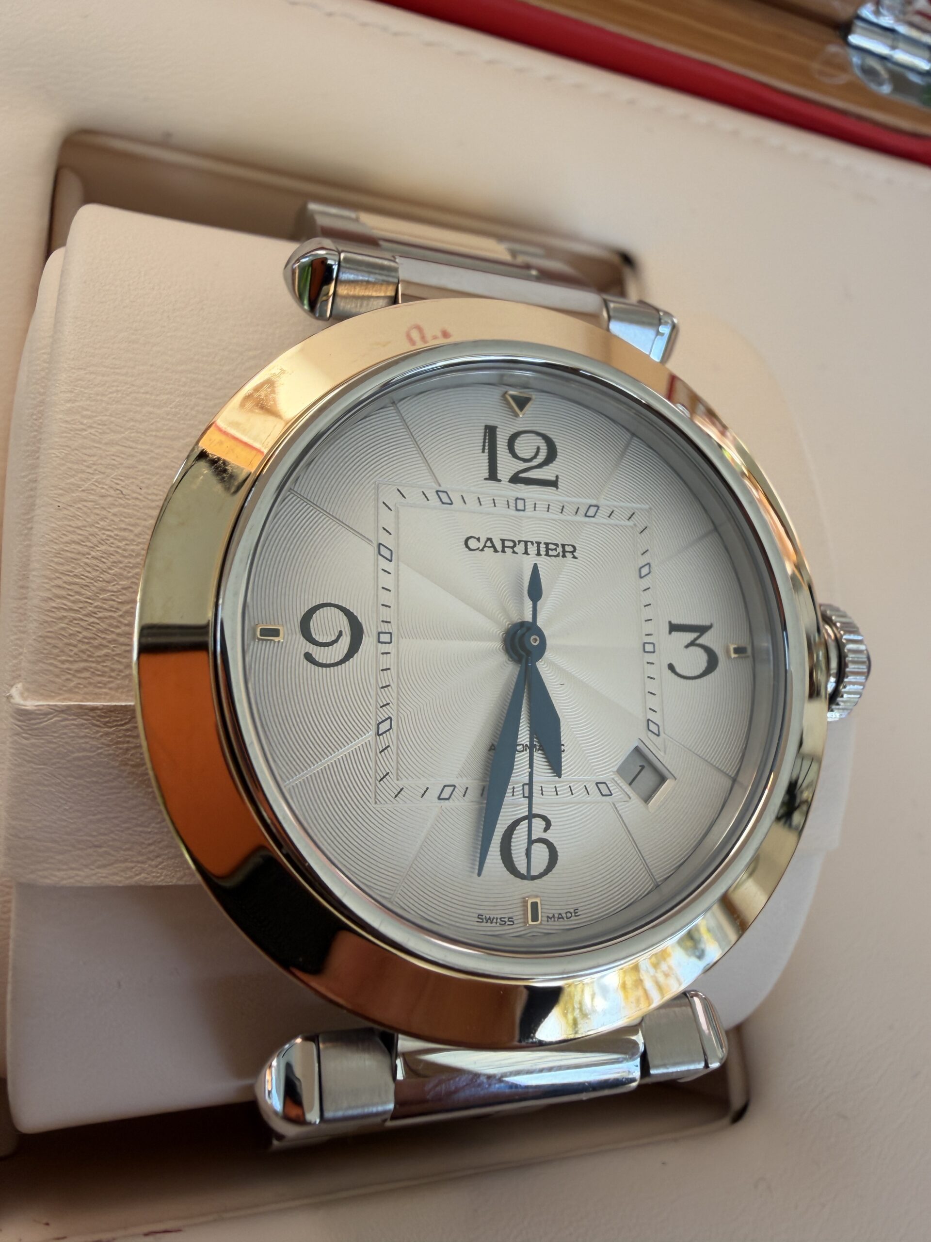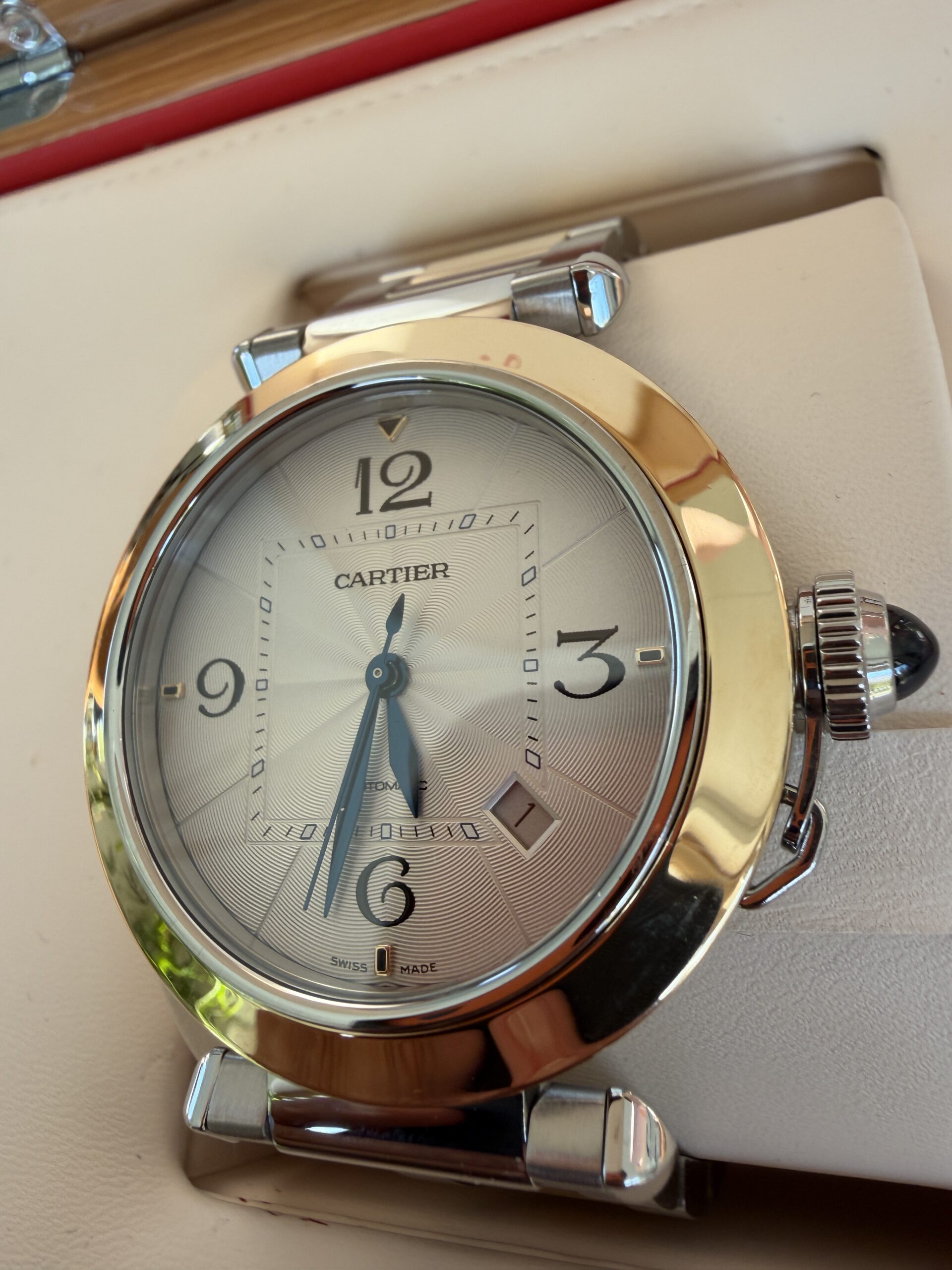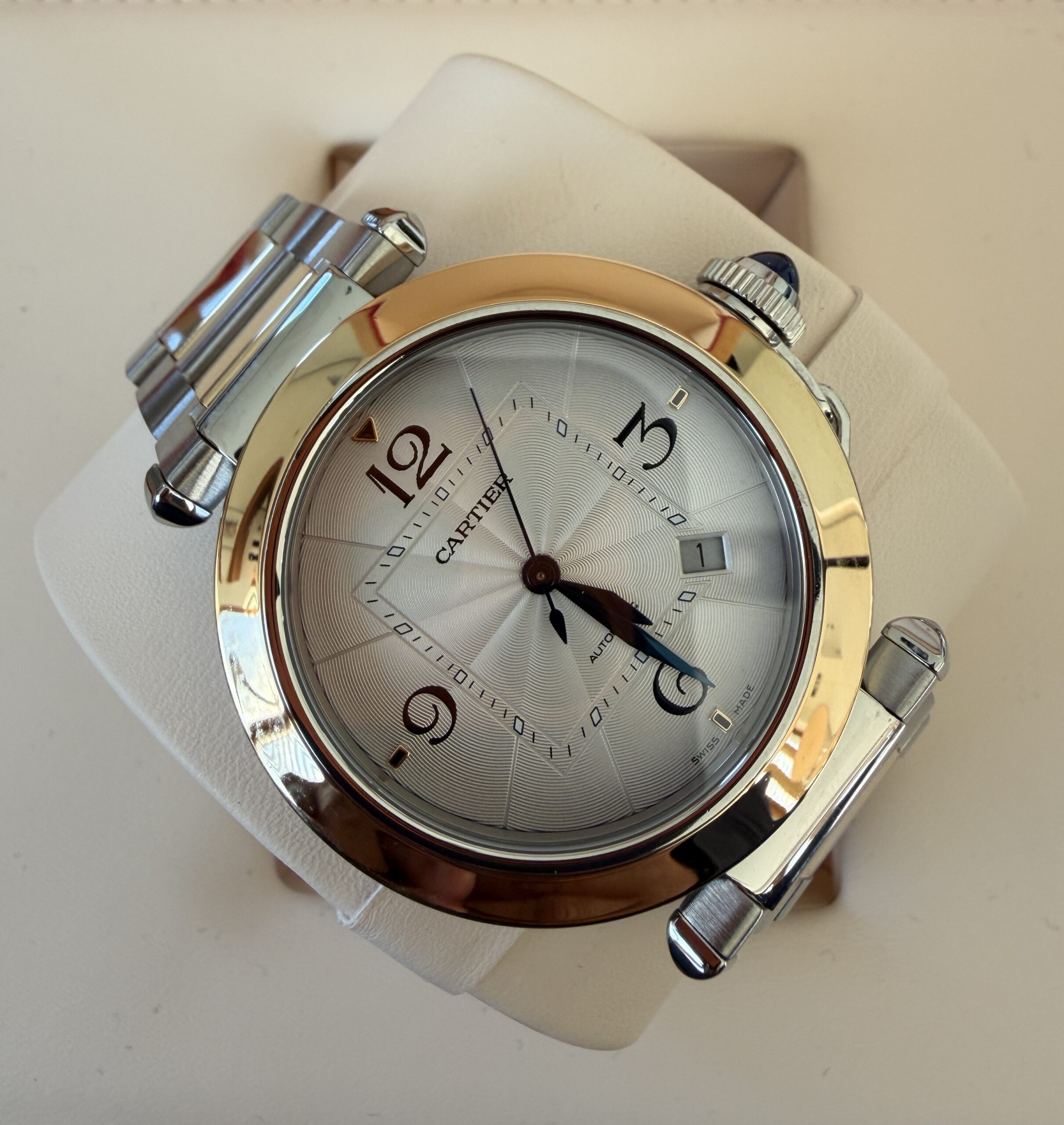Cartier Pasha De Cartier Large W2PA0009 to ucieleśnienie nowoczesnego luksusu, odważnego designu i ponadczasowej elegancji, z których słynie dom Cartier. Ten wyjątkowy model łączy w sobie ducha klasyki z nowoczesnym charakterem, tworząc zegarek dla mężczyzn pewnych siebie, ceniących wyrafinowanie, prestiż i techniczną doskonałość. Koperta o średnicy 41 mm, wykonana z 18-karatowego żółtego złota i stali nierdzewnej, zachwyca swoją harmonijną formą i dopracowanymi detalami. Charakterystyczny, okrągły kształt z wyraźnymi mocowaniami bransolety nawiązuje do oryginalnego projektu Pasha de Cartier z lat 80., który zdefiniował nową estetykę sportowego luksusu. Wykończenia polerowane i satynowane tworzą elegancki kontrast, podkreślając rzeźbiarską linię koperty. Koronka — osłonięta typowym dla kolekcji Pasha łańcuszkiem i ozdobiona niebieskim kaboszonem — stanowi subtelne odniesienie do kunsztu jubilerskiego Cartiera. Pod szafirowym szkłem znajduje się srebrzysta tarcza ozdobiona delikatnym giloszowaniem w formie centralnej rozety, z wyraźnymi, arabskimi cyframi i smukłymi wskazówkami w kształcie diamentu. Zegarek napędza mechanizm automatyczny Cartier Manufacture 1847 MC, zapewniający niezawodność i precyzję w codziennym użytkowaniu. Mechanizm oferuje rezerwę chodu około 42 godzin, a dzięki szafirowemu deklowi można podziwiać jego eleganckie wykończenie. Model W2PA0009 osadzony jest na stalowo–złotej bransolecie z systemem QuickSwitch, który pozwala na szybką wymianę paska bez użycia narzędzi — to ukłon w stronę współczesnej funkcjonalności. Cartier Pasha De Cartier Large W2PA0009 to idealne połączenie sportowego ducha, technicznej precyzji i biżuteryjnego wyrafinowania. Zegarek, który podkreśla indywidualność i wyjątkowy gust swojego właściciela — prawdziwy symbol męskiej elegancji w nowoczesnym wydaniu.