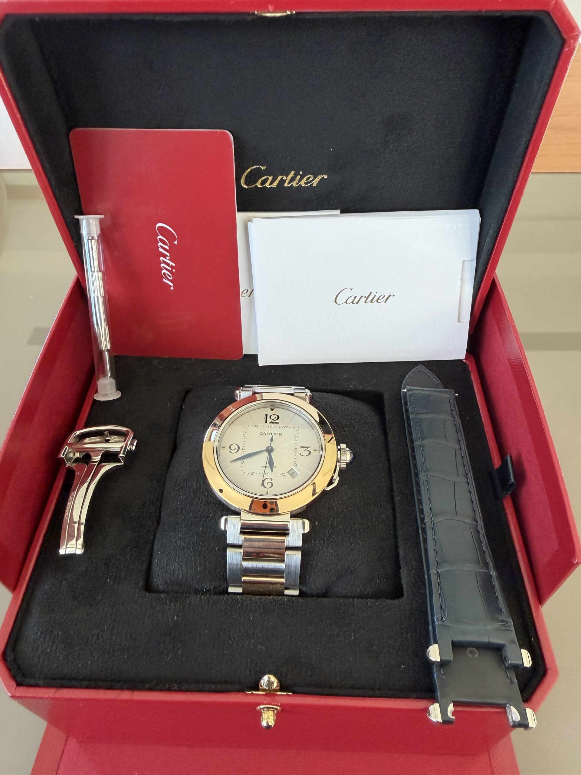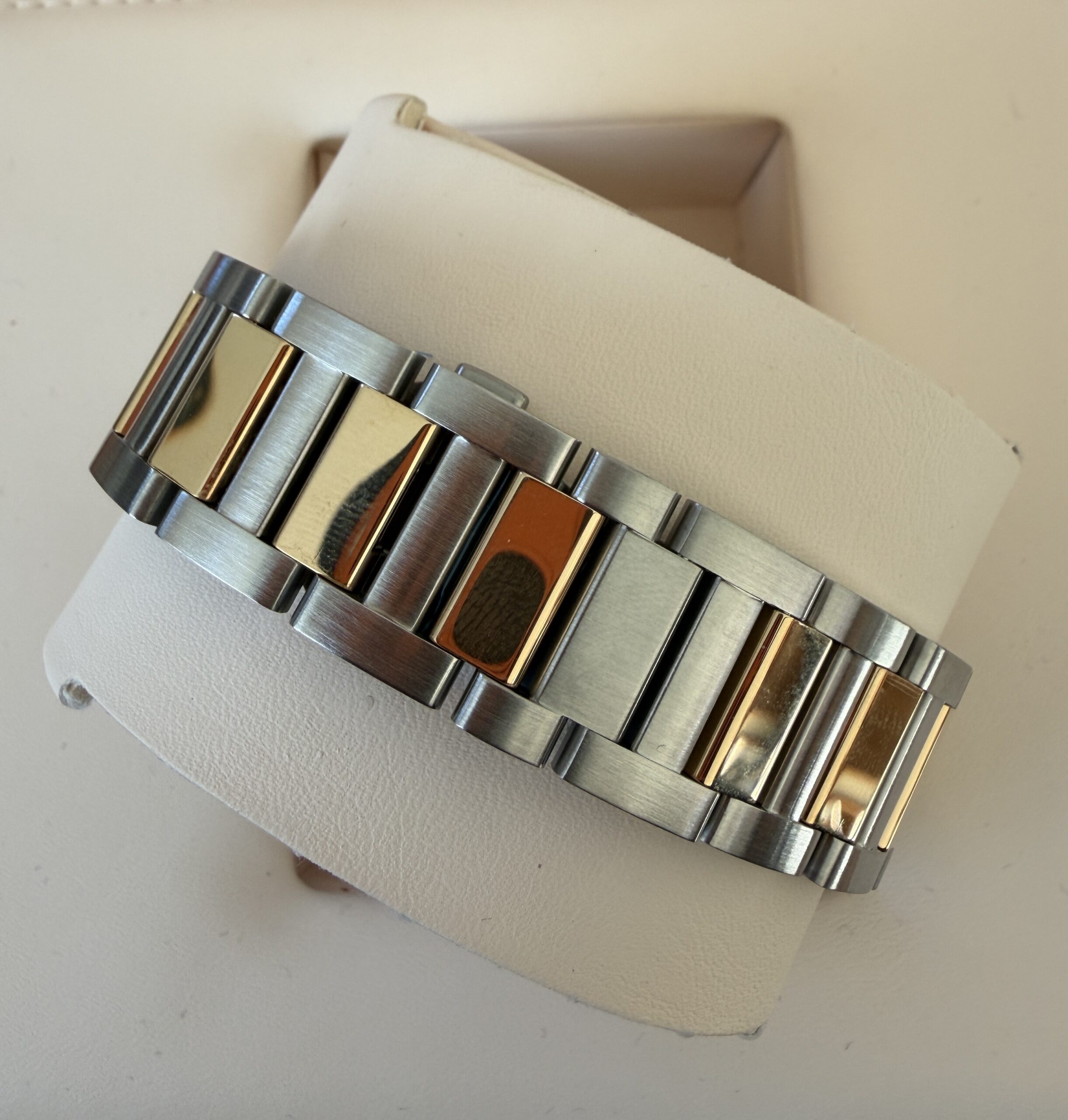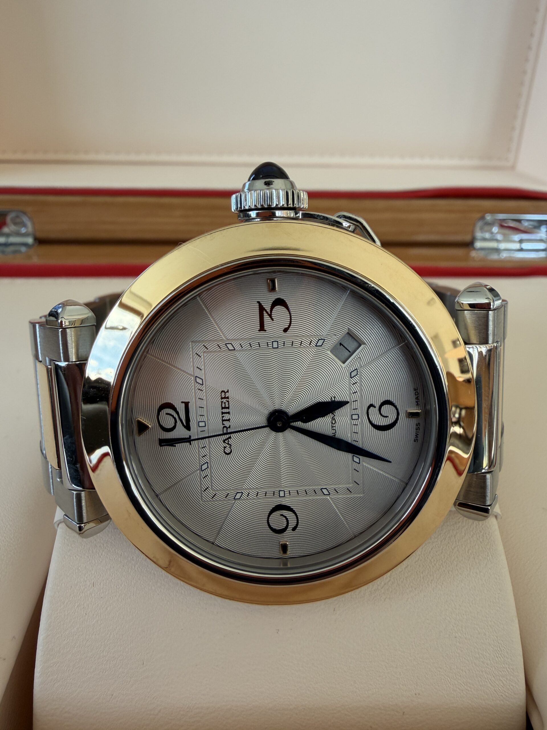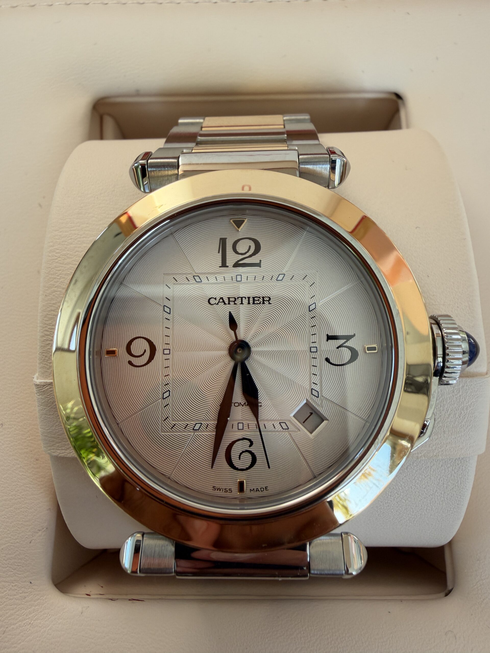 Cartier Pasha De Cartier Large W2PA0009 to ucieleśnienie nowoczesnego luksusu, odważnego designu i ponadczasowej elegancji, z których słynie dom Cartier. Ten wyjątkowy model łączy w sobie ducha klasyki z nowoczesnym charakterem, tworząc zegarek dla mężczyzn pewnych siebie, ceniących wyrafinowanie, prestiż i techniczną doskonałość. Koperta o średnicy 41 mm, wykonana z 18-karatowego żółtego złota i stali nierdzewnej, zachwyca swoją harmonijną formą i dopracowanymi detalami. Charakterystyczny, okrągły kształt z wyraźnymi mocowaniami bransolety nawiązuje do oryginalnego projektu Pasha de Cartier z lat 80., który zdefiniował nową estetykę sportowego luksusu. Wykończenia polerowane i satynowane tworzą elegancki kontrast, podkreślając rzeźbiarską linię koperty. Koronka — osłonięta typowym dla kolekcji Pasha łańcuszkiem i ozdobiona niebieskim kaboszonem — stanowi subtelne odniesienie do kunsztu jubilerskiego Cartiera. Pod szafirowym szkłem znajduje się srebrzysta tarcza ozdobiona delikatnym giloszowaniem w formie centralnej rozety, z wyraźnymi, arabskimi cyframi i smukłymi wskazówkami w kształcie diamentu. Zegarek napędza mechanizm automatyczny Cartier Manufacture 1847 MC, zapewniający niezawodność i precyzję w codziennym użytkowaniu. Mechanizm oferuje rezerwę chodu około 42 godzin, a dzięki szafirowemu deklowi można podziwiać jego eleganckie wykończenie. Model W2PA0009 osadzony jest na stalowo–złotej bransolecie z systemem QuickSwitch, który pozwala na szybką wymianę paska bez użycia narzędzi — to ukłon w stronę współczesnej funkcjonalności. Cartier Pasha De Cartier Large W2PA0009 to idealne połączenie sportowego ducha, technicznej precyzji i biżuteryjnego wyrafinowania. Zegarek, który podkreśla indywidualność i wyjątkowy gust swojego właściciela — prawdziwy symbol męskiej elegancji w nowoczesnym wydaniu.