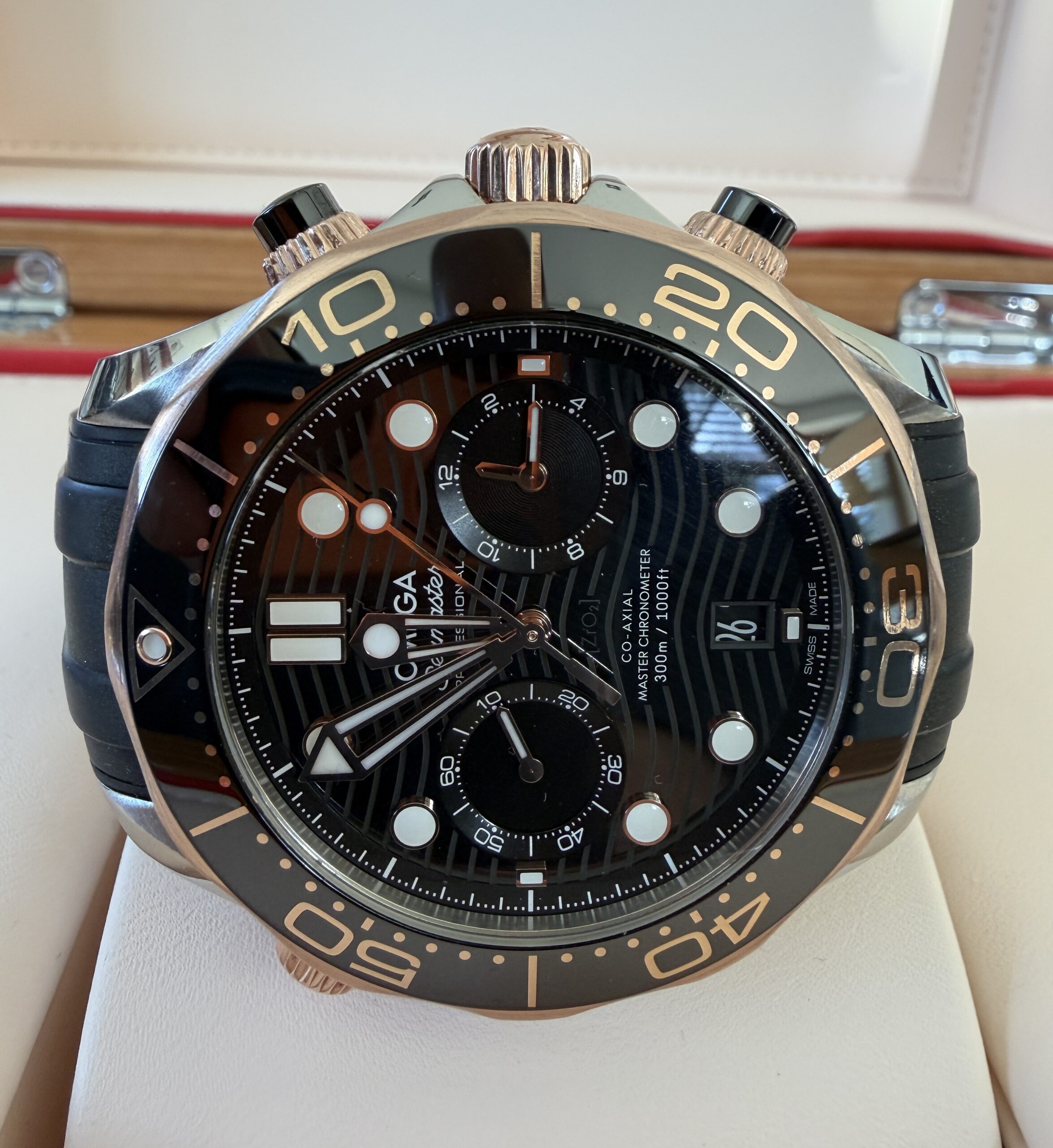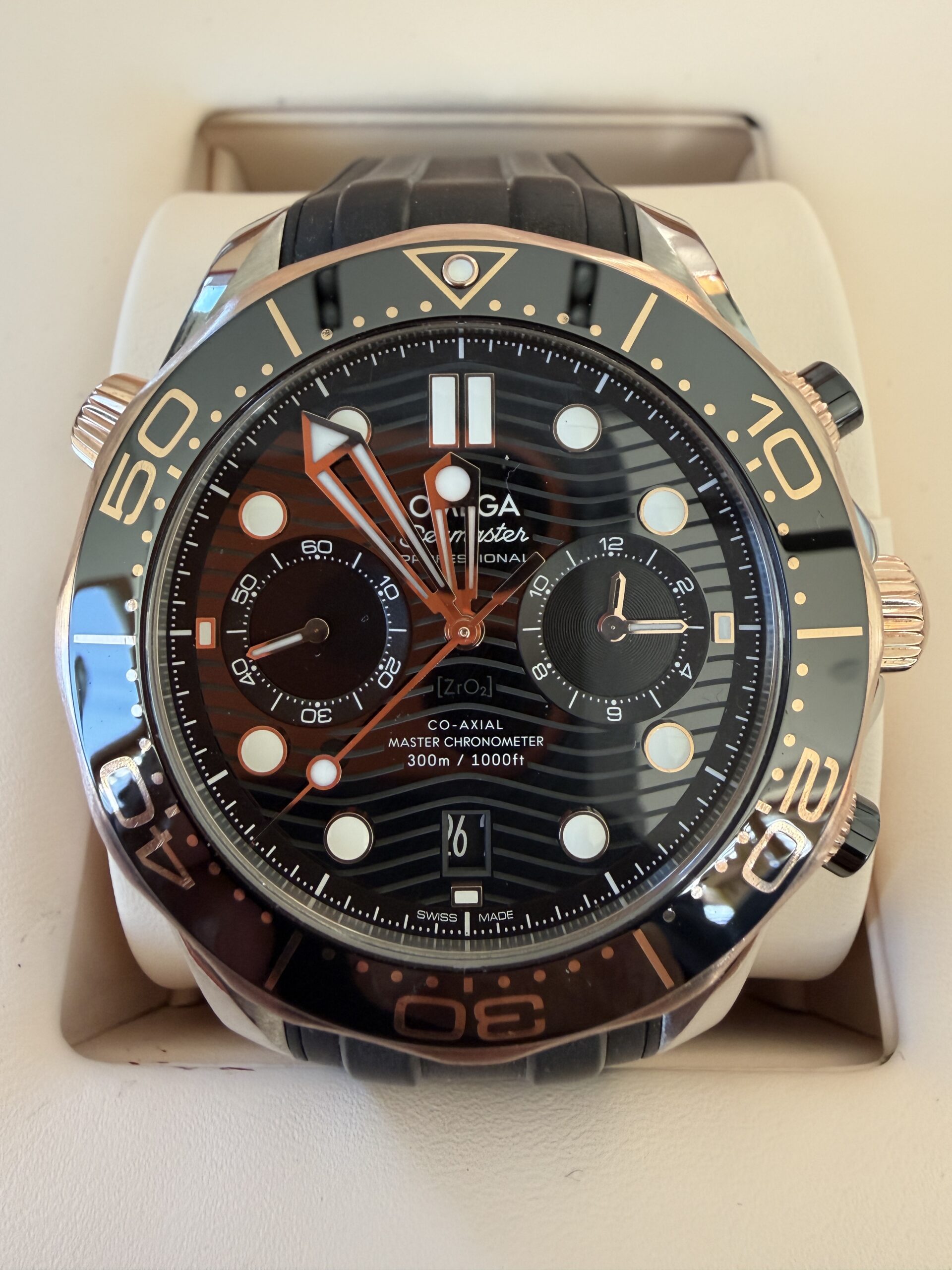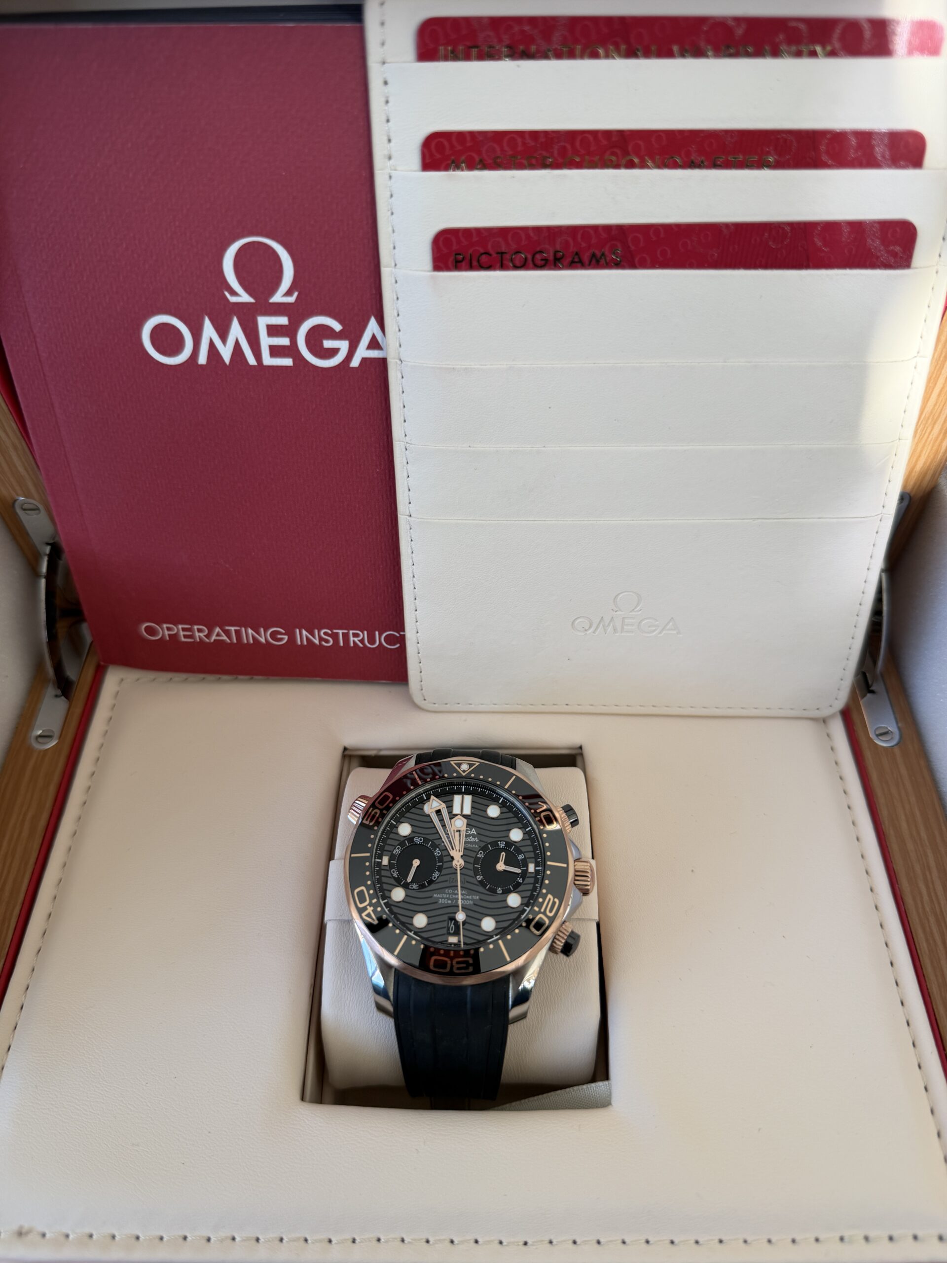 Omega Seamaster Diver 300M Chronograph 210.22.44.51.01.001 to kwintesencja sportowego luksusu, precyzji i prestiżu, które od ponad trzech dekad definiują legendarną linię Seamaster. Ten wyjątkowy model to zegarek dla mężczyzn pewnych siebie, ceniących doskonałe rzemiosło, technologiczną perfekcję i charakterystyczny, wyrazisty styl Omegi. Koperta o średnicy 44 mm, wykonana ze stali nierdzewnej i 18-karatowego różowego złota, emanuje mocą i elegancją zarazem. Jej wyważone proporcje oraz połączenie polerowanych i szczotkowanych powierzchni tworzą efekt głębi i luksusu. Charakterystyczna obrotowa luneta z czarnej ceramiki z wypełnieniem z ceragoldu łączy odporność na zarysowania z biżuteryjnym blaskiem. Pod szafirowym szkłem z powłoką antyrefleksyjną kryje się czarna, błyszcząca tarcza ceramiczna, ozdobiona falistym giloszowaniem — motywem, który stał się ikoną kolekcji Seamaster. Na tarczy umieszczono dwa precyzyjne liczniki chronografu, datownik na godzinie 6 oraz złote wskazówki i indeksy wypełnione Super-LumiNovą, gwarantujące doskonałą czytelność w każdych warunkach. Sercem zegarka jest mechanizm Omega Co-Axial Master Chronometer Calibre 9900, certyfikowany przez METAS. Ten zaawansowany kaliber z automatycznym naciągiem oferuje rezerwę chodu 60 godzin, charakteryzuje się wyjątkową odpornością na pola magnetyczne (do 15 000 gausów) i zapewnia perfekcyjną precyzję pomiaru czasu. Przez przeszklony dekiel z szafirowego szkła można podziwiać jego imponujące wykończenie — pasy genewskie w arabeskowym wzorze i kunsztowne zdobienia. Zegarek osadzony jest na eleganckim czarnym pasku z gumy, który podkreśla sportowy charakter modelu, jednocześnie zapewniając komfort noszenia. Wodoszczelność do 300 metrów sprawia, że Seamaster 300M Chronograph jest równie funkcjonalny pod wodą, co efektowny na lądzie. Omega Seamaster Diver 300M Chronograph 210.22.44.51.01.001 to hołd dla morskiego dziedzictwa marki — zegarek, który łączy siłę, precyzję i luksus w doskonałej harmonii. Idealny wybór dla mężczyzny, który ceni klasę, technologię i niezawodność w każdej sytuacji.
