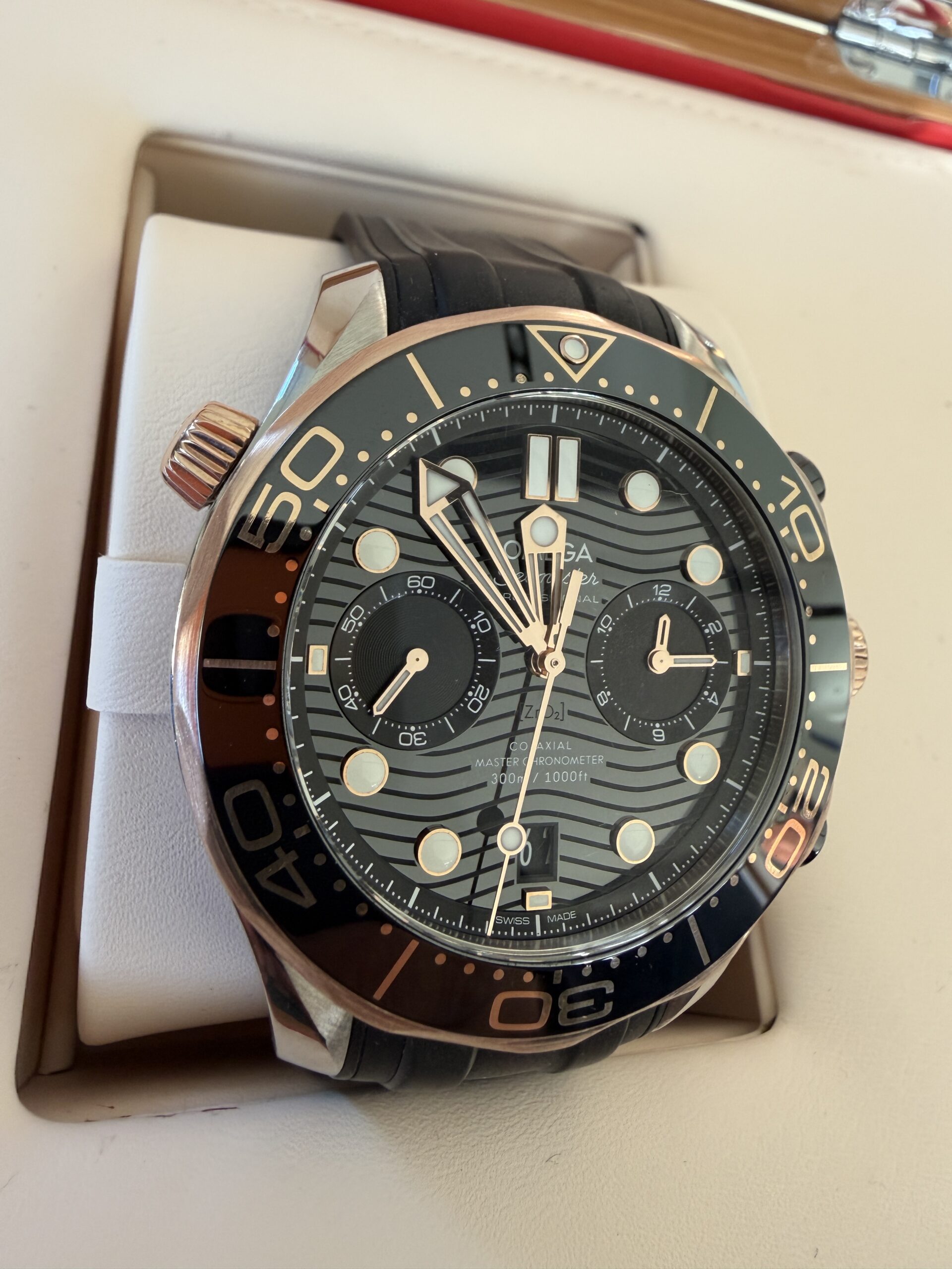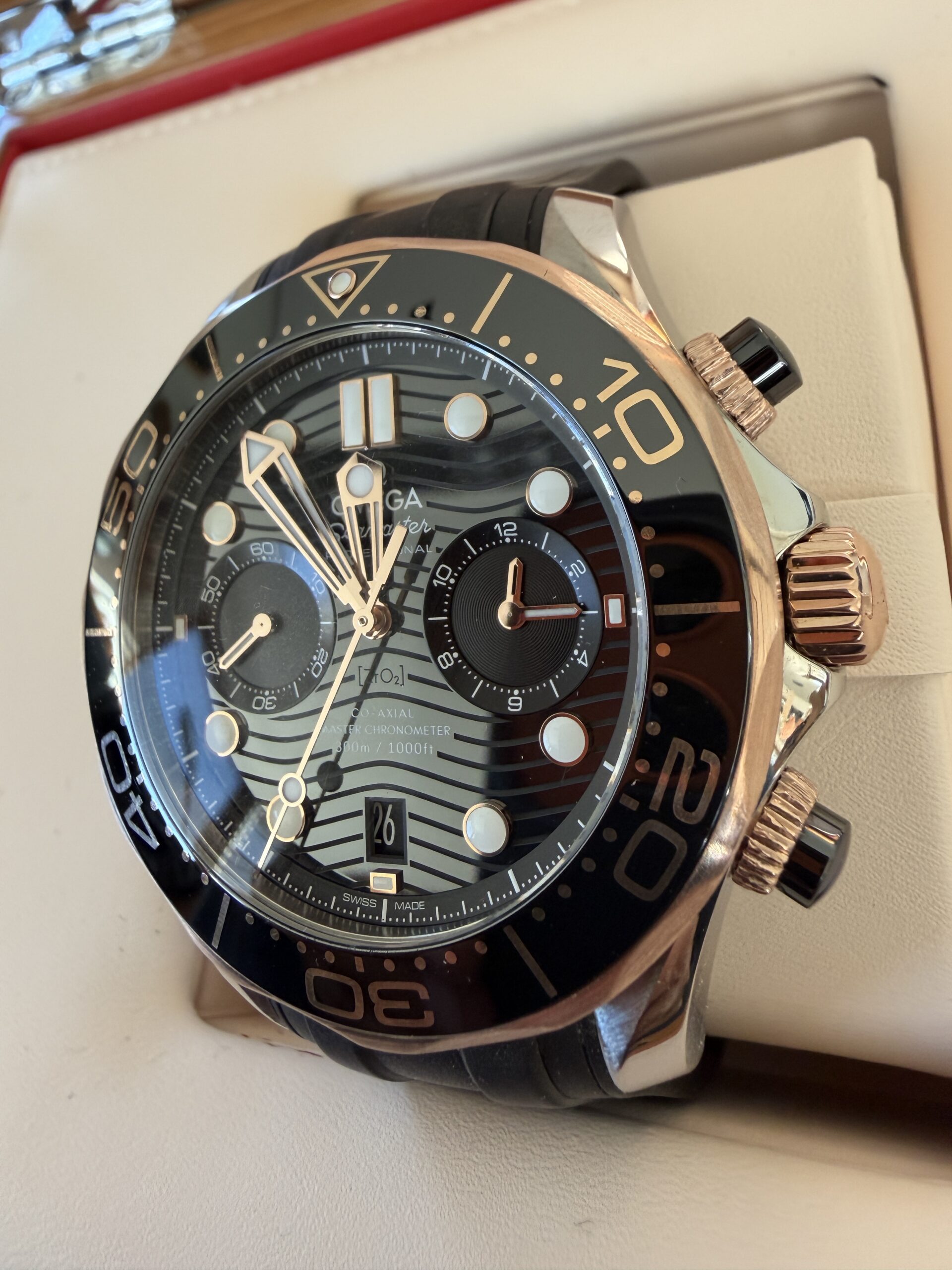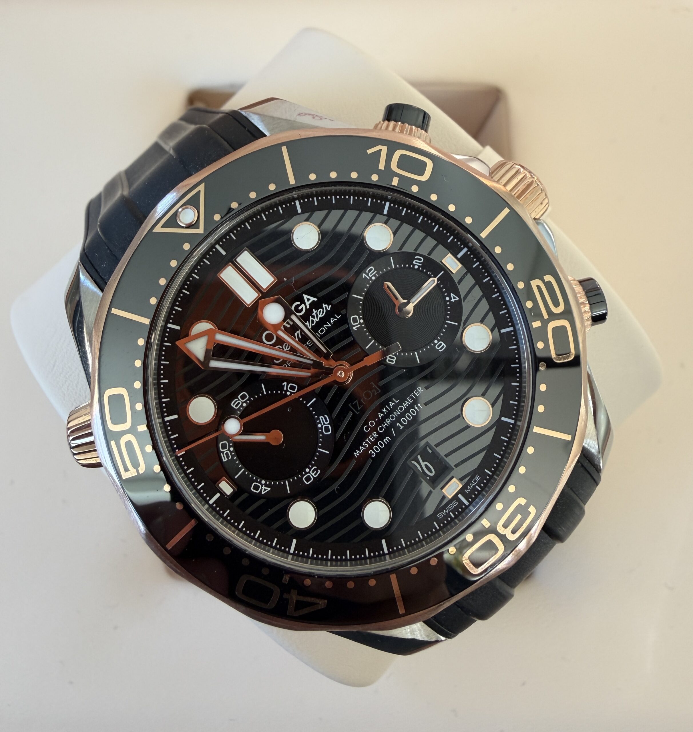 Omega Seamaster Diver 300M Chronograph 210.22.44.51.01.001 to kwintesencja sportowego luksusu, precyzji i prestiżu, które od ponad trzech dekad definiują legendarną linię Seamaster. Ten wyjątkowy model to zegarek dla mężczyzn pewnych siebie, ceniących doskonałe rzemiosło, technologiczną perfekcję i charakterystyczny, wyrazisty styl Omegi. Koperta o średnicy 44 mm, wykonana ze stali nierdzewnej i 18-karatowego różowego złota, emanuje mocą i elegancją zarazem. Jej wyważone proporcje oraz połączenie polerowanych i szczotkowanych powierzchni tworzą efekt głębi i luksusu. Charakterystyczna obrotowa luneta z czarnej ceramiki z wypełnieniem z ceragoldu łączy odporność na zarysowania z biżuteryjnym blaskiem. Pod szafirowym szkłem z powłoką antyrefleksyjną kryje się czarna, błyszcząca tarcza ceramiczna, ozdobiona falistym giloszowaniem — motywem, który stał się ikoną kolekcji Seamaster. Na tarczy umieszczono dwa precyzyjne liczniki chronografu, datownik na godzinie 6 oraz złote wskazówki i indeksy wypełnione Super-LumiNovą, gwarantujące doskonałą czytelność w każdych warunkach. Sercem zegarka jest mechanizm Omega Co-Axial Master Chronometer Calibre 9900, certyfikowany przez METAS. Ten zaawansowany kaliber z automatycznym naciągiem oferuje rezerwę chodu 60 godzin, charakteryzuje się wyjątkową odpornością na pola magnetyczne (do 15 000 gausów) i zapewnia perfekcyjną precyzję pomiaru czasu. Przez przeszklony dekiel z szafirowego szkła można podziwiać jego imponujące wykończenie — pasy genewskie w arabeskowym wzorze i kunsztowne zdobienia. Zegarek osadzony jest na eleganckim czarnym pasku z gumy, który podkreśla sportowy charakter modelu, jednocześnie zapewniając komfort noszenia. Wodoszczelność do 300 metrów sprawia, że Seamaster 300M Chronograph jest równie funkcjonalny pod wodą, co efektowny na lądzie. Omega Seamaster Diver 300M Chronograph 210.22.44.51.01.001 to hołd dla morskiego dziedzictwa marki — zegarek, który łączy siłę, precyzję i luksus w doskonałej harmonii. Idealny wybór dla mężczyzny, który ceni klasę, technologię i niezawodność w każdej sytuacji.