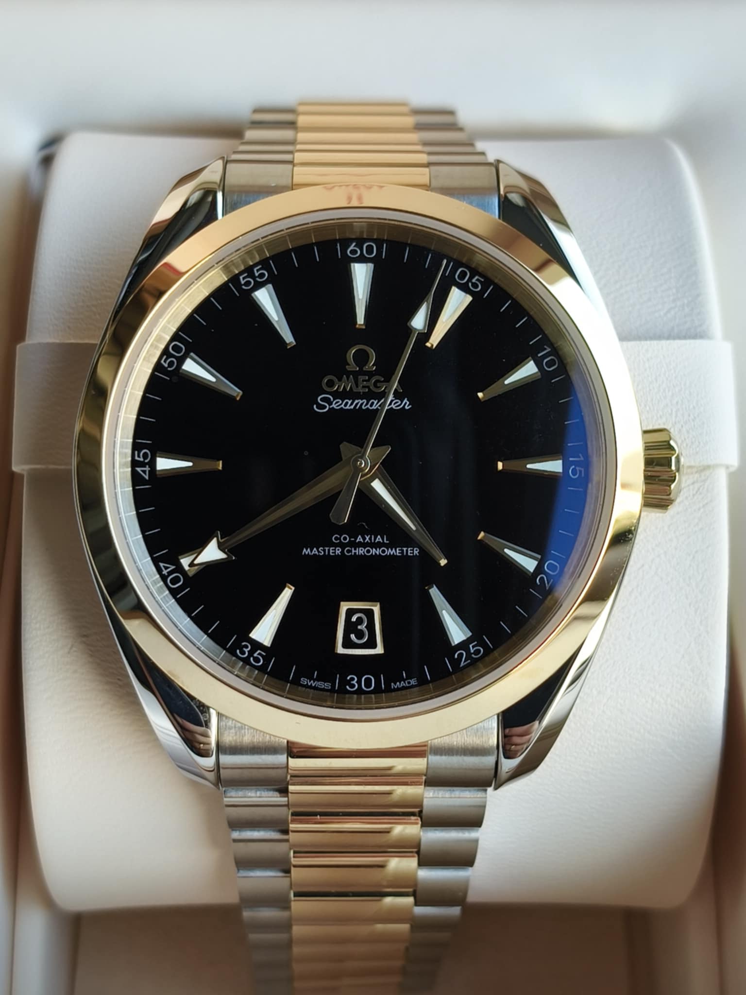 Omega Seamaster Aqua Terra Moonshine™ Gold 220.10.41.21.01.002 to wyrafinowany przykład tego, jak zegarmistrzostwo najwyższej próby może spotykać się z nowoczesną elegancją i sportowym charakterem. Model ten należy do cenionej kolekcji Aqua Terra, która powstała z myślą o osobach poszukujących idealnego balansu między żywiołem wody a codziennym, miejskim stylem. To zegarek dla tych, którzy cenią sobie wyrafinowaną estetykę, ale nie chcą rezygnować z funkcjonalności i precyzji – niezależnie od okoliczności. Zegarek wyróżnia się 41-milimetrową kopertą ze stali nierdzewnej, uzupełnioną o detale wykonane z 18-karatowego złota Moonshine™, co nadaje mu wyjątkowego, luksusowego charakteru. Dwukolorowe wykończenie – stal i różowe złoto – podkreśla elegancki, ale jednocześnie nowoczesny design. Najnowsza odsłana z czarna gładką tarczą. Delikatne wskazówki i indeksy w kształcie strzałek zostały pokryte powłoką Super-LumiNova®, zapewniając doskonałą czytelność w ciemności. Subtelne okienko datownika umieszczone na godzinie szóstej wprowadza wizualną symetrię i porządek, zachowując przy tym pełną funkcjonalność. Sercem tego modelu jest prestiżowy mechanizm Omega Master Chronometer Calibre 8900, certyfikowany przez METAS. Dzięki zastosowaniu technologii Co-Axial oraz antymagnetycznych komponentów (do 15 000 gausów), mechanizm oferuje nie tylko wyjątkową precyzję, ale również odporność na codzienne wstrząsy i pola magnetyczne. Rezerwa chodu wynosi aż 60 godzin, co czyni go idealnym kompanem na długie dni – również poza biurem. Zegarek oferuje wodoodporność do 150 metrów (15 barów), a zakręcana koronka i szafirowy dekiel z widokiem na ozdobiony mechanizm podkreślają luksusowy, ale technicznie zaawansowany charakter modelu. Bransoleta ze stali nierdzewnej z elegancko wyprofilowanymi ogniwami gwarantuje wygodę noszenia i doskonałe dopasowanie do nadgarstka. Omega Seamaster Aqua Terra 220.20.41.21.01.001 to idealny zegarek dla nowoczesnego mężczyzny – pewnego siebie, aktywnego i świadomego swojego stylu. Łączy świat lądu i wody, klasyki i innowacji, tworząc ponadczasowy symbol elegancji z morską duszą.
