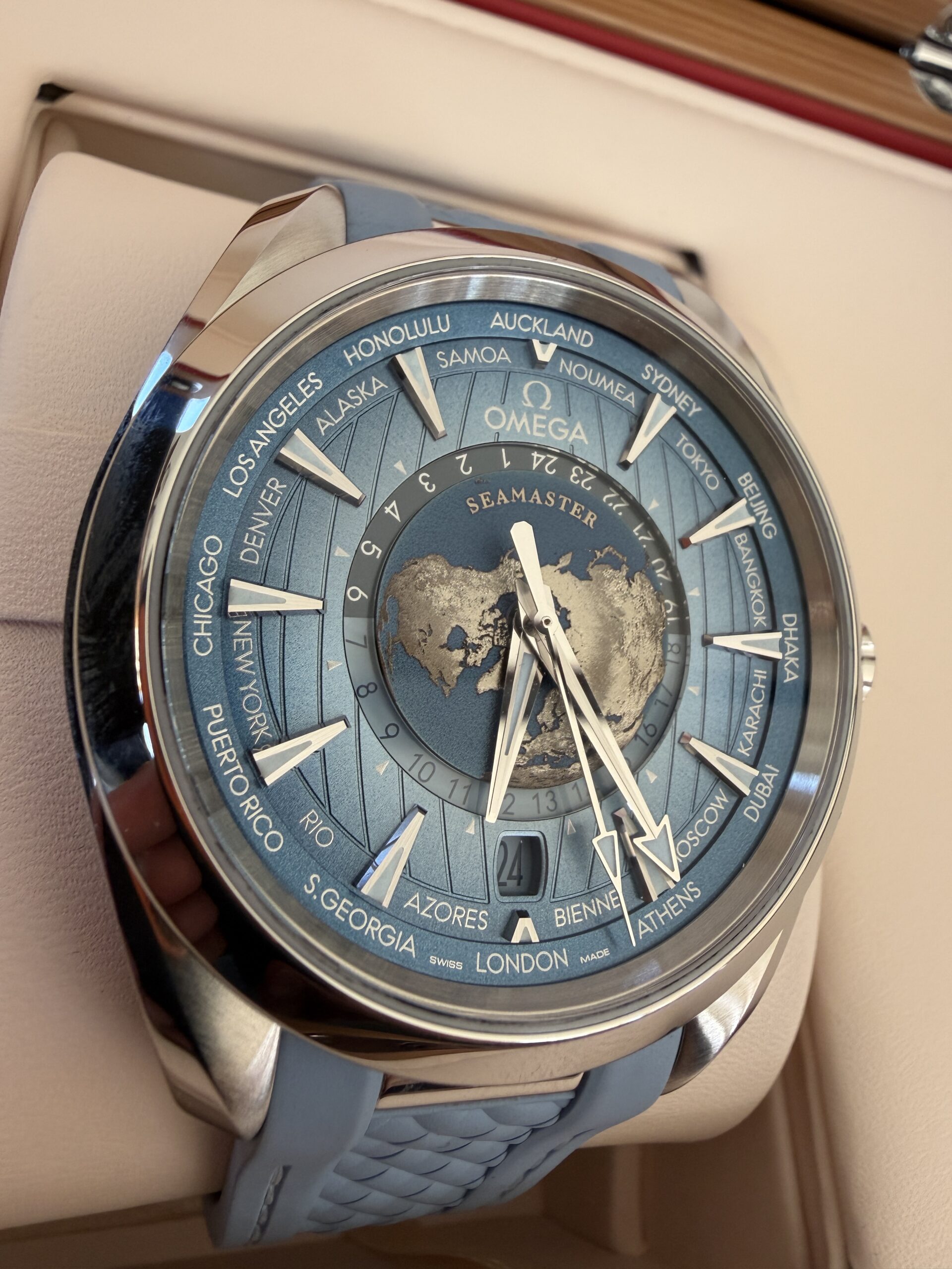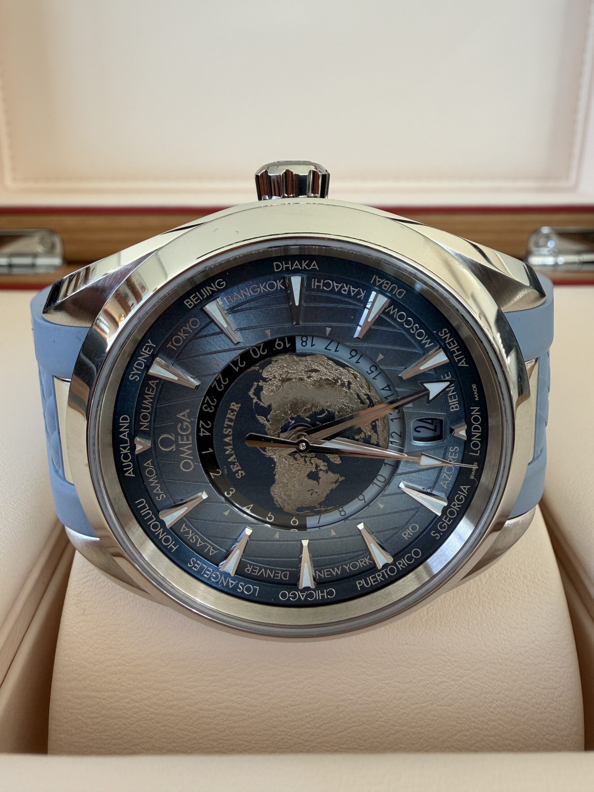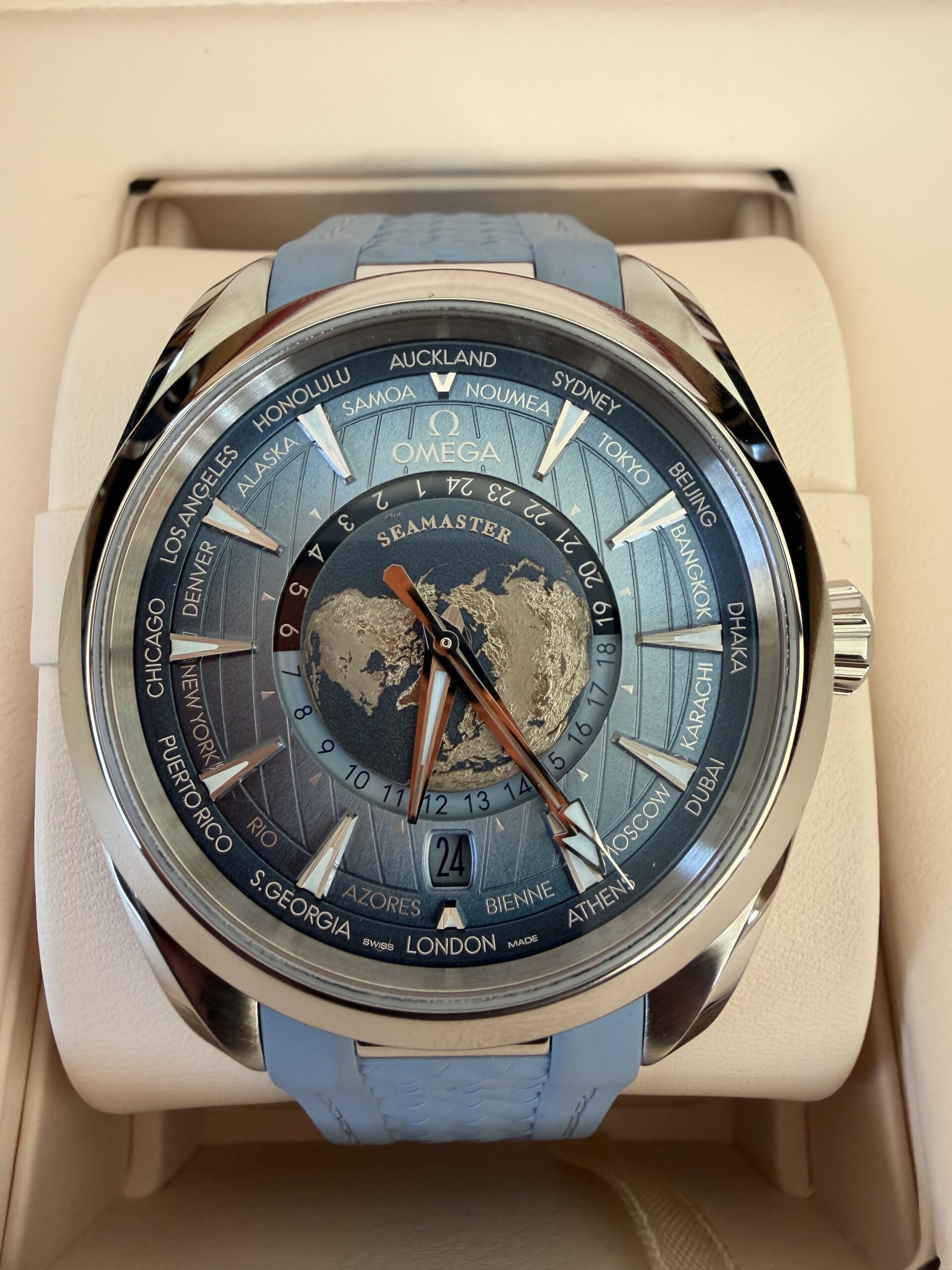 Omega Seamaster Aqua Terra Worldtimer Summer Blue 220.12.43.22.03.002 to połączenie nowoczesnej elegancji, technicznego mistrzostwa i ducha podróży, który od dziesięcioleci definiuje kolekcję Seamaster. Ten wyjątkowy model to zegarek dla mężczyzny nowoczesnego, kosmopolitycznego, który ceni nie tylko doskonałość mechanizmu, ale także wyrafinowaną estetykę i niepowtarzalny charakter. Koperta o średnicy 43 mm, wykonana ze stali nierdzewnej, łączy solidność z elegancją. Jej wyważone proporcje i płynne linie nawiązują do morskiego dziedzictwa marki Omega, a szczotkowane i polerowane powierzchnie tworzą grę świateł, podkreślając sportowo-luksusowy charakter zegarka. Wodoszczelność do 150 metrów sprawia, że model zachowuje pełną funkcjonalność w każdych warunkach — od biura po oceaniczne głębiny. Sercem zegarka jest tarcza w hipnotyzującym odcieniu Summer Blue, ozdobiona pionowym wzorem „teak”, inspirowanym pokładami jachtów. W centralnej części znajduje się trójwymiarowa mapa świata, grawerowana laserowo na tytanowym dysku w odcieniach niebieskiego — prawdziwe dzieło sztuki mikromechanicznej. Wokół niej rozmieszczono pierścień z nazwami miast reprezentujących strefy czasowe, umożliwiający odczyt czasu na całym globie. Wskazówki i indeksy wypełnione Super-LumiNova zapewniają doskonałą czytelność niezależnie od oświetlenia. Zegarek napędzany jest mechanizmem Omega Co-Axial Master Chronometer 8938, certyfikowanym przez METAS, który gwarantuje najwyższy poziom precyzji, odporności magnetycznej i niezawodności. Mechanizm oferuje rezerwę chodu około 60 godzin, a chroni go stalowy dekiel z wizerunkiem Posejdona zaopatrzonego w trójząb, charakterystycznym dla kolekcji Summer Blue. Model wyposażono w elegancki gumowy pasek w kolorze jasno niebieskim, idealnie komponujący się z tonacją tarczy i dodający zegarkowi sportowego, a zarazem ekskluzywnego charakteru. Omega Seamaster Aqua Terra Worldtimer Summer Blue to nie tylko czasomierz, lecz manifest podróżniczego ducha i nowoczesnego luksusu. Zegarek dla tych, którzy patrzą na świat globalnie — z klasą, precyzją i stylem charakterystycznym dla manufaktury Omega.