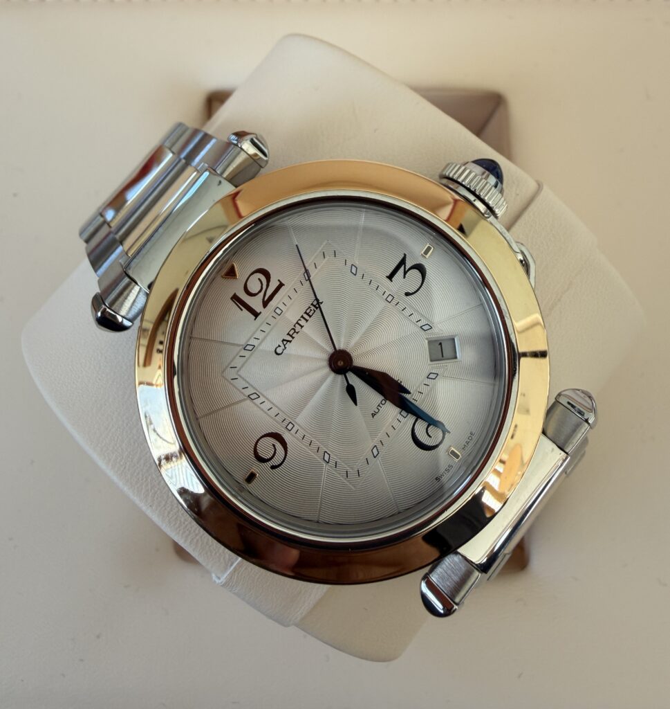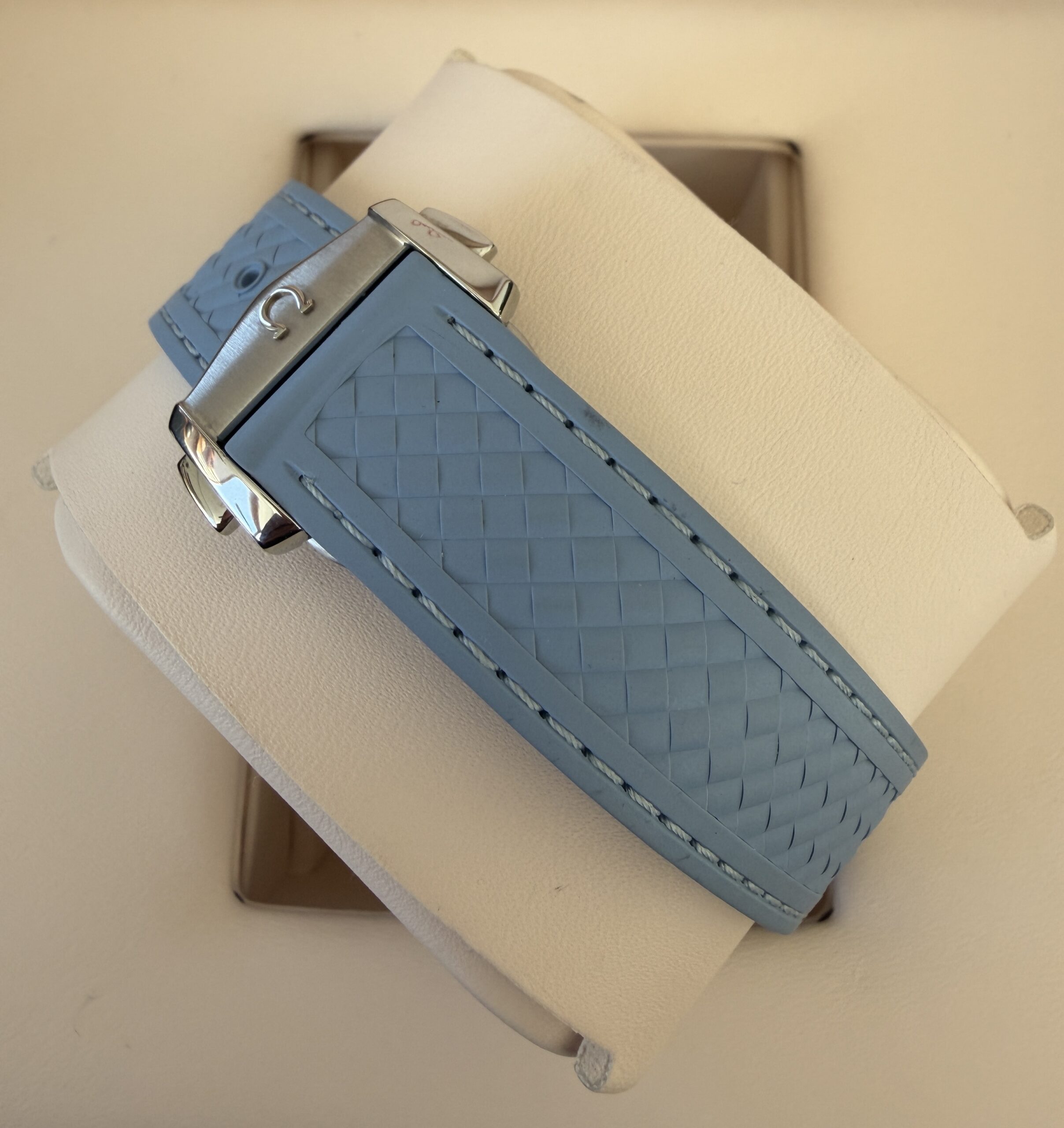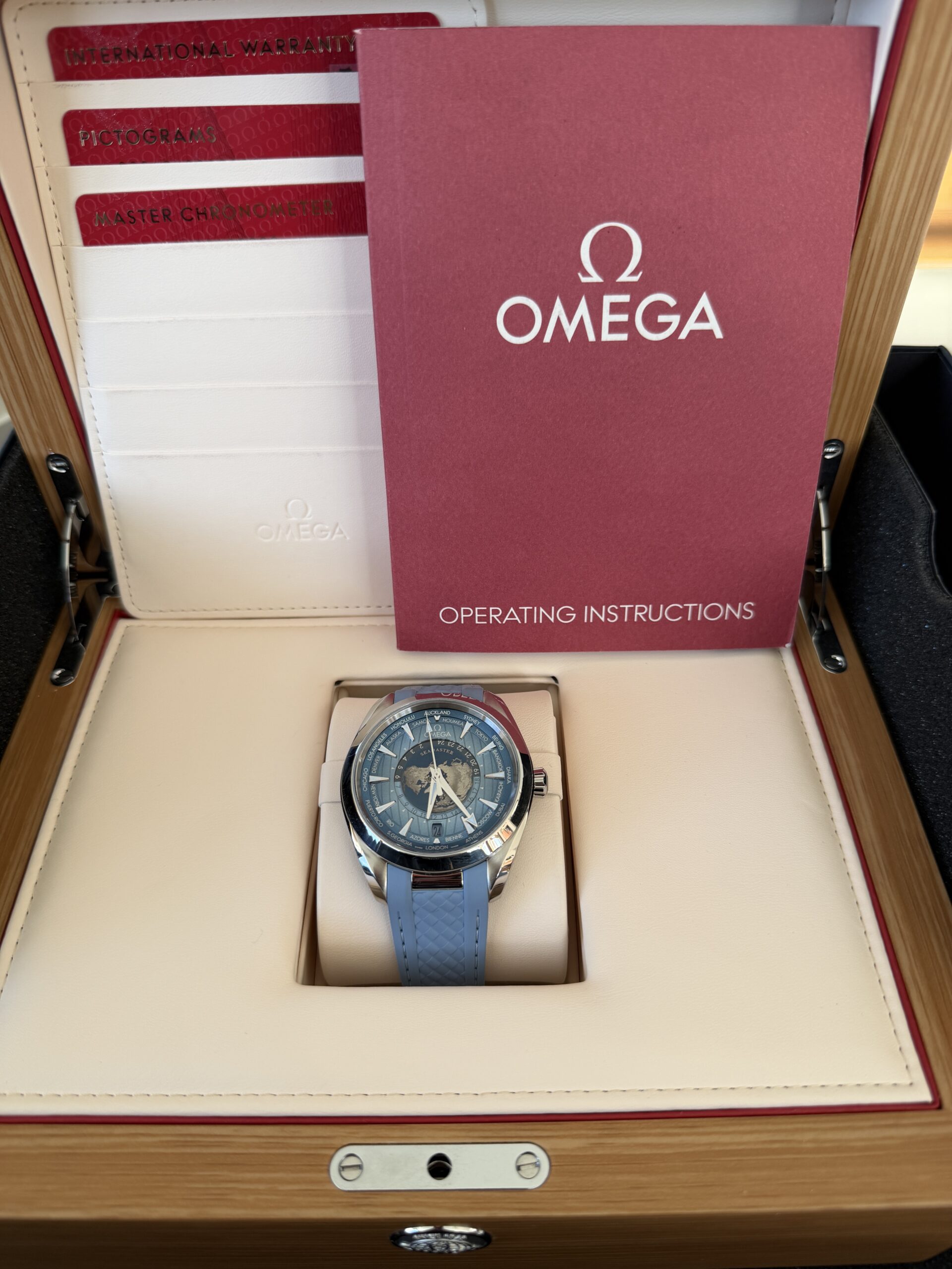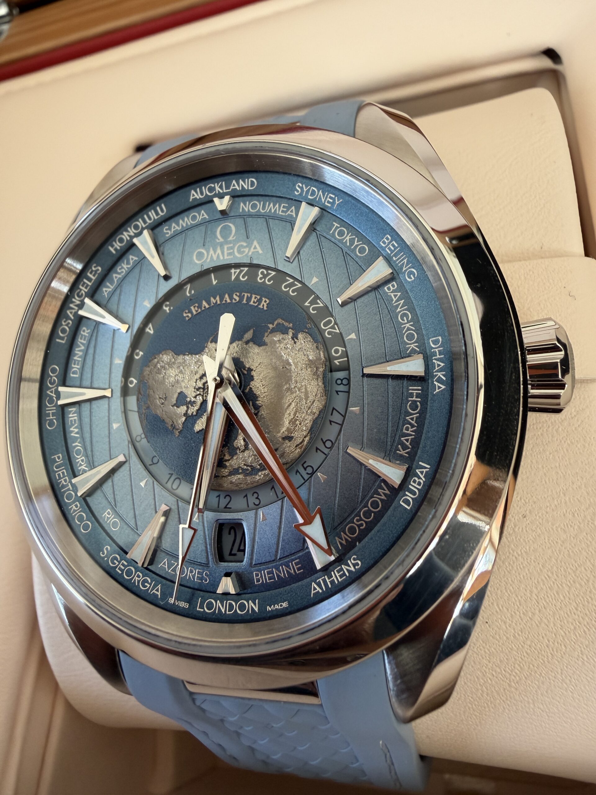 Omega Seamaster Aqua Terra Worldtimer Summer Blue 220.12.43.22.03.002 to połączenie nowoczesnej elegancji, technicznego mistrzostwa i ducha podróży, który od dziesięcioleci definiuje kolekcję Seamaster. Ten wyjątkowy model to zegarek dla mężczyzny nowoczesnego, kosmopolitycznego, który ceni nie tylko doskonałość mechanizmu, ale także wyrafinowaną estetykę i niepowtarzalny charakter. Koperta o średnicy 43 mm, wykonana ze stali nierdzewnej, łączy solidność z elegancją. Jej wyważone proporcje i płynne linie nawiązują do morskiego dziedzictwa marki Omega, a szczotkowane i polerowane powierzchnie tworzą grę świateł, podkreślając sportowo-luksusowy charakter zegarka. Wodoszczelność do 150 metrów sprawia, że model zachowuje pełną funkcjonalność w każdych warunkach — od biura po oceaniczne głębiny. Sercem zegarka jest tarcza w hipnotyzującym odcieniu Summer Blue, ozdobiona pionowym wzorem „teak”, inspirowanym pokładami jachtów. W centralnej części znajduje się trójwymiarowa mapa świata, grawerowana laserowo na tytanowym dysku w odcieniach niebieskiego — prawdziwe dzieło sztuki mikromechanicznej. Wokół niej rozmieszczono pierścień z nazwami miast reprezentujących strefy czasowe, umożliwiający odczyt czasu na całym globie. Wskazówki i indeksy wypełnione Super-LumiNova zapewniają doskonałą czytelność niezależnie od oświetlenia. Zegarek napędzany jest mechanizmem Omega Co-Axial Master Chronometer 8938, certyfikowanym przez METAS, który gwarantuje najwyższy poziom precyzji, odporności magnetycznej i niezawodności. Mechanizm oferuje rezerwę chodu około 60 godzin, a chroni go stalowy dekiel z wizerunkiem Posejdona zaopatrzonego w trójząb, charakterystycznym dla kolekcji Summer Blue. Model wyposażono w elegancki gumowy pasek w kolorze jasno niebieskim, idealnie komponujący się z tonacją tarczy i dodający zegarkowi sportowego, a zarazem ekskluzywnego charakteru. Omega Seamaster Aqua Terra Worldtimer Summer Blue to nie tylko czasomierz, lecz manifest podróżniczego ducha i nowoczesnego luksusu. Zegarek dla tych, którzy patrzą na świat globalnie — z klasą, precyzją i stylem charakterystycznym dla manufaktury Omega.
