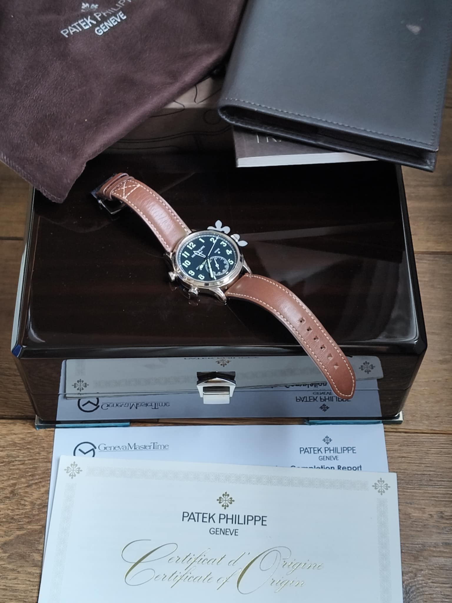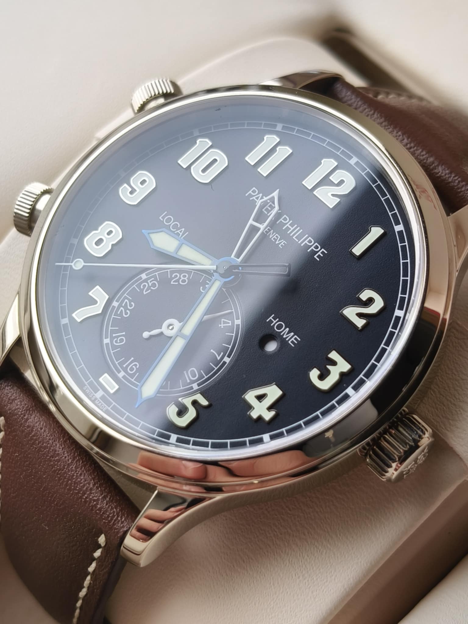 Patek Philippe Travel Time 5524G-001 to wybitny przykład mistrzostwa zegarmistrzowskiego, który redefiniuje pojęcie elegancji w podróży. Ten model, należący do linii Calatrava Pilot Travel Time, stanowi unikalne połączenie inspiracji lotnictwem, tradycyjnego rzemiosła i najwyższej klasy komplikacji zegarkowych – charakterystycznych dla Patek Philippe, jednej z najbardziej prestiżowych manufaktur świata. Zegarek wyróżnia się kopertą o średnicy 42 mm, wykonaną z luksusowego 18-karatowego białego złota, która mimo wyrazistych proporcji pozostaje harmonijna i znakomicie układa się na nadgarstku. Jej zaokrąglone linie i szczotkowane wykończenia nadają czasomierzowi mocny, męski charakter, inspirowany klasycznymi zegarkami pilotów, ale podany w wyrafinowanej, współczesnej formie. Głęboka, granatowa matowa tarcza z dużymi białymi indeksami i cyframi arabskimi w stylu lotniczym zapewnia natychmiastową czytelność – także w ciemności, dzięki pokryciu Super-LumiNova®. Wskazówki typu „syringe” również świecą w ciemności, a druga – pustą w środku – wskazuje czas domowy w funkcji dual time. Model wyposażony jest w zaawansowaną komplikację podwójnej strefy czasowej (Travel Time), pozwalającą łatwo odczytać czas lokalny i domowy za pomocą dwóch niezależnych wskazówek godzinowych. Przyciski umieszczone po lewej stronie koperty umożliwiają szybkie i wygodne przestawienie godziny lokalnej w przód lub w tył – bez wpływu na dokładność chodu. Na godzinie szóstej znajduje się subtarcza datownika zsynchronizowana z czasem lokalnym, a na godzinie dziewiątej i trzeciej – wskazania dnia/nocy dla obu stref czasowych, co znacznie ułatwia orientację w czasie podczas międzynarodowych podróży. Sercem zegarka jest manufakturowy mechanizm automatyczny Calibre 324 S C FUS, widoczny przez szafirowy dekiel. Mechanizm ten charakteryzuje się najwyższą precyzją, pięknym wykończeniem zgodnym ze standardem Patek Philippe Seal oraz rezerwą chodu do 45 godzin. Model 5524G-001 oferuje wodoodporność do 60 metrów, a jego całości dopełnia granatowy pasek ze skóry cielęcej w stylu vintage, przeszyty białą nicią i zakończony klasyczną klamerką z białego złota. Patek Philippe Travel Time 5524G-001 to nie tylko zegarek – to przemyślane narzędzie dla współczesnego globtrotera, który oczekuje doskonałości, funkcjonalności i stylu. Łącząc lotnicze dziedzictwo z ekskluzywną estetyką i wyrafinowaną komplikacją, ten model stanowi bezkompromisowy wybór dla koneserów i kolekcjonerów, którzy wiedzą, czym jest prawdziwa sztuka zegarmistrzowska.