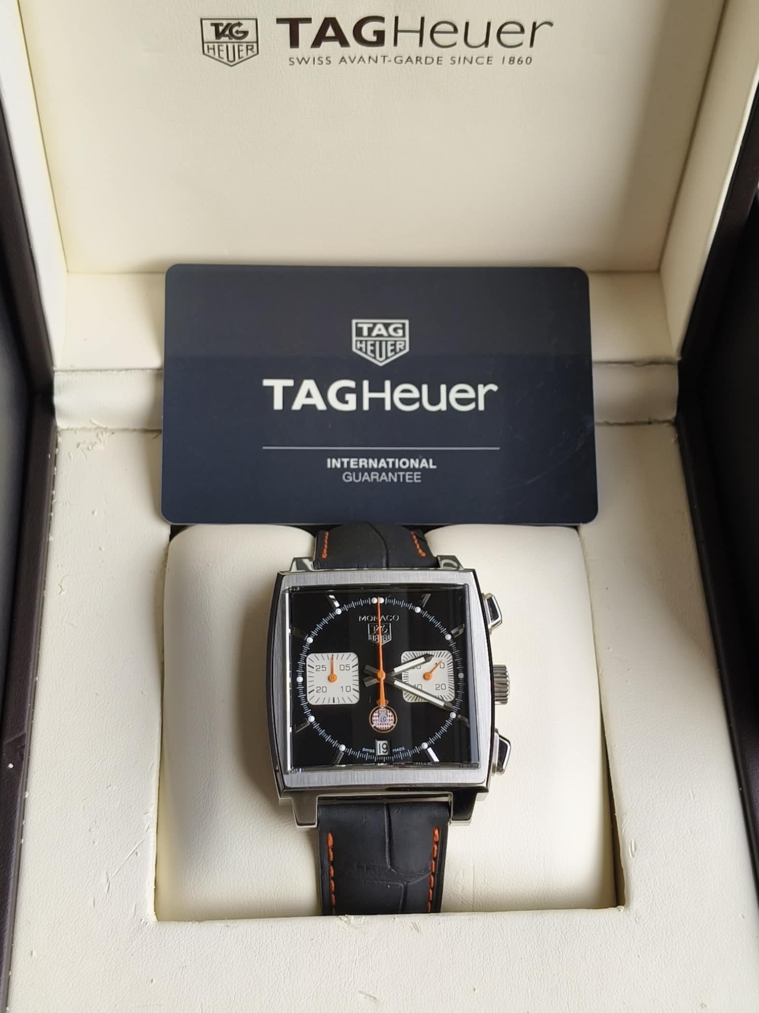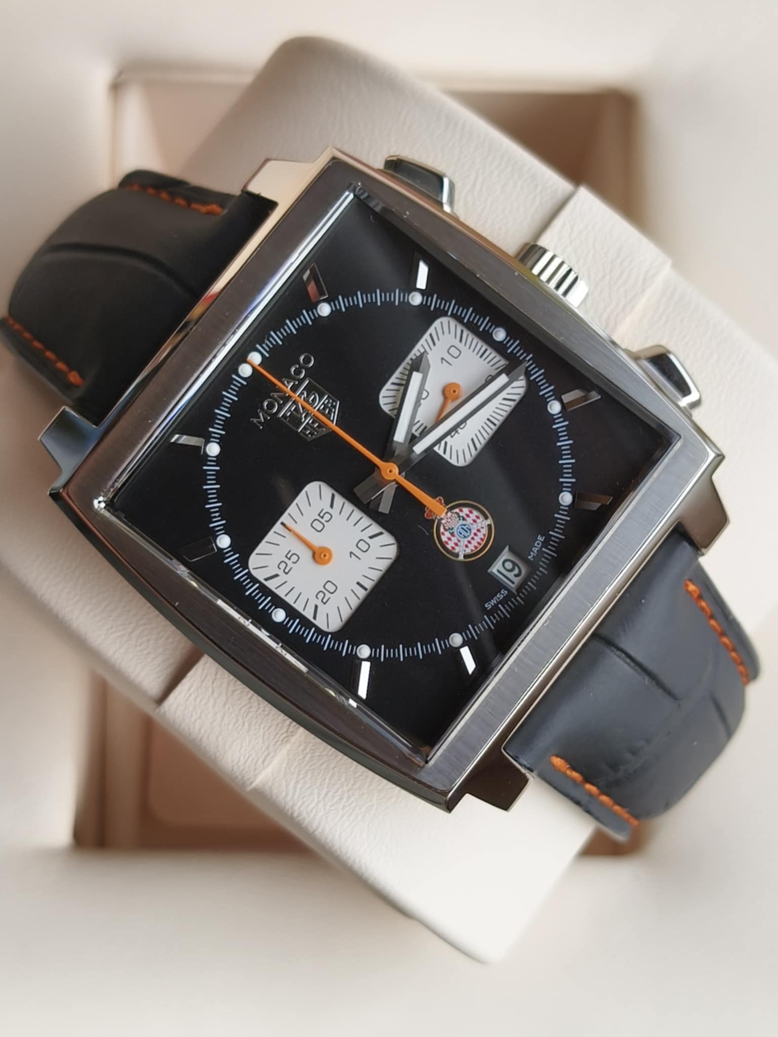 TAG Heuer Monaco Chronograph CAW211K.FC6311 to wyjątkowa edycja kultowego zegarka, który na zawsze odmienił świat zegarmistrzostwa, stając się symbolem odwagi, nowatorstwa i silnych związków z motorsportem. Model ten powstał z okazji 50. rocznicy powstania pierwszego TAG Heuer Monaco z 1969 roku – rewolucyjnego czasomierza, który jako pierwszy na świecie łączył automatyczny chronograf z kwadratową, wodoodporną kopertą. Wydanie CAW211K.FC6311, należące do jednej z pięciu limitowanych serii uświetniających tę rocznicę, inspirowane jest stylistyką lat 80. i zaprojektowane z myślą o kolekcjonerach oraz miłośnikach designu retro. Koperta o wymiarach 39 x 39 mm wykonana została z wysokiej jakości stali nierdzewnej i wykończona eleganckim szczotkowaniem z polerowanymi akcentami, które subtelnie podkreślają geometryczny, awangardowy charakter zegarka. Niezwykła, granatowa tarcza z pionowym szczotkowaniem i kontrastowymi, jasnymi totalizatorami na godzinach 3 i 9 stanowi wyraźne nawiązanie do estetyki vintage, jednocześnie oferując doskonałą czytelność i wyrazisty charakter. Charakterystyczne kwadratowe przyciski chronografu, umieszczone po prawej stronie koperty, podkreślają techniczny charakter modelu, natomiast koronka znajdująca się nietypowo po lewej stronie to ukłon w stronę oryginalnego projektu Monaco z 1969 roku. Indeksy i wskazówki pokryto warstwą luminescencyjną Super-LumiNova®, co zapewnia świetną widoczność w ciemności, a czerwony akcent centralnej wskazówki sekundnika chronografu dodaje sportowej energii. Sercem zegarka jest automatyczny mechanizm Calibre 11, będący współczesną interpretacją jednego z pierwszych automatycznych chronografów. Mechanizm ten pracuje z częstotliwością 28 800 wahnięć na godzinę, oferując około 40 godzin rezerwy chodu i precyzyjne działanie dzięki sprawdzonej architekturze. Przez przeszklony dekiel ze szkła szafirowego można podziwiać pracę mechanizmu oraz wygrawerowane napisy nawiązujące do jubileuszowej edycji. Model ten dostarczany jest na wysokiej jakości pasku wykonanym z granatowej skóry cielęcej z perforacjami w stylu racingowym, które bezpośrednio odwołują się do klasyki wyścigów samochodowych, a zapięcie motylkowe ze stali zapewnia bezpieczeństwo i komfort noszenia. TAG Heuer Monaco CAW211K.FC6311 to czasomierz limitowany do 169 sztuk, co czyni go nie tylko precyzyjnym instrumentem pomiaru czasu, ale także rzadkim kolekcjonerskim artefaktem. Każdy egzemplarz posiada unikalny numer limitacji wygrawerowany na deklu, co potęguje jego ekskluzywność. Z wodoodpornością do 100 metrów (10 barów) i solidną konstrukcją, model ten łączy ducha wyścigów, ikonę designu i dziedzictwo jednej z najważniejszych marek w historii zegarmistrzostwa. To nie tylko hołd dla legendarnego modelu Monaco noszonego przez Steve’a McQueena w filmie „Le Mans”, ale także stylowa deklaracja niezależności i odwagi w podążaniu własną drogą.