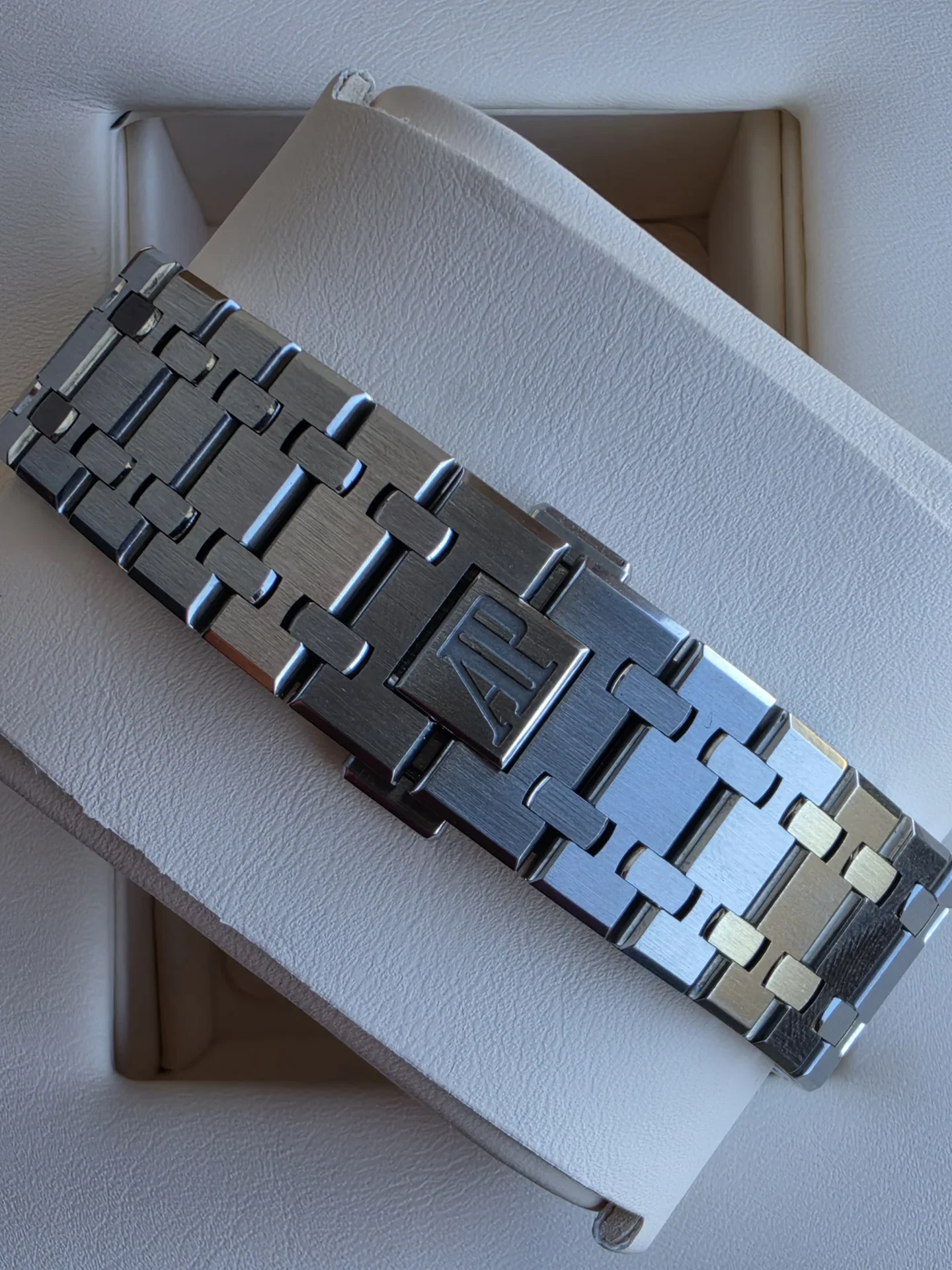 Integralna stalowa bransoleta to jedno z największych osiągnięć projektu Royal Oak — płynnie zintegrowana z kopertą, zapewnia nie tylko wyjątkowy komfort noszenia, ale również niepowtarzalny wygląd. Precyzyjne wykończenie ogniw oraz solidne zapięcie podkreślają luksusowy charakter zegarka.
