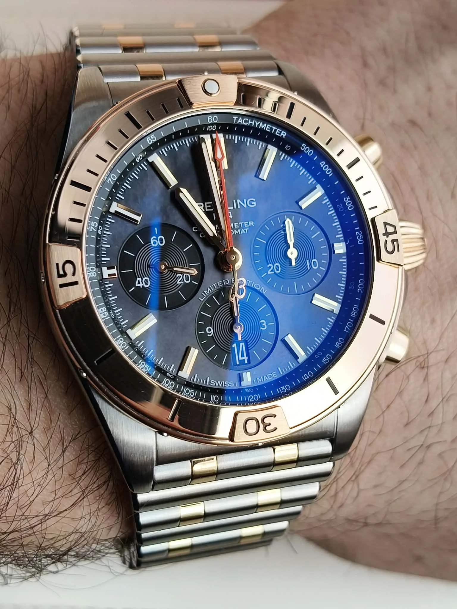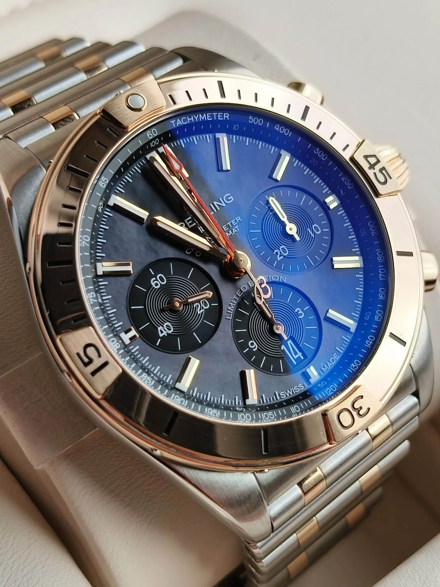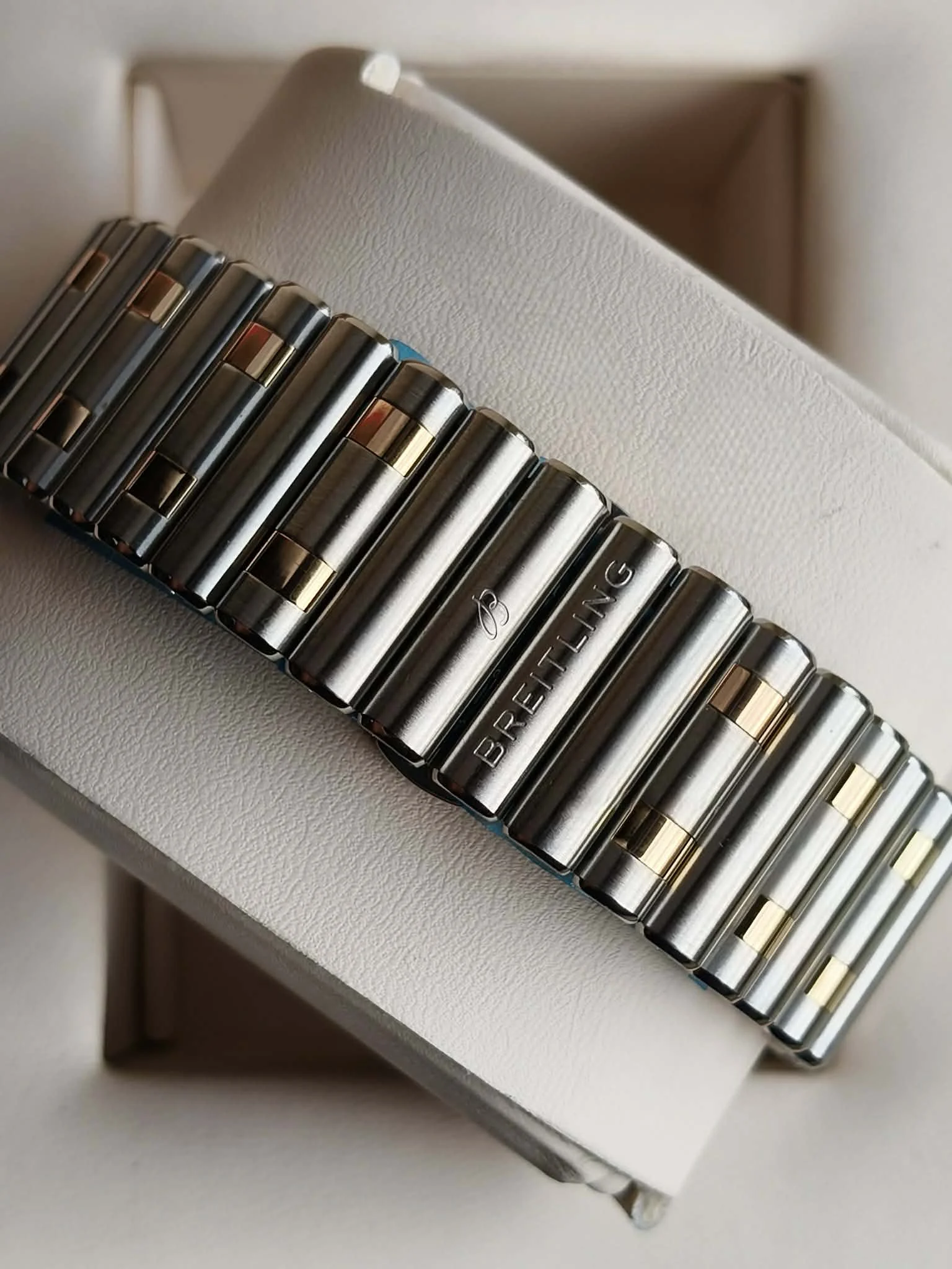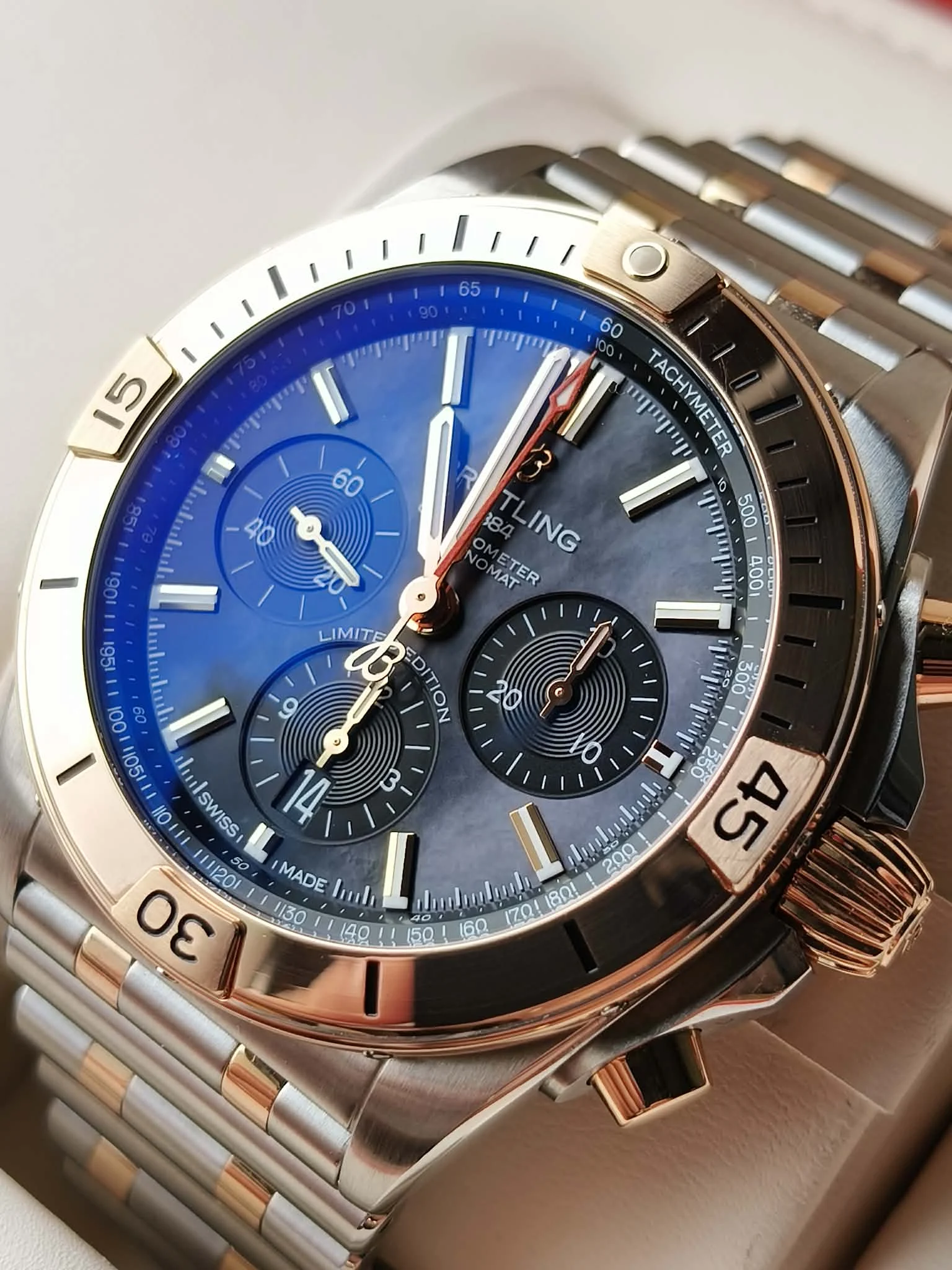 Koperta o średnicy 42 mm została wykonana z wysokiej klasy stali nierdzewnej i 18-karatowego różowego złota, łącząc polerowane i satynowane powierzchnie, które podkreślają sportowo-elegancki charakter modelu. Typowe dla linii Chronomat detale, takie jak rolowana bransoleta „Rouleaux” i charakterystyczne wahadła na lunecie, dodają zegarkowi wyraźnej tożsamości i solidnej prezencji na nadgarstku. Wodoszczelność do 200 metrów gwarantuje, że zegarek radzi sobie nie tylko w codziennym użytkowaniu, ale również podczas kontaktu z wodą.