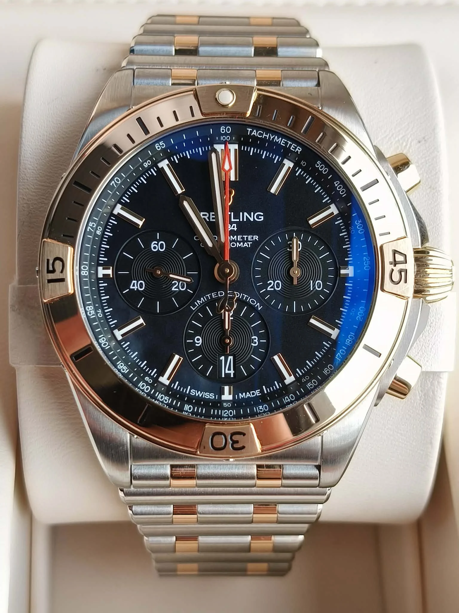 Breitling Chronomat B01 42 Limited Edition UB01341A1B1U1 — dynamiczny i luksusowy chronograf o silnym charakterze, łączący techniczną doskonałość z elegancją klasycznego sportowego zegarka. To propozycja dla mężczyzny, który oczekuje od czasomierza nie tylko wysokiej precyzji i wszechstronnej funkcjonalności, ale także stylu, który robi wrażenie zarówno w codziennych sytuacjach, jak i podczas bardziej formalnych okazji.