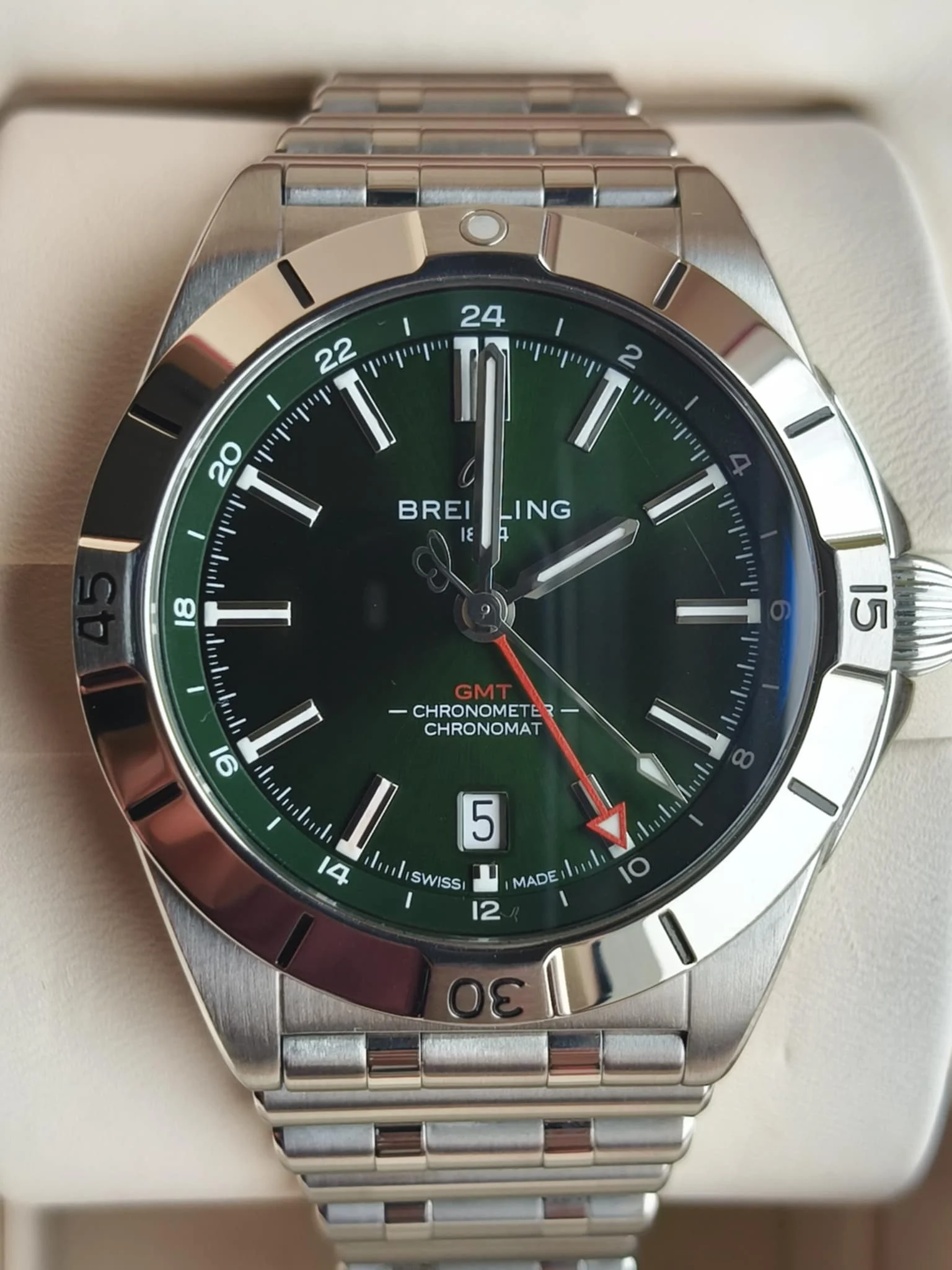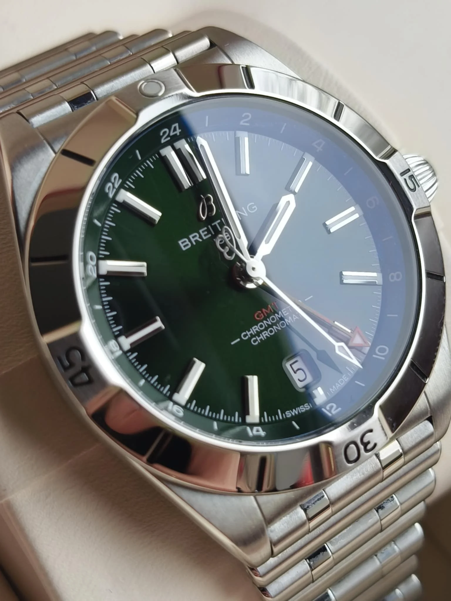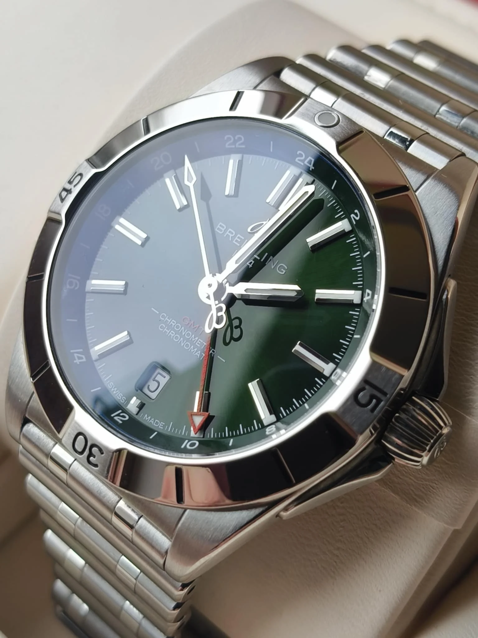 Tarcza w głębokim odcieniu zielonego tworzy eleganckie tło dla czytelnych wskazań. Indeksy oraz wskazówki wypełniono świecącą substancją Super-LumiNova, co gwarantuje doskonałą czytelność nawet przy słabym świetle. Centralne wskazówki odpowiadają za godziny, minuty i sekundy, a dodatkowa wskazówka GMT pozwala śledzić drugą strefę czasową — funkcja szczególnie praktyczna dla osób często podróżujących lub prowadzących międzynarodowe spotkania.