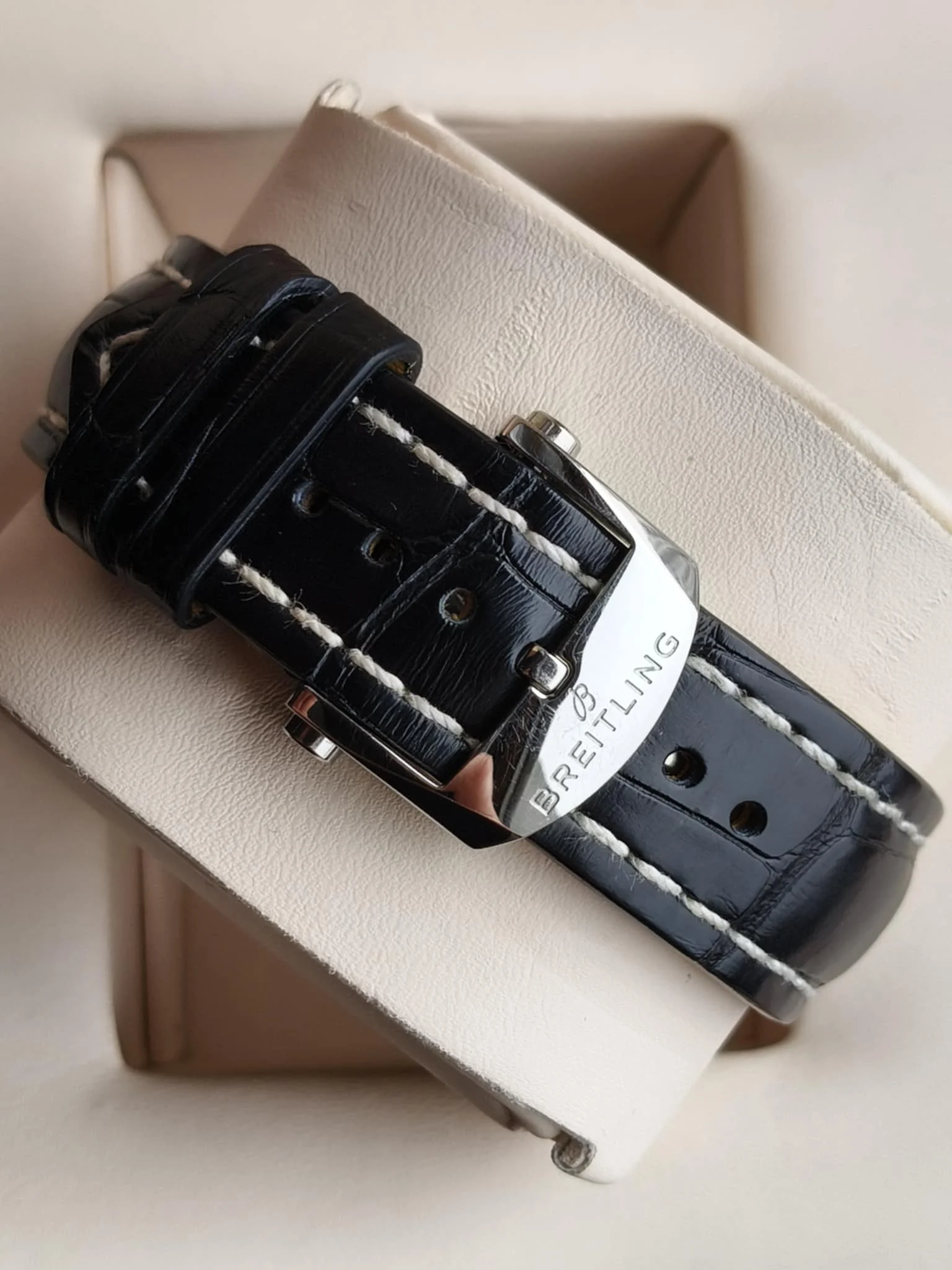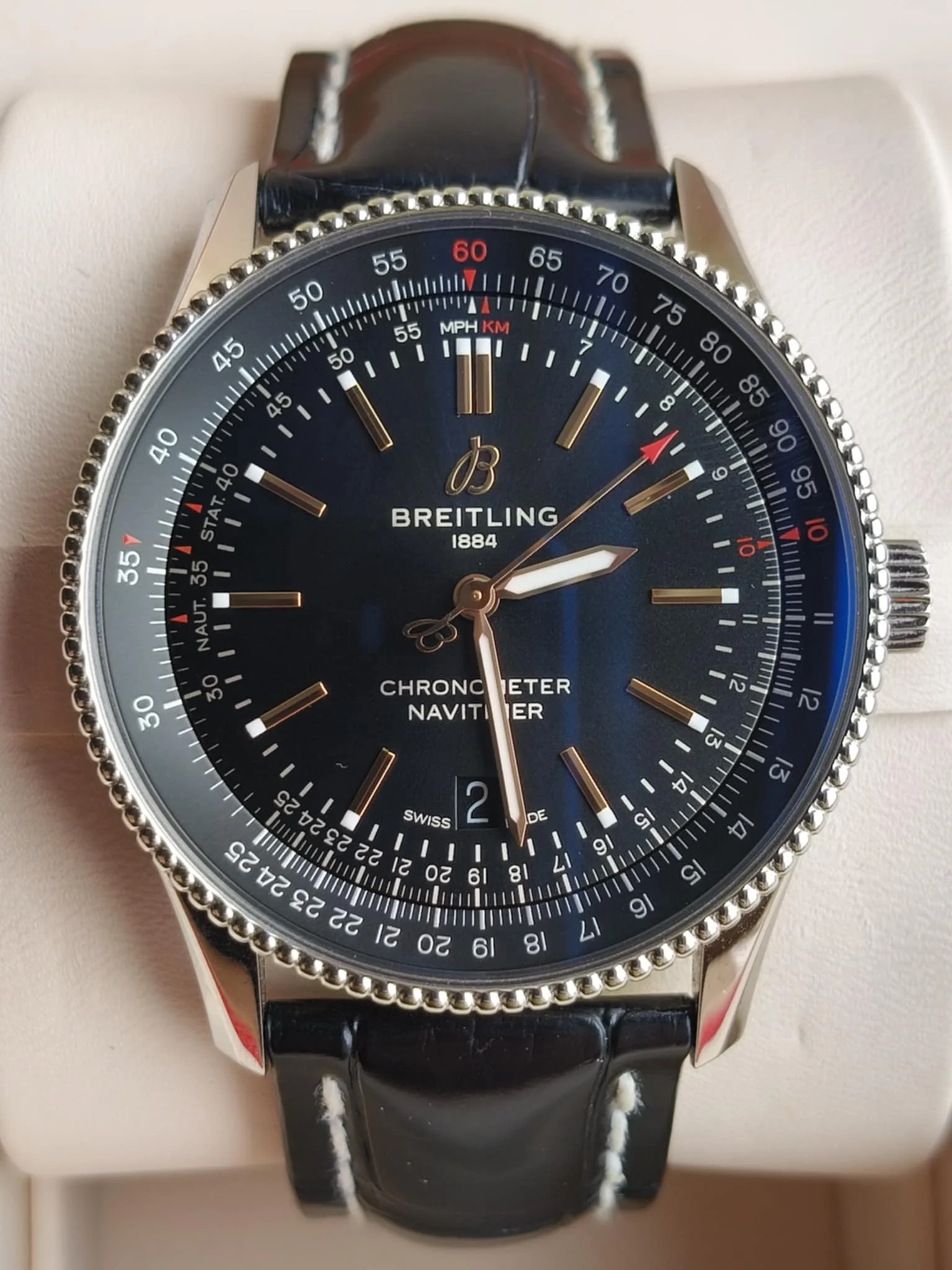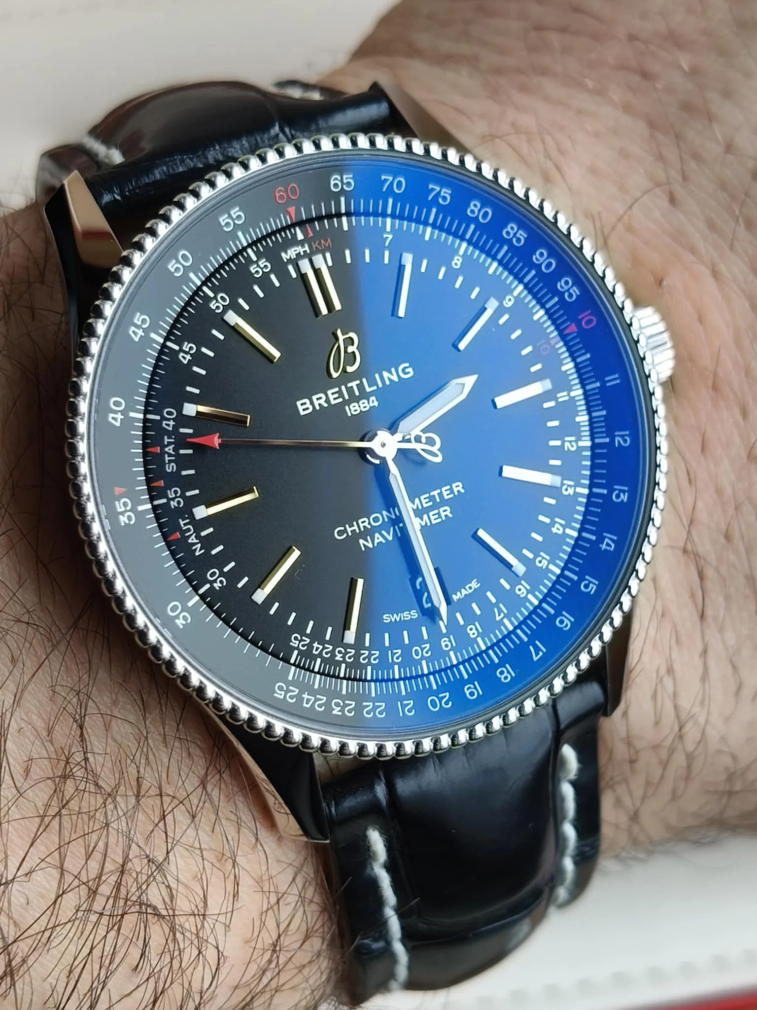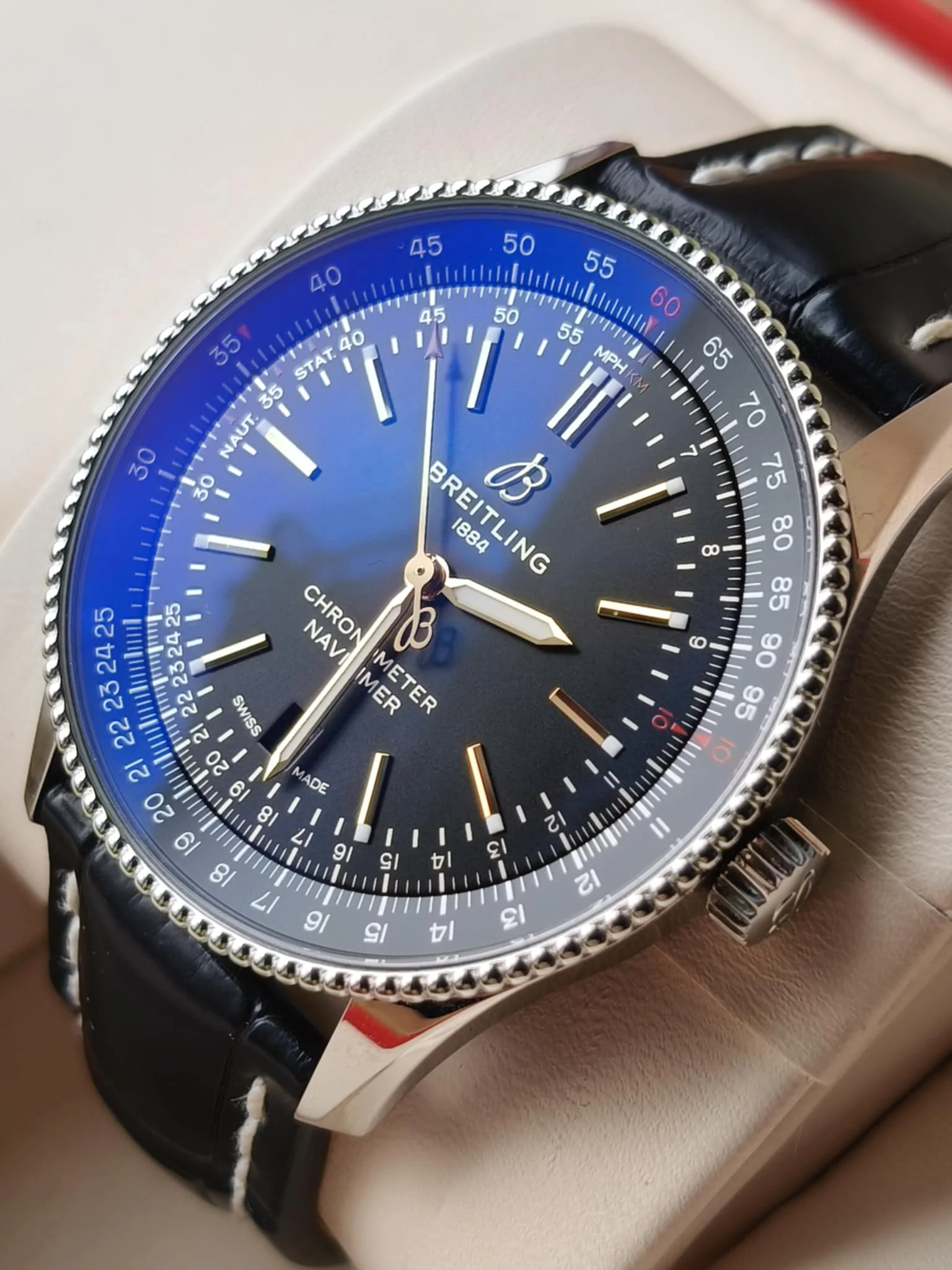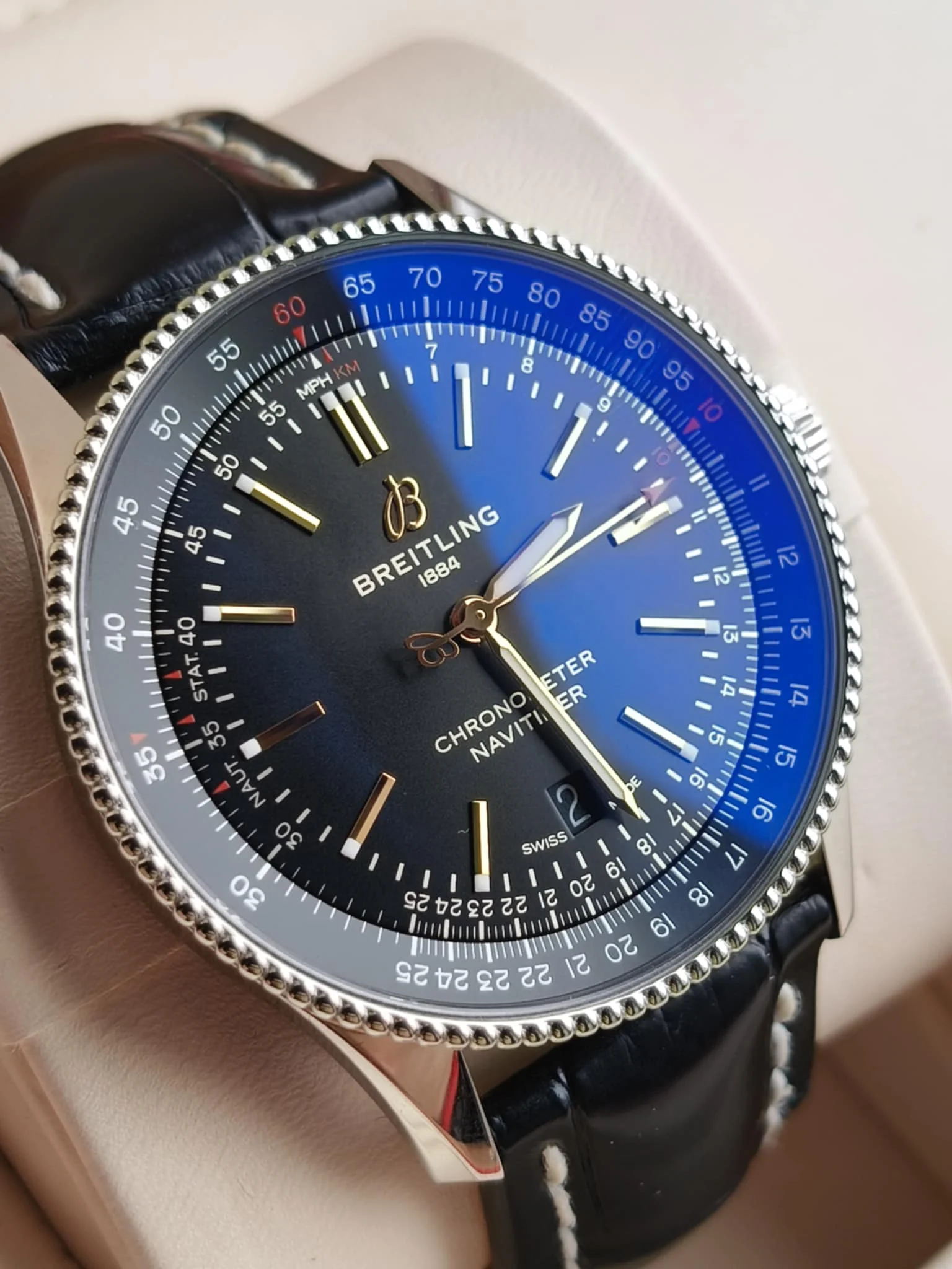 Czarna tarcza stanowi klasyczne tło dla legendarnej, okrągłej skali logarytmicznej (slide rule), będącej znakiem rozpoznawczym kolekcji Navitimer od lat 50. XX wieku. Umożliwia ona wykonywanie obliczeń nawigacyjnych, takich jak prędkość, dystans czy zużycie paliwa — funkcji szczególnie cenionych przez pilotów. Nakładane indeksy godzinowe oraz wskazówki wypełnione substancją luminescencyjną Super-LumiNova zapewniają bardzo dobrą czytelność zarówno w dzień, jak i w słabszym oświetleniu. Datownik dyskretnie umieszczony na godzinie 6 zachowuje symetrię tarczy i podkreśla jej uporządkowany charakter.
