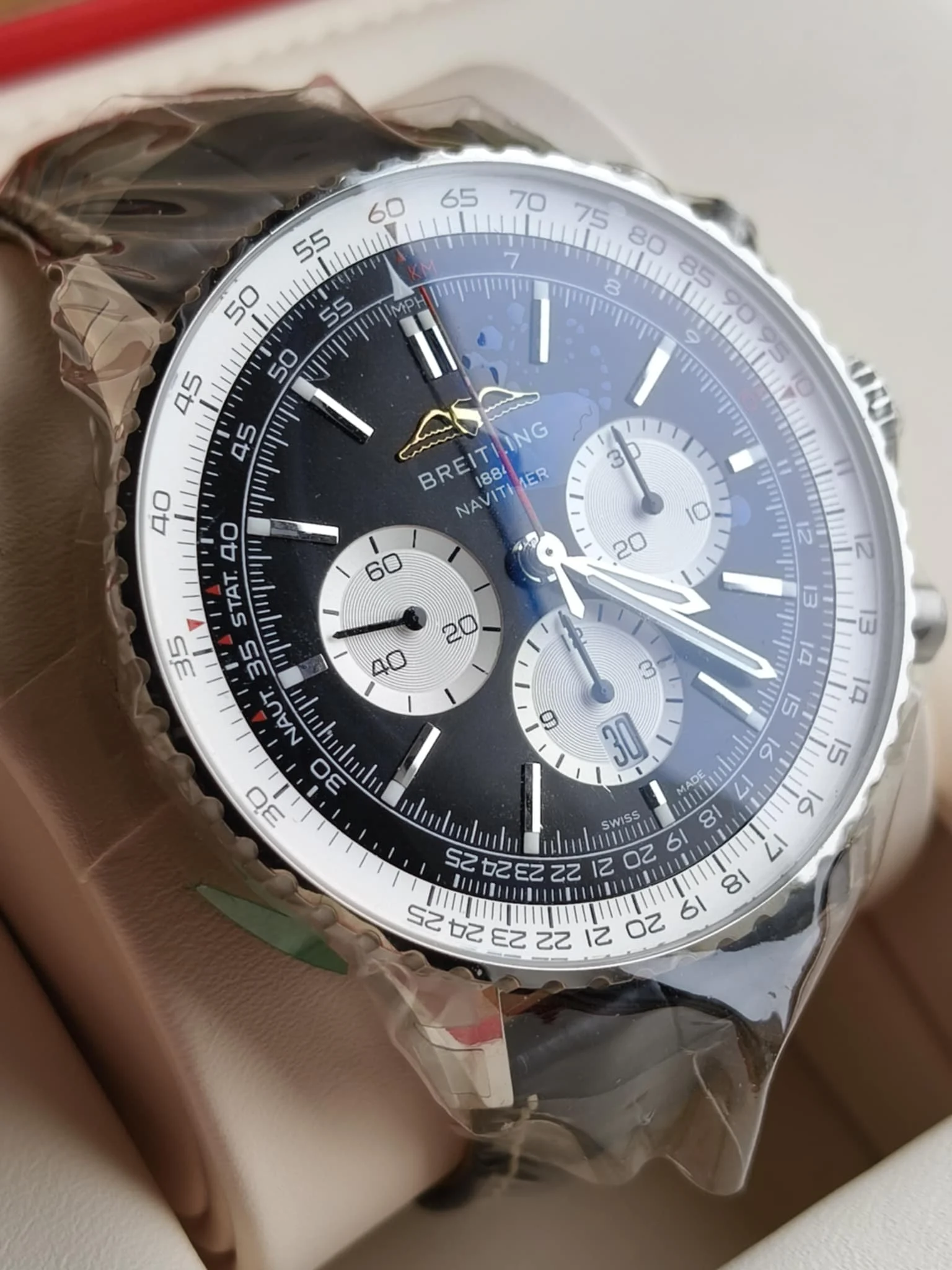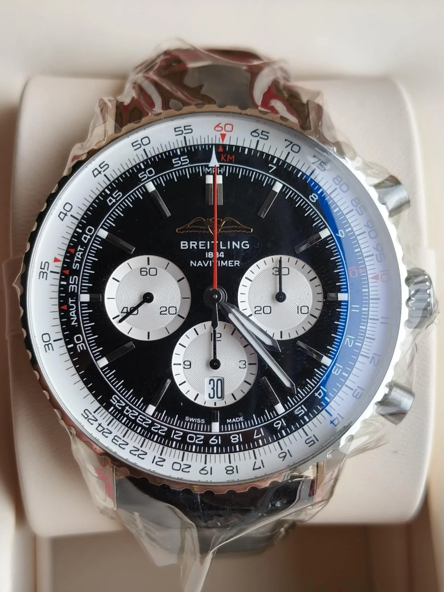 Czarna tarcza z kontrastowymi licznikami chronografu i kultowym suwakiem logarytmicznym, umożliwiającym wykonywanie złożonych obliczeń nawigacyjnych, tworzy niepowtarzalny, profesjonalny wygląd. Sercem zegarka jest manufakturowy mechanizm Breitling B01 z automatycznym naciągiem, który gwarantuje wyjątkową precyzję, 70-godzinną rezerwę chodu oraz certyfikat chronometru COSC.