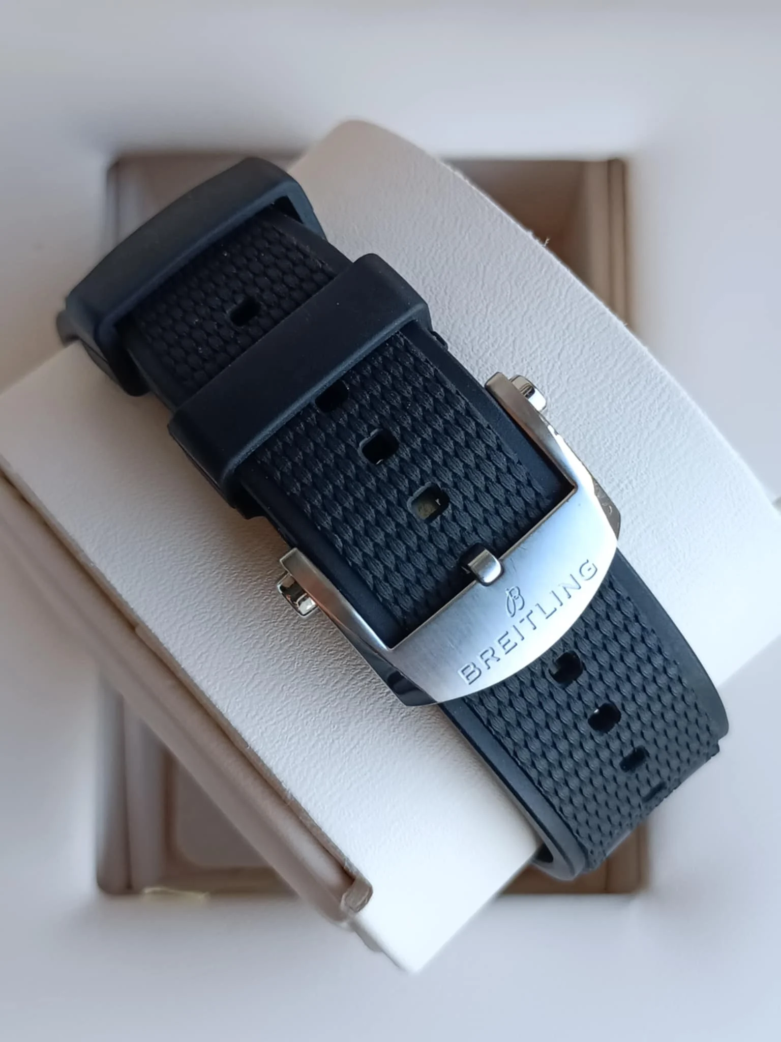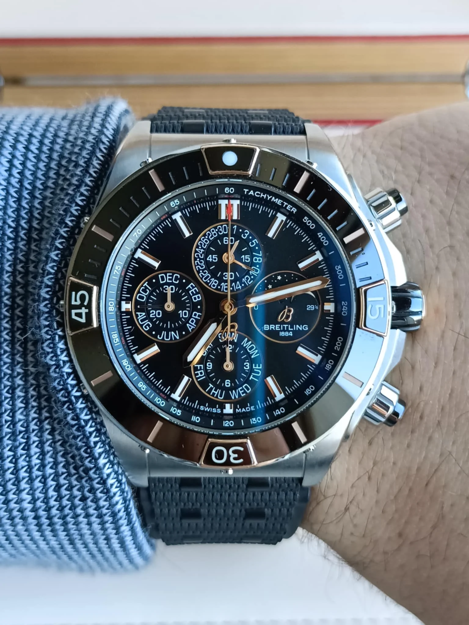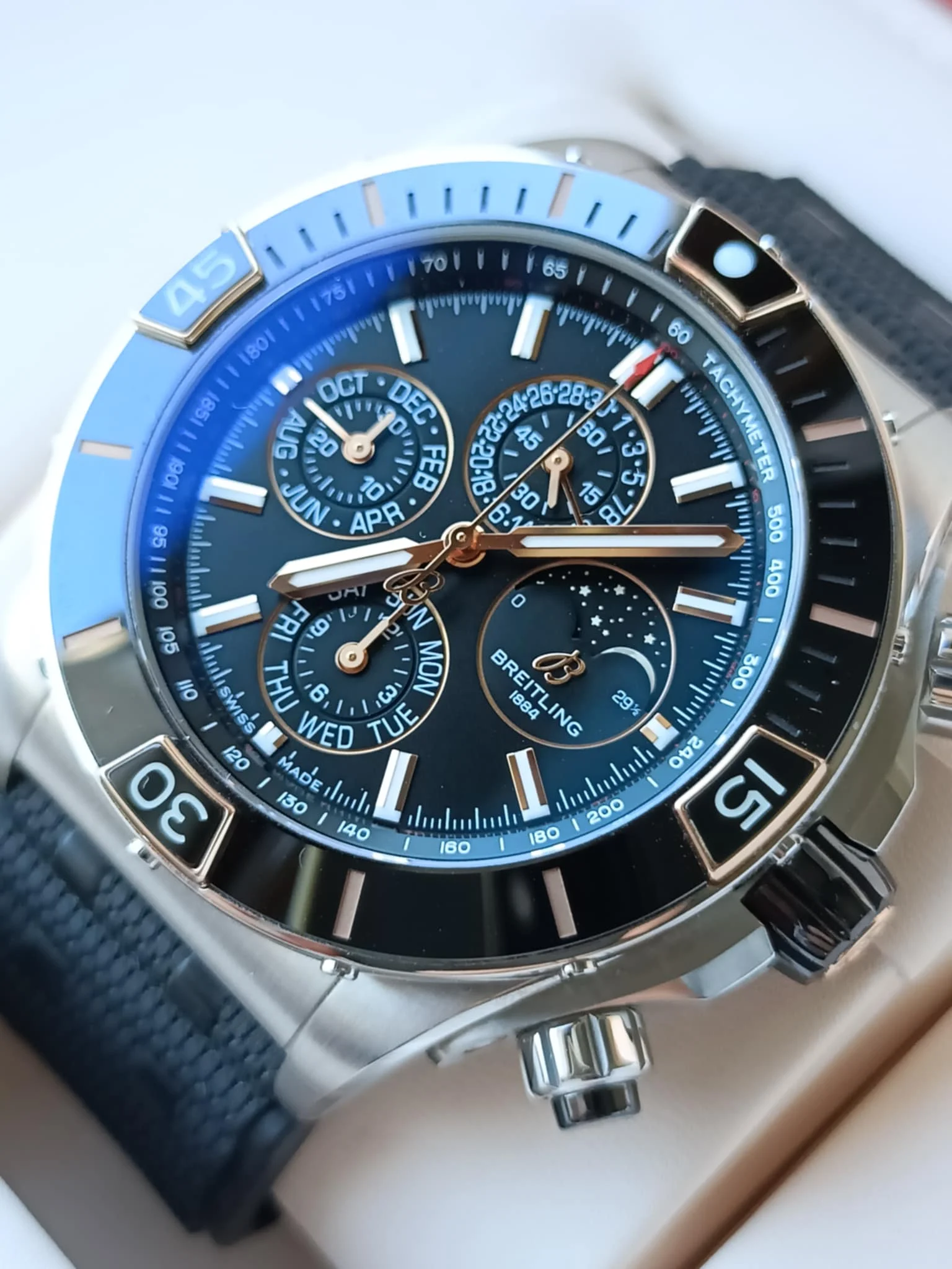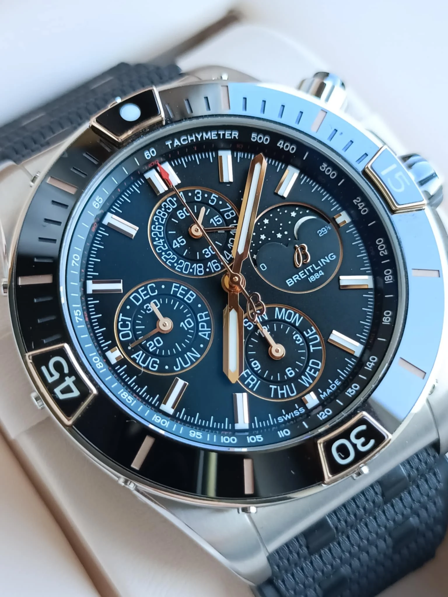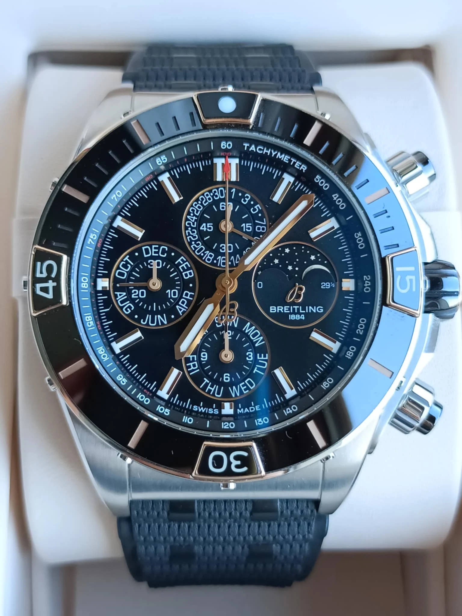 Breitling Super Chronomat 44 Four-Year Calendar (I19320251B1S1) to wyjątkowy zegarek, który łączy zaawansowaną technologię zegarmistrzowską z odważnym, sportowym designem.Jego półwieczny kalendarz, solidna konstrukcja i wyjątkowa estetyka sprawiają, że jest to wyjątkowy wybór dla miłośników zegarków poszukujących zarówno funkcjonalności, jak i stylu. Ten model jest częścią kolekcji Super Chronomat firmy Breitling, która czerpie inspirację z oryginalnego Chronomatu z lat 80. stworzonego dla eskadr akrobacyjnych. Posiada kilka ceramicznych wstawek — na pierścieniu, przyciskach chronografu i koronce — a także gumowy pasek inspirowany Rouleaux, dzięki czemu jest on zarówno sportowym zegarkiem, jak i eleganckim.