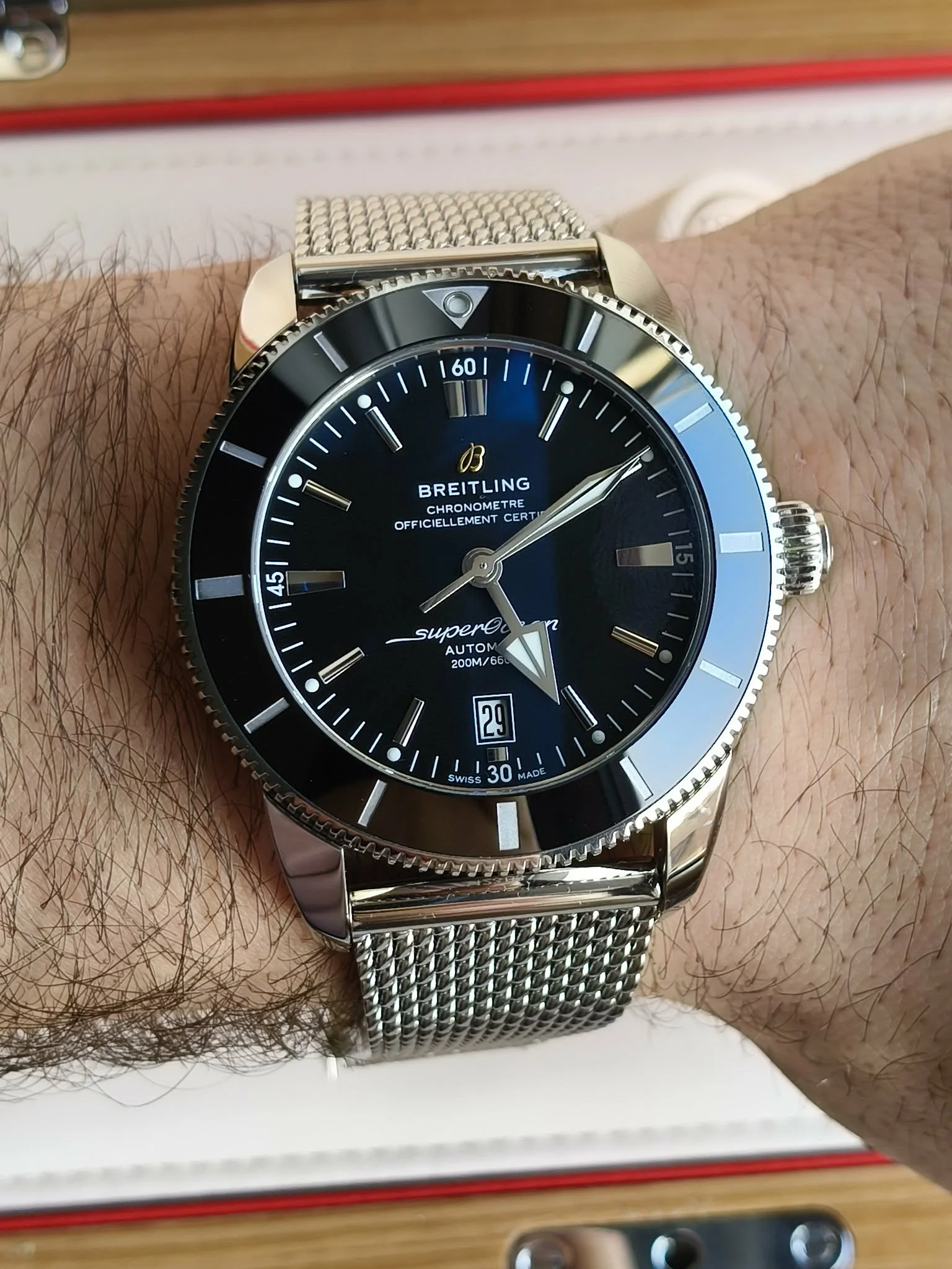 Koperta o średnicy 46 mm wykonana została z wysokogatunkowej stali szlachetnej, a jej minimalistyczne, czyste linie zdradzają ducha pierwotnych, legendarnych modeli Breitlinga. Polerowane powierzchnie połyskują niczym tafla wody w pełnym słońcu, a smukłe, subtelnie zaokrąglone profilowania tworzą sylwetkę, która emanuje elegancją, ale zachowuje narzędziowy charakter. To konstrukcja, która równie pewnie prezentuje się przy marynarkach, jak i w towarzystwie neoprenu czy sportowego stroju — ponadczasowa, uniwersalna, prawdziwie męska. Jednym z najbardziej rozpoznawalnych elementów Superocean Heritage jest jego ceramiczny bezel o idealnie gładkiej, lustrzanej powierzchni. W tym modelu utrzymany w głębokiej, klasycznej czerni, nadaje zegarkowi intensywnego, niemal hipnotycznego wyrazu. Minimalistyczna skala i charakterystyczny kształt wskazówki minutowej nawiązują do pierwowzoru z 1957 roku, łącząc estetykę mid-century z nowoczesnymi materiałami i precyzją.