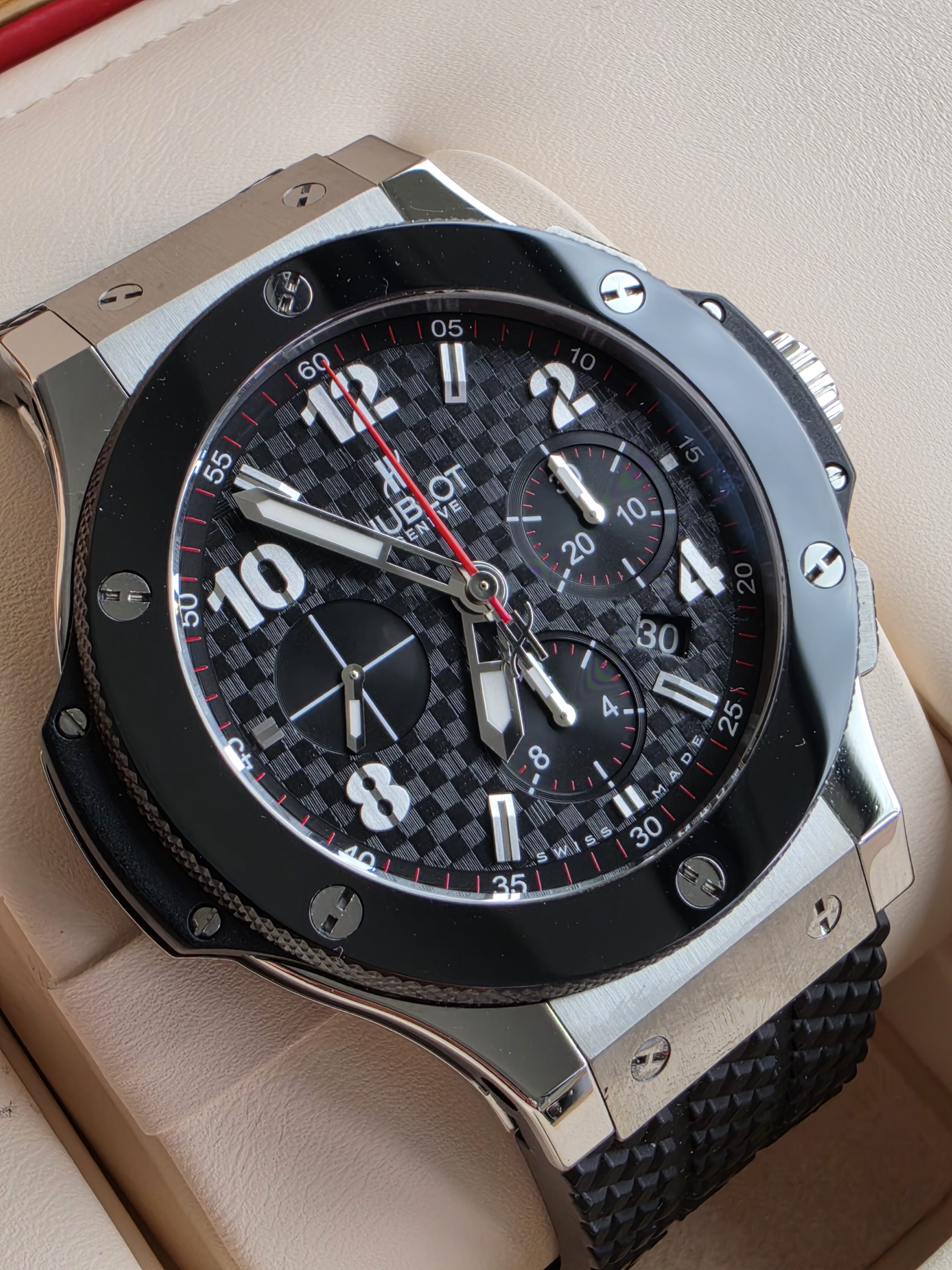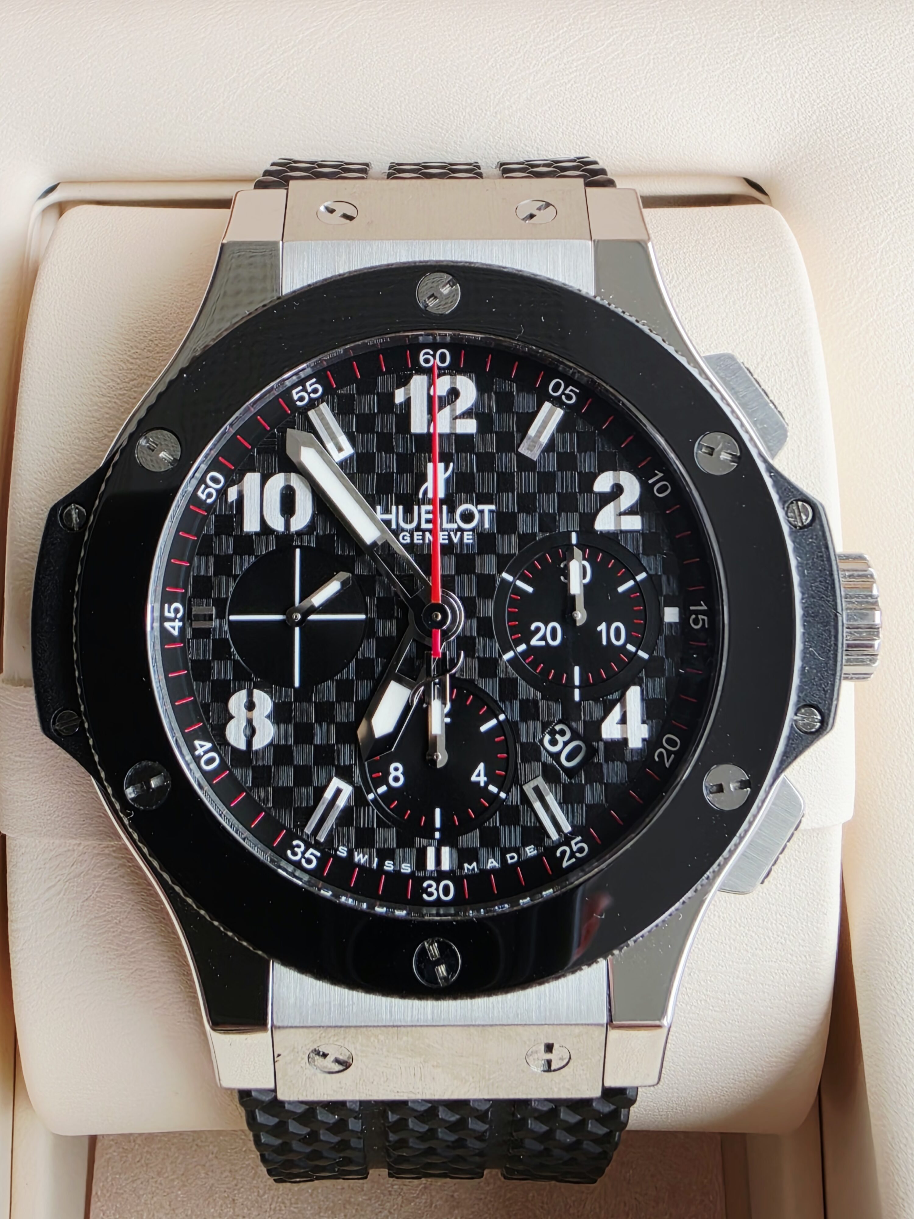 Koperta o średnicy 44 mm została wykonana ze stali nierdzewnej z wykończeniem szczotkowanym i polerowanym, co nadaje jej dynamicznej głębi. Charakterystyczna luneta z czarnej ceramiki, przytwierdzona sześcioma tytanowymi śrubami w kształcie litery H, stanowi jeden z najbardziej rozpoznawalnych elementów stylistycznych kolekcji Big Bang. Zastosowanie kontrastujących materiałów podkreśla nowoczesny, industrialny charakter zegarka, będący znakiem rozpoznawczym marki. Szkło szafirowe z powłoką antyrefleksyjną zapewnia wysoką czytelność, a wodoszczelność do 100 metrów potwierdza jego sportowe możliwości.