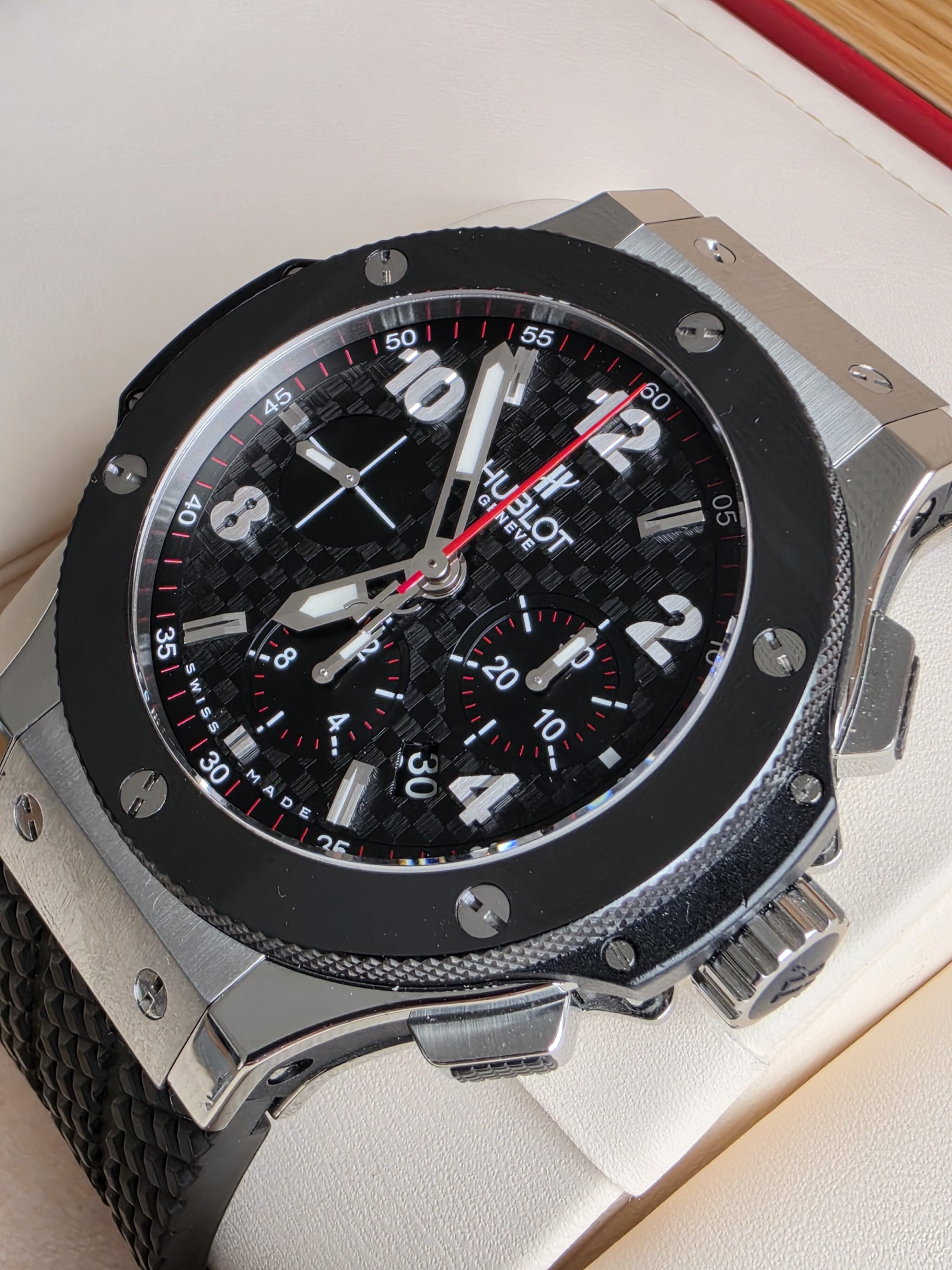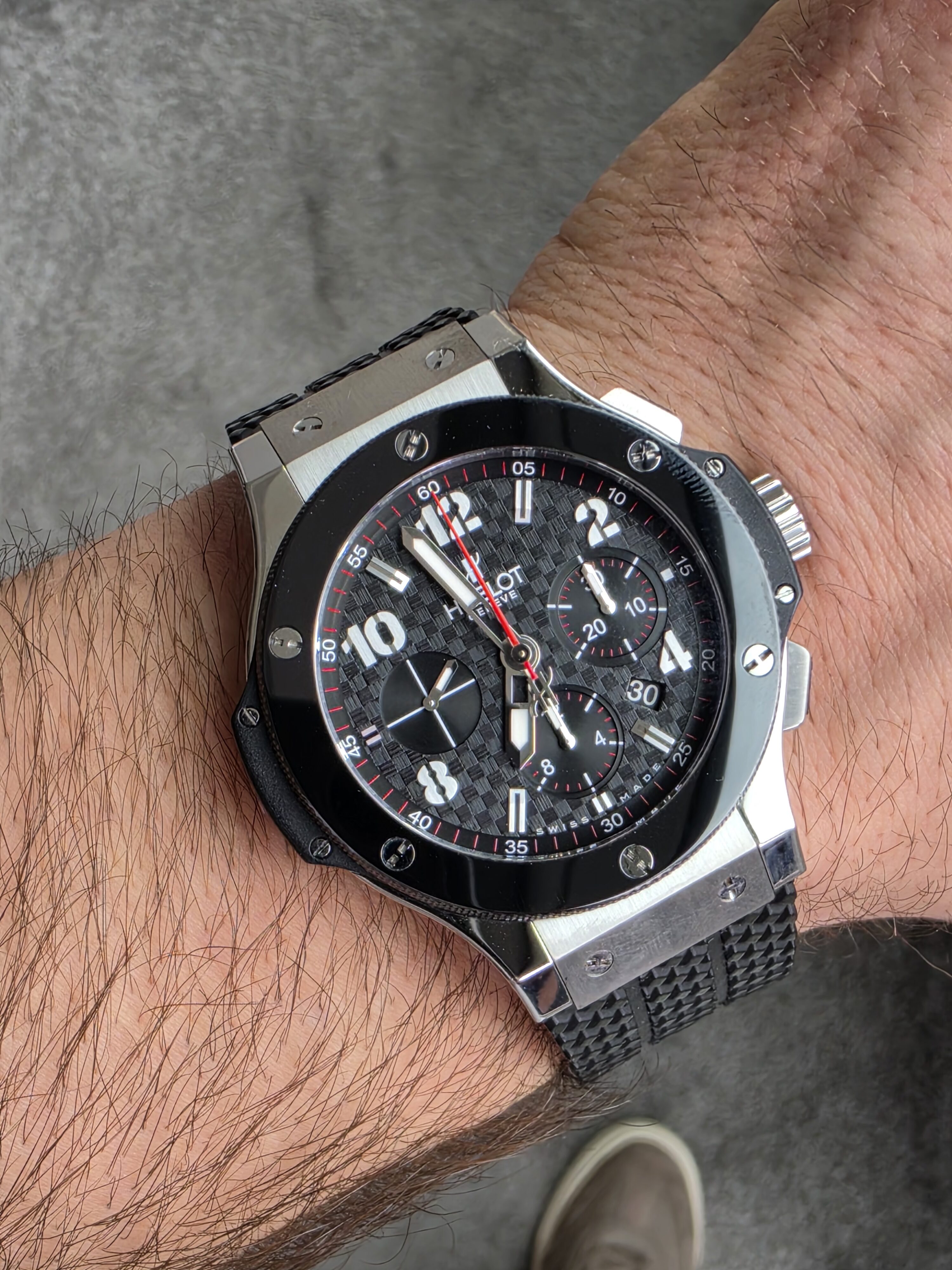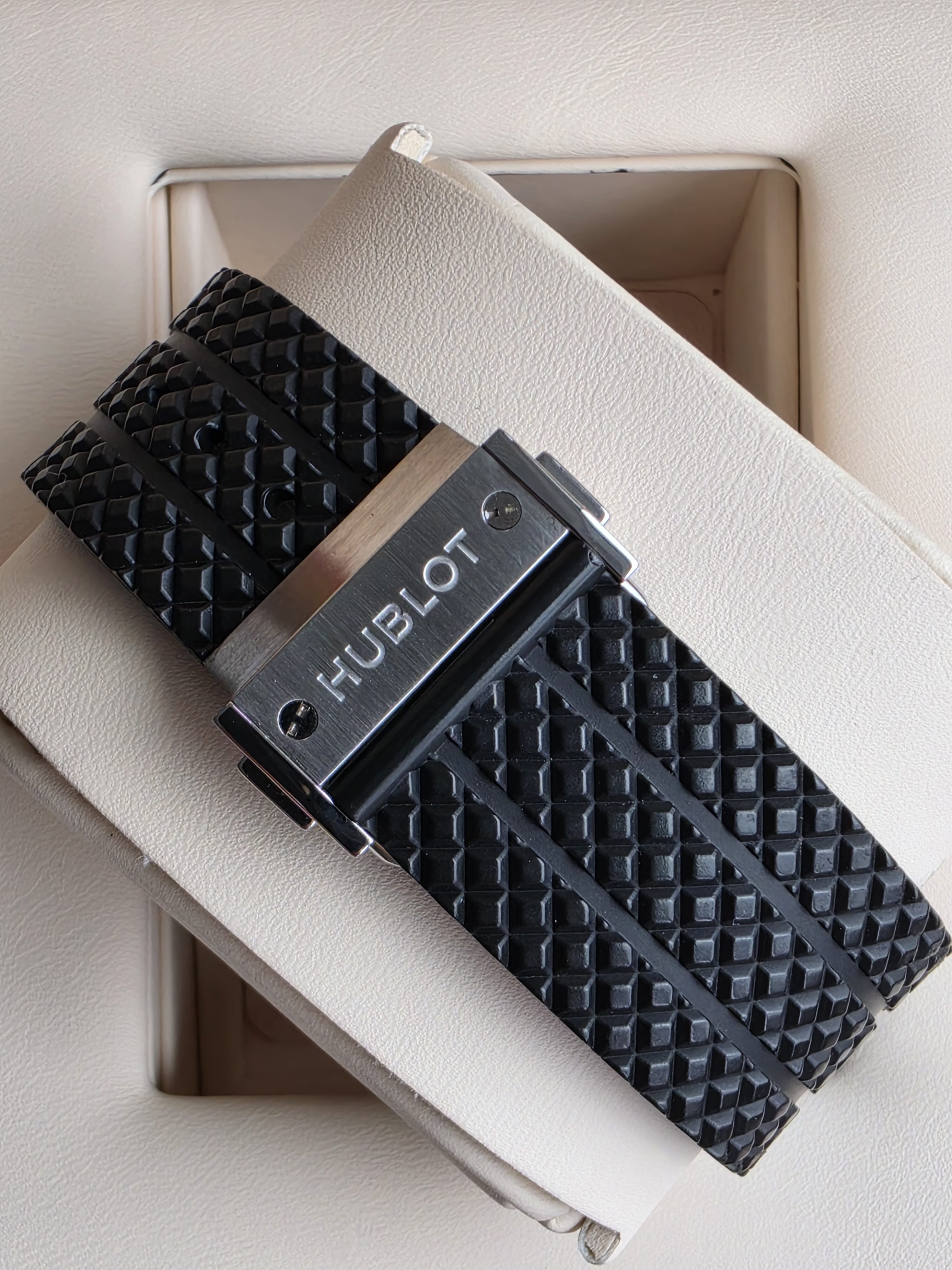 Pełny design uzupełnia czarny, strukturalny pasek kauczukowy — jeden z najbardziej charakterystycznych elementów zegarków Hublot. Zapewnia on wysoki komfort noszenia oraz sportowy wygląd, idealnie współgrający z masywną kopertą. Zapięcie motylkowe wykonane ze stali gwarantuje bezpieczeństwo i wygodę użytkowania.