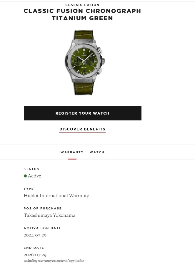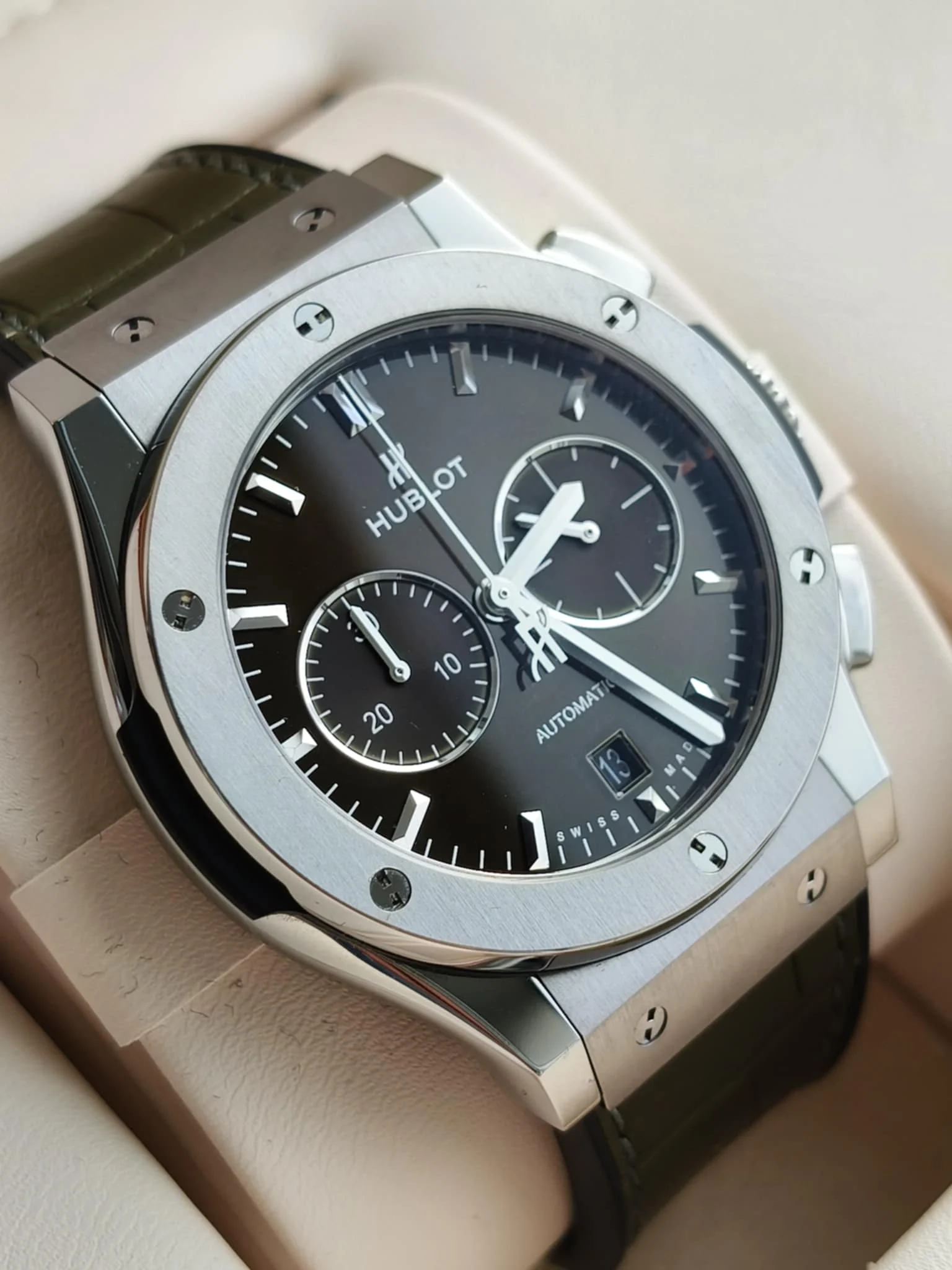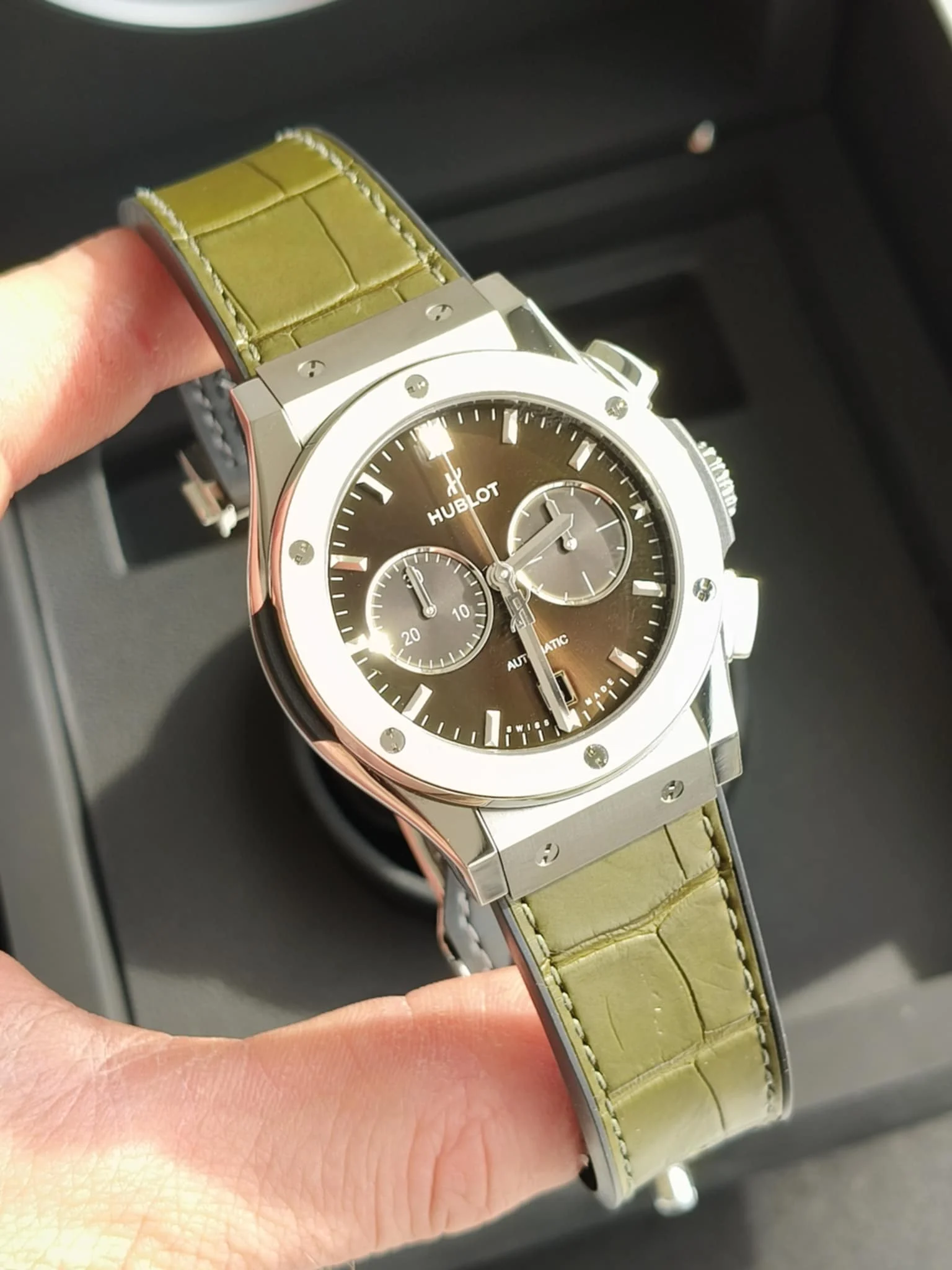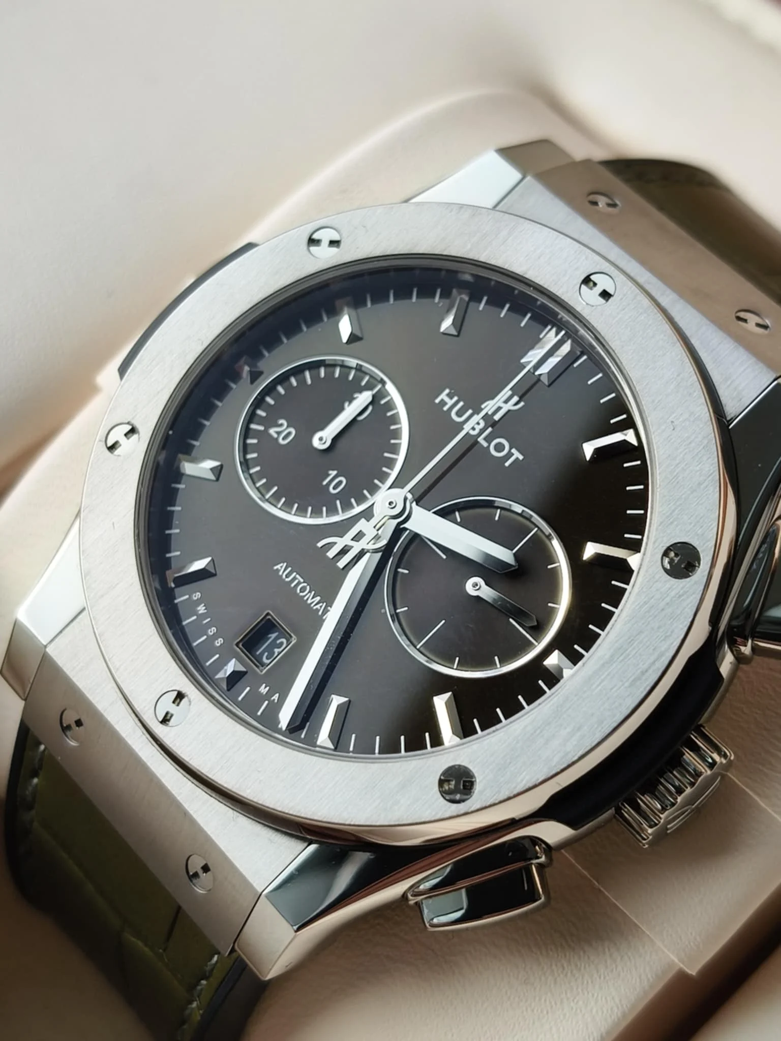 Zielona tarcza o matowym wykończeniu emanuje prostotą i czytelnością. Dwa subtarcze chronografu zostały rozmieszczone symetrycznie, zachowując idealną równowagę pomiędzy funkcjonalnością a estetyką. Smukłe wskazówki oraz indeksy godzinowe, pokryte powłoką luminescencyjną, zapewniają doskonałą widoczność w każdych warunkach, a subtelne logo Hublot dopełnia całość bez narzucania się formą. To tarcza, która mówi językiem nowoczesnej elegancji — czysta, techniczna i ponadczasowa.