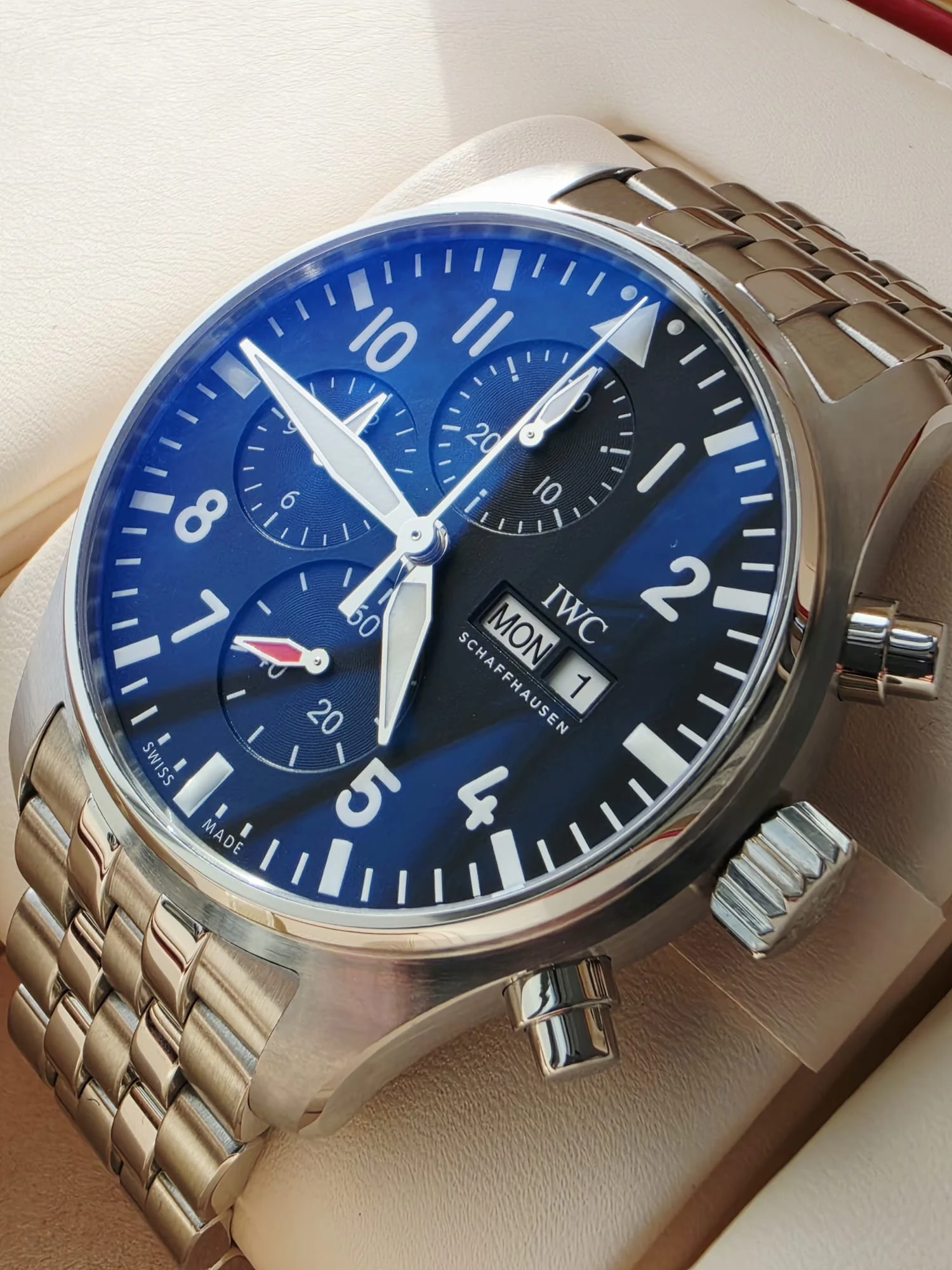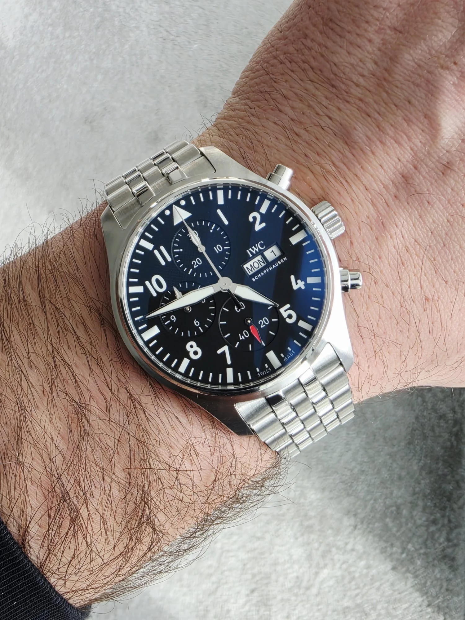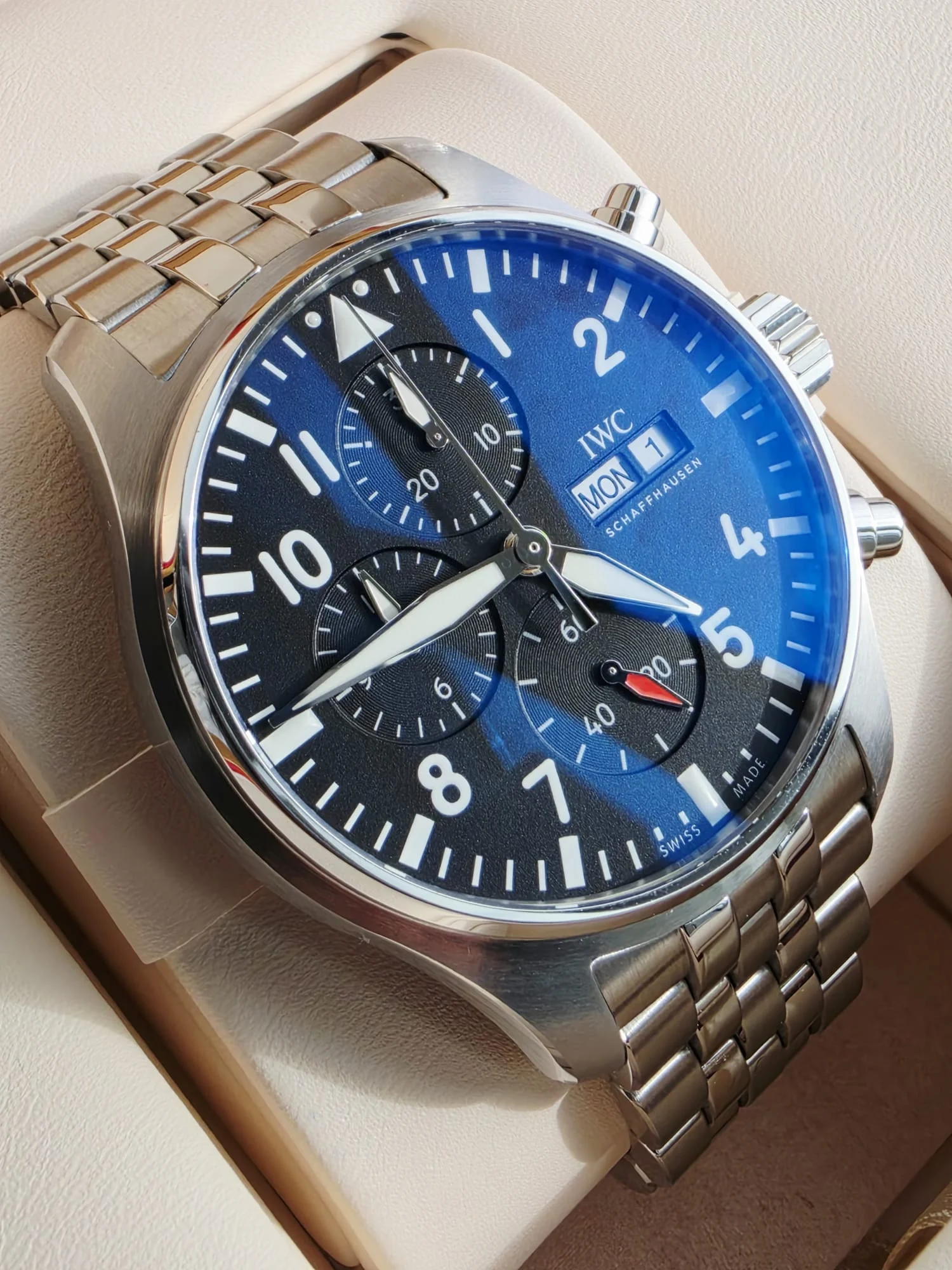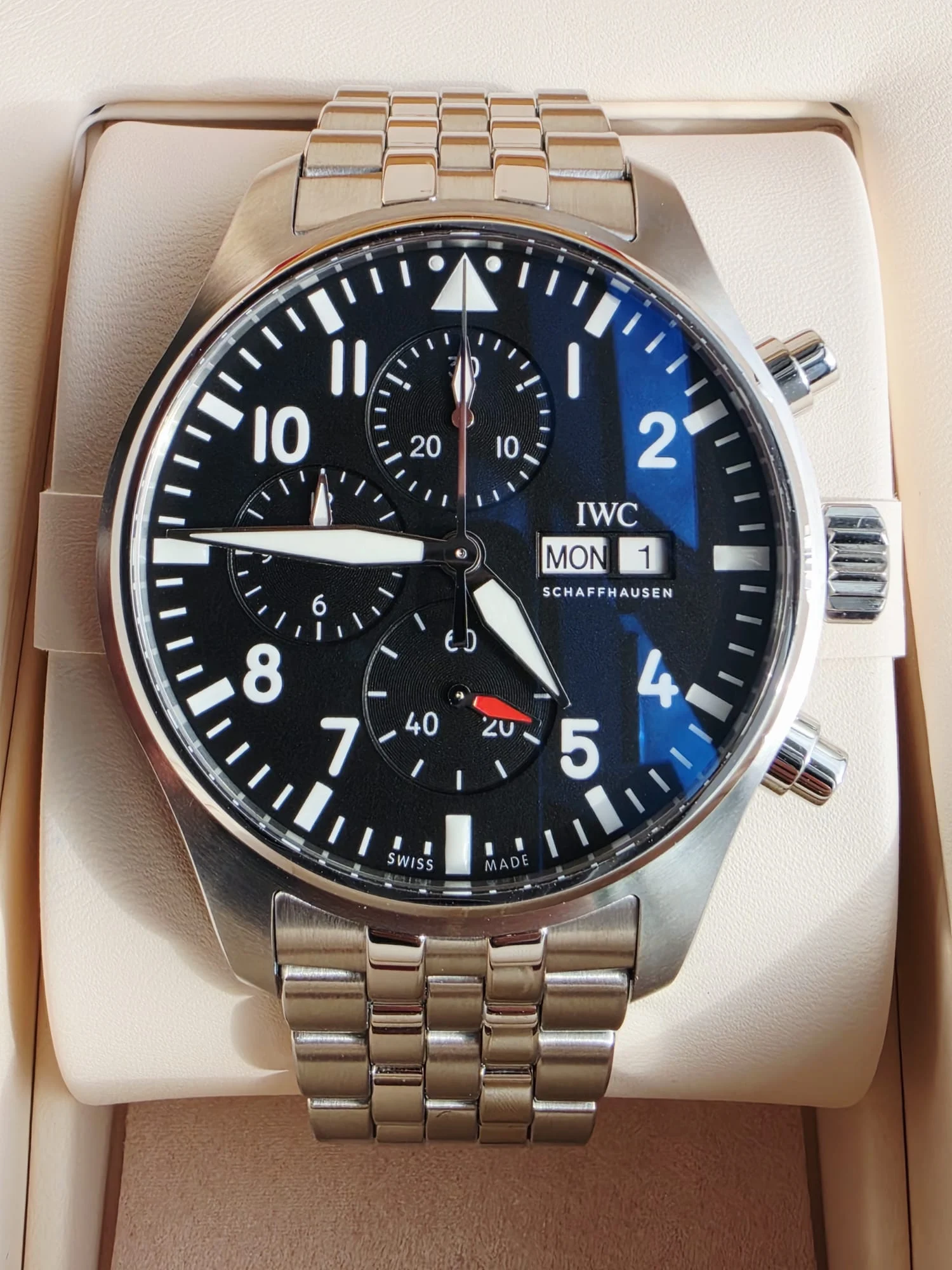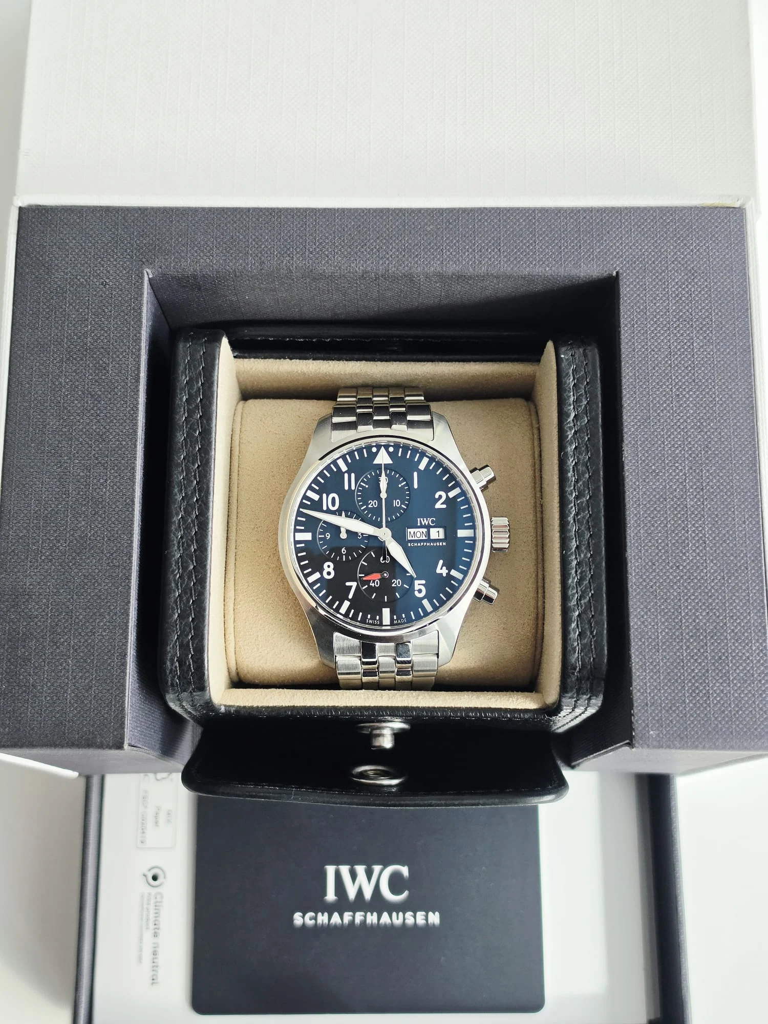 Czarna tarcza została zaprojektowana z myślą o maksymalnej przejrzystości, inspirowanej klasycznymi przyrządami pokładowymi. Wyraźne, kontrastowe indeksy oraz wskazówki pokryte masą luminescencyjną Super-LumiNova zapewniają doskonałą widoczność zarówno w dzień, jak i w nocy. Subtarcze chronografu rozmieszczone są w układzie tri-compax, a okienko dnia i daty na godzinie 3 podkreśla funkcjonalny charakter modelu. Charakterystyczny trójkąt na godzinie 12 ułatwia szybką orientację na tarczy — kluczową w lotnictwie.