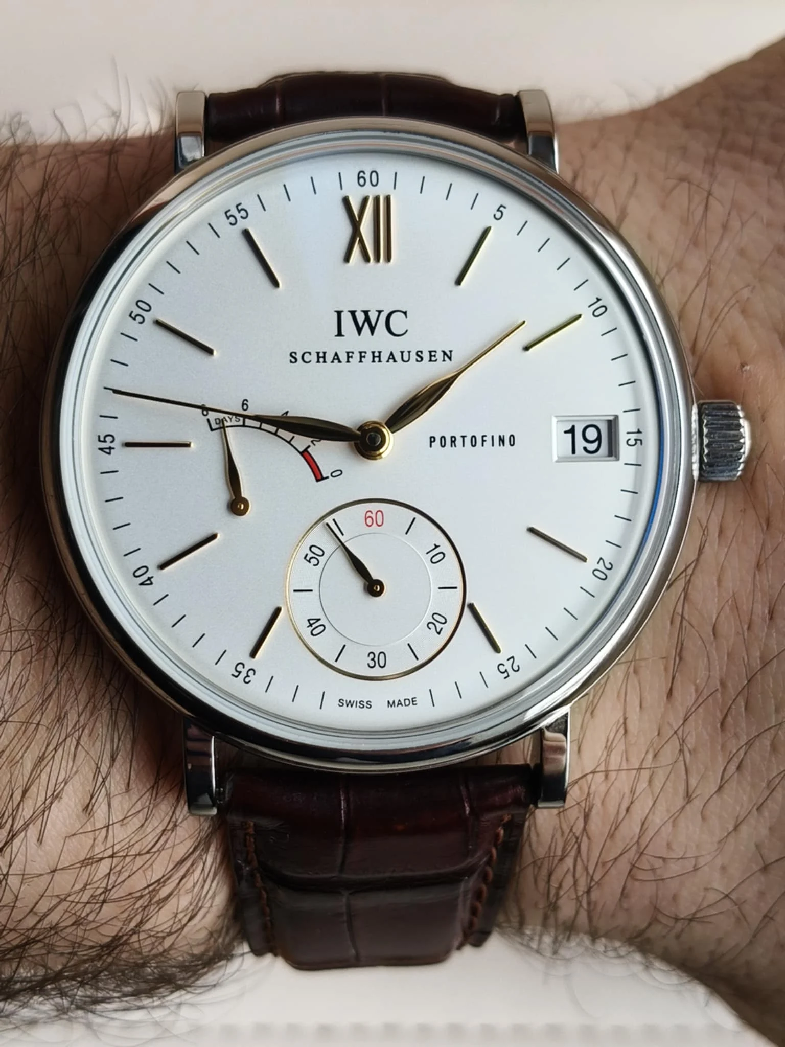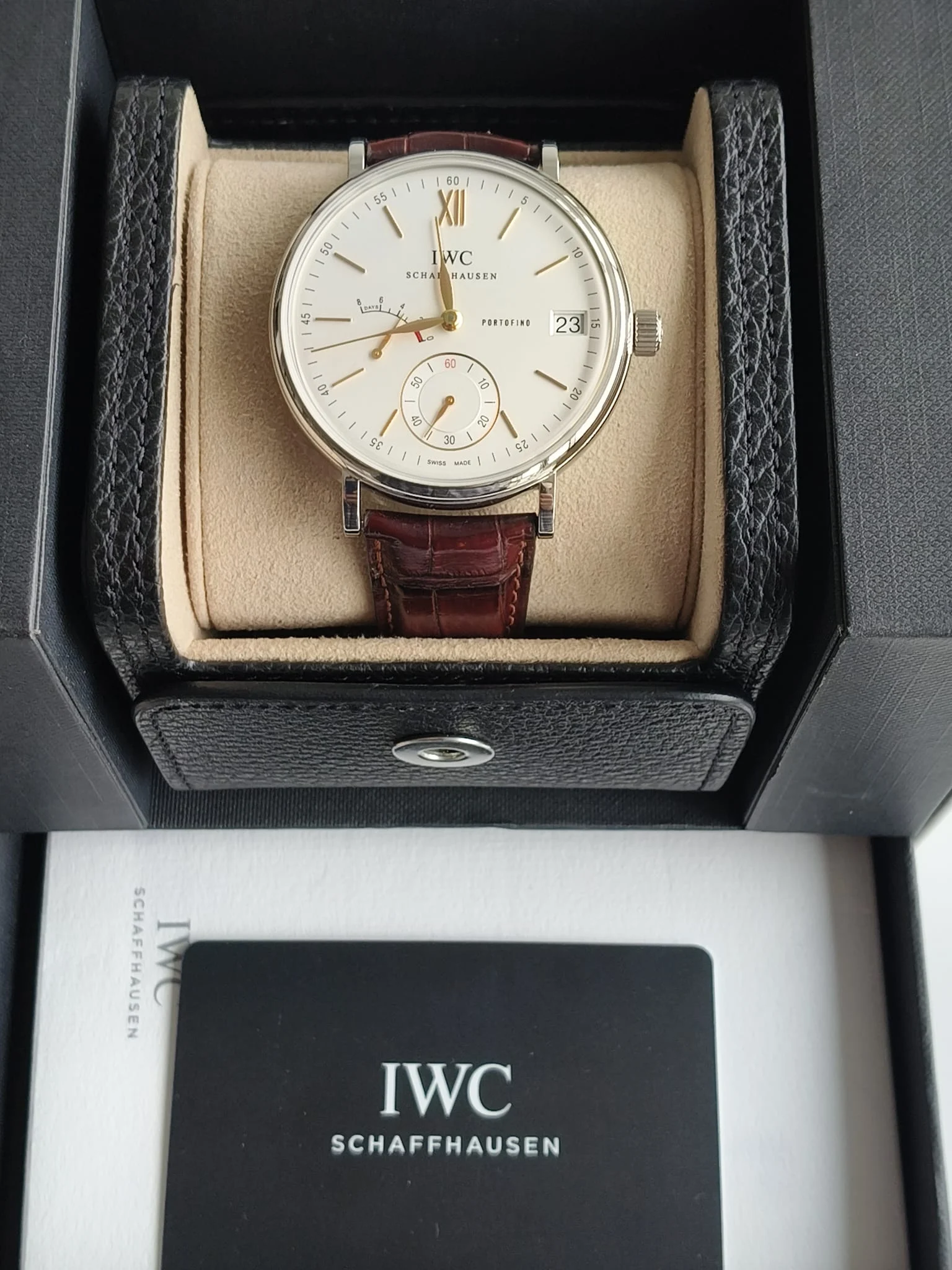 IWC Schaffhausen Portofino Hand-Wound Eight Days IW510103 to wyrafinowany, ręcznie nakręcany zegarek z kolekcji Portofino — idealna propozycja dla konesera klasyki, który ceni elegancję, prostotę i tradycyjne zegarmistrzostwo w najlepszym wydaniu. Ten model łączy minimalistyczną stylistykę z imponującą techniczną stroną mechanizmu, tworząc czasomierz, który nie tylko pięknie się prezentuje, ale też oferuje wysokie walory użytkowe.