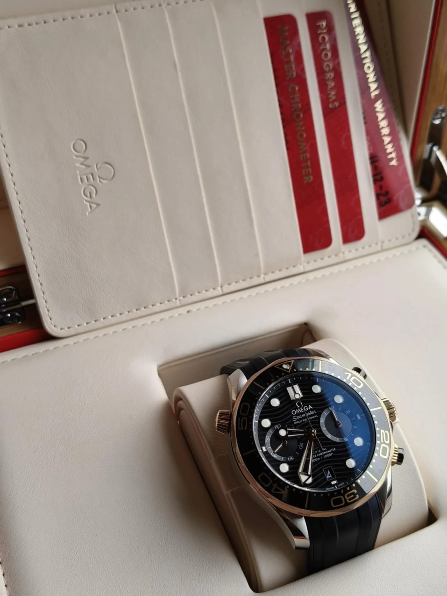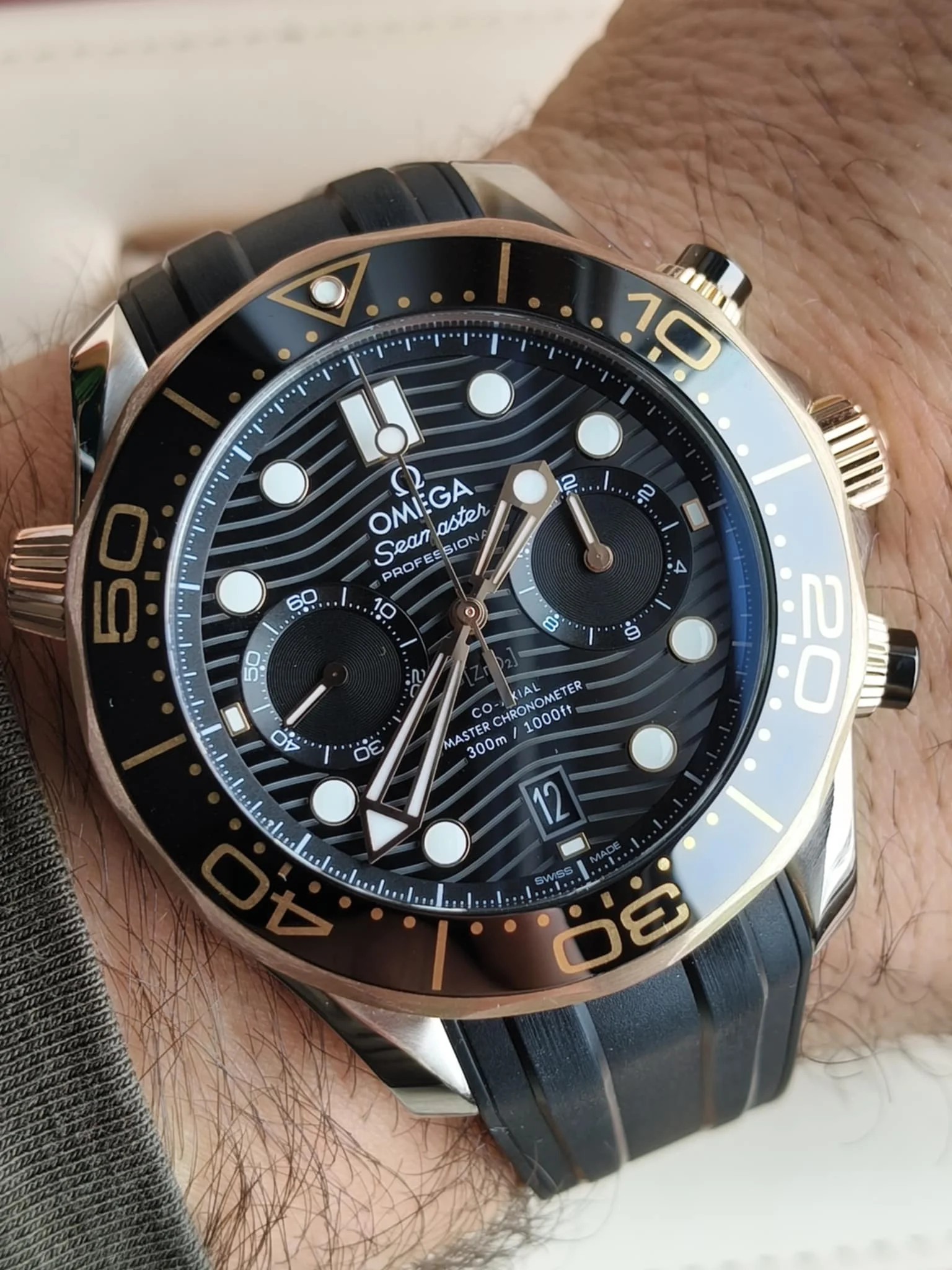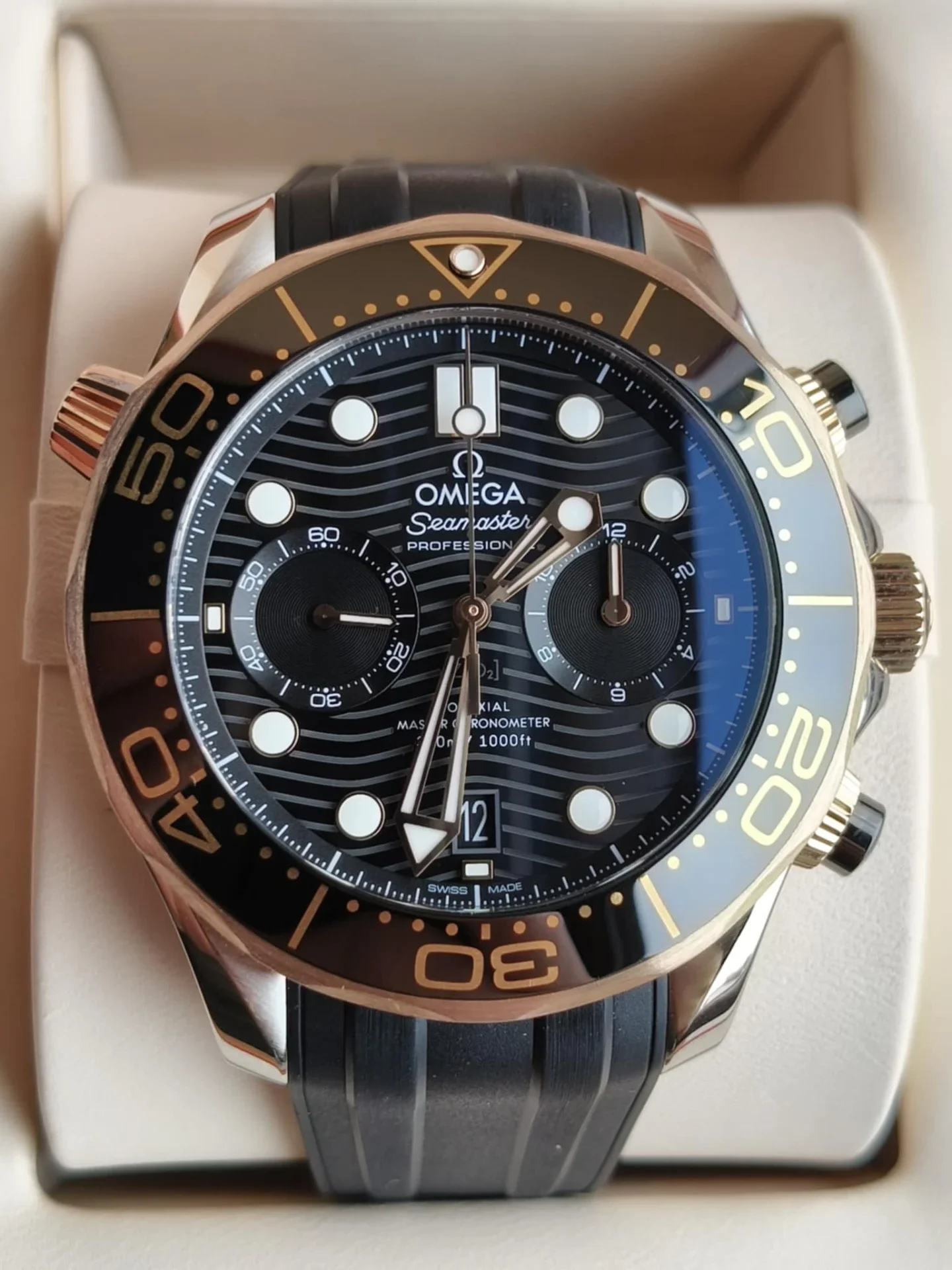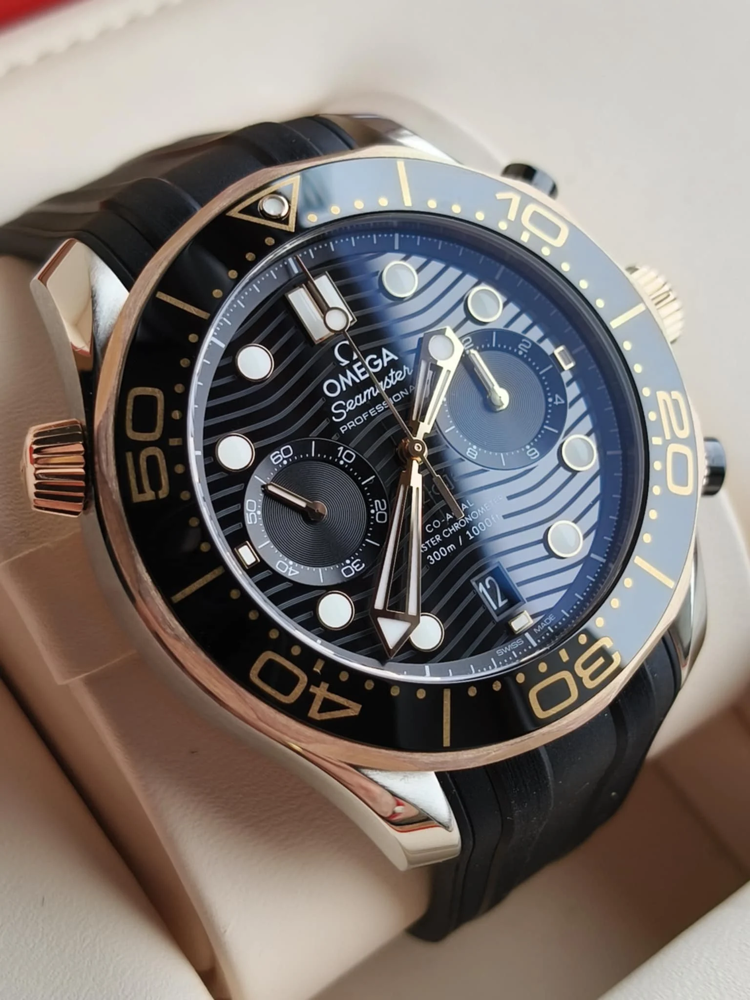 Omega Seamaster Diver 300M Chronograph 210.22.44.51.01.001 to kwintesencja sportowego luksusu, precyzji i prestiżu, które od ponad trzech dekad definiują legendarną linię Seamaster. Ten wyjątkowy model to zegarek dla mężczyzn pewnych siebie, ceniących doskonałe rzemiosło, technologiczną perfekcję i charakterystyczny, wyrazisty styl Omegi. Koperta o średnicy 44 mm, wykonana ze stali nierdzewnej i 18-karatowego różowego złota, emanuje mocą i elegancją zarazem. Jej wyważone proporcje oraz połączenie polerowanych i szczotkowanych powierzchni tworzą efekt głębi i luksusu. Charakterystyczna obrotowa luneta z czarnej ceramiki z wypełnieniem z ceragoldu łączy odporność na zarysowania z biżuteryjnym blaskiem. Pod szafirowym szkłem z powłoką antyrefleksyjną kryje się czarna, błyszcząca tarcza ceramiczna, ozdobiona falistym giloszowaniem — motywem, który stał się ikoną kolekcji Seamaster. Na tarczy umieszczono dwa precyzyjne liczniki chronografu, datownik na godzinie 6 oraz złote wskazówki i indeksy wypełnione Super-LumiNovą, gwarantujące doskonałą czytelność w każdych warunkach. Sercem zegarka jest mechanizm Omega Co-Axial Master Chronometer Calibre 9900, certyfikowany przez METAS. Ten zaawansowany kaliber z automatycznym naciągiem oferuje rezerwę chodu 60 godzin, charakteryzuje się wyjątkową odpornością na pola magnetyczne (do 15 000 gausów) i zapewnia perfekcyjną precyzję pomiaru czasu. Przez przeszklony dekiel z szafirowego szkła można podziwiać jego imponujące wykończenie — pasy genewskie w arabeskowym wzorze i kunsztowne zdobienia. Zegarek osadzony jest na eleganckim czarnym pasku z gumy, który podkreśla sportowy charakter modelu, jednocześnie zapewniając komfort noszenia. Wodoszczelność do 300 metrów sprawia, że Seamaster 300M Chronograph jest równie funkcjonalny pod wodą, co efektowny na lądzie. Omega Seamaster Diver 300M Chronograph 210.22.44.51.01.001 to hołd dla morskiego dziedzictwa marki — zegarek, który łączy siłę, precyzję i luksus w doskonałej harmonii. Idealny wybór dla mężczyzny, który ceni klasę, technologię i niezawodność w każdej sytuacji.