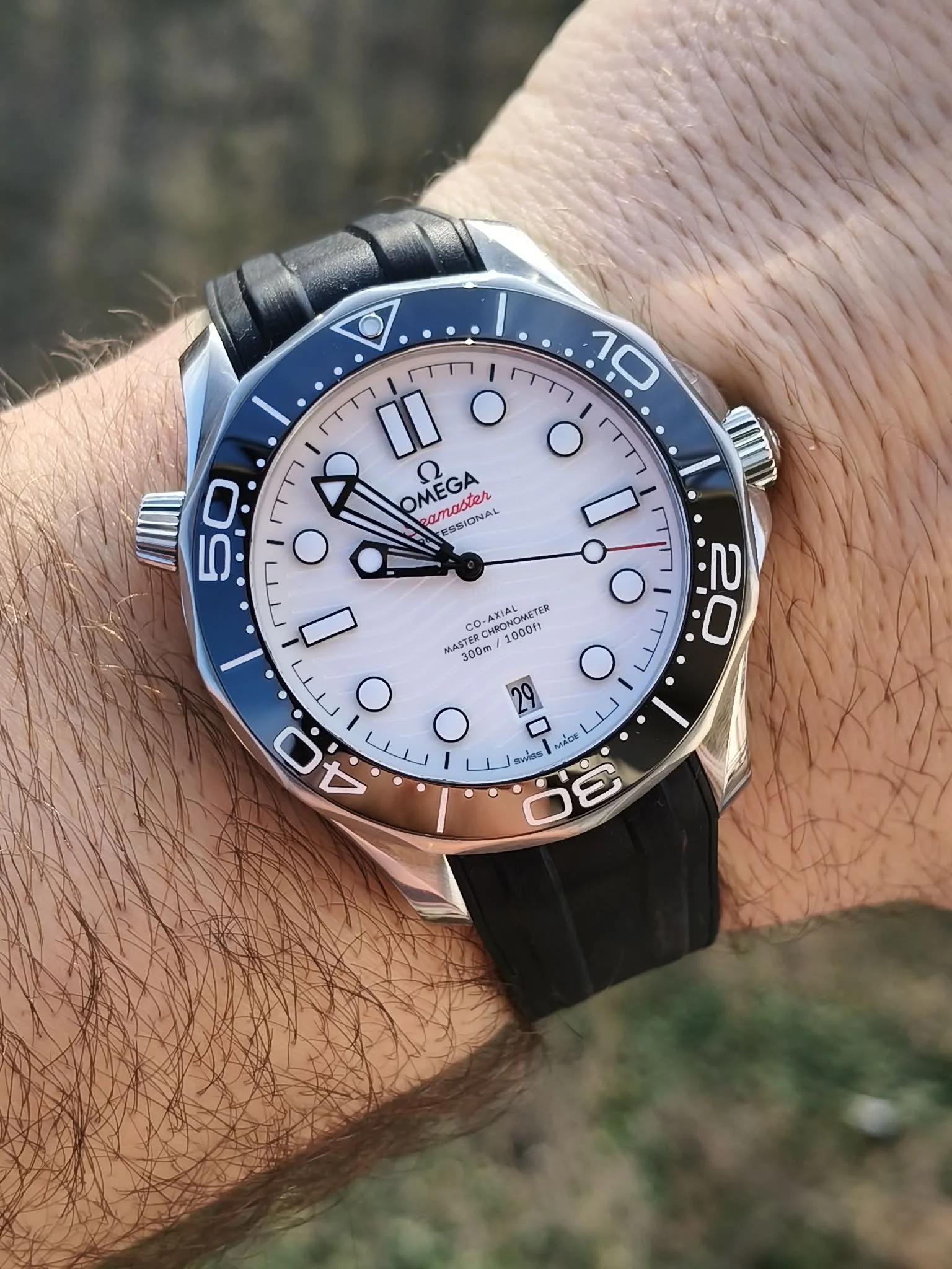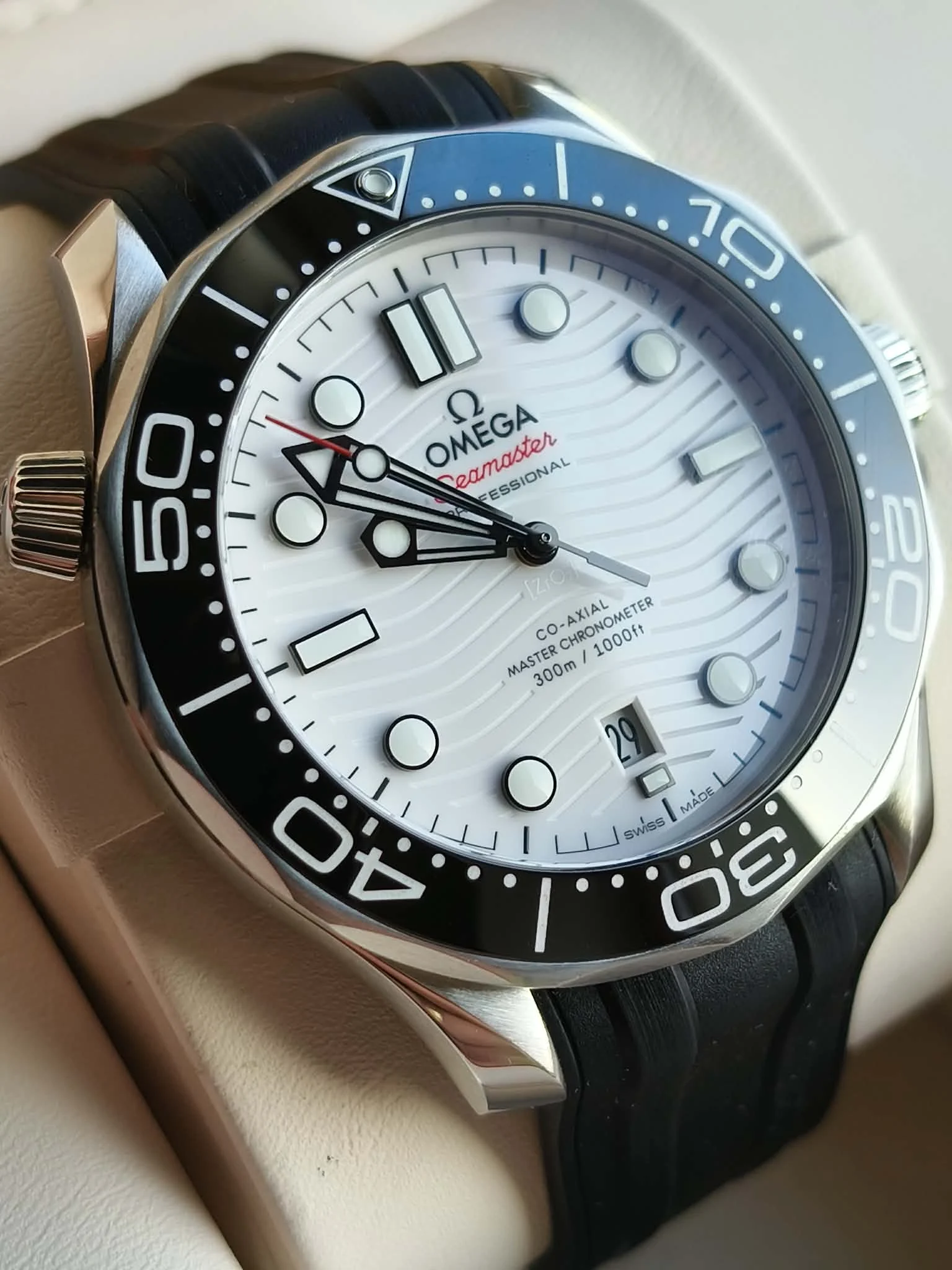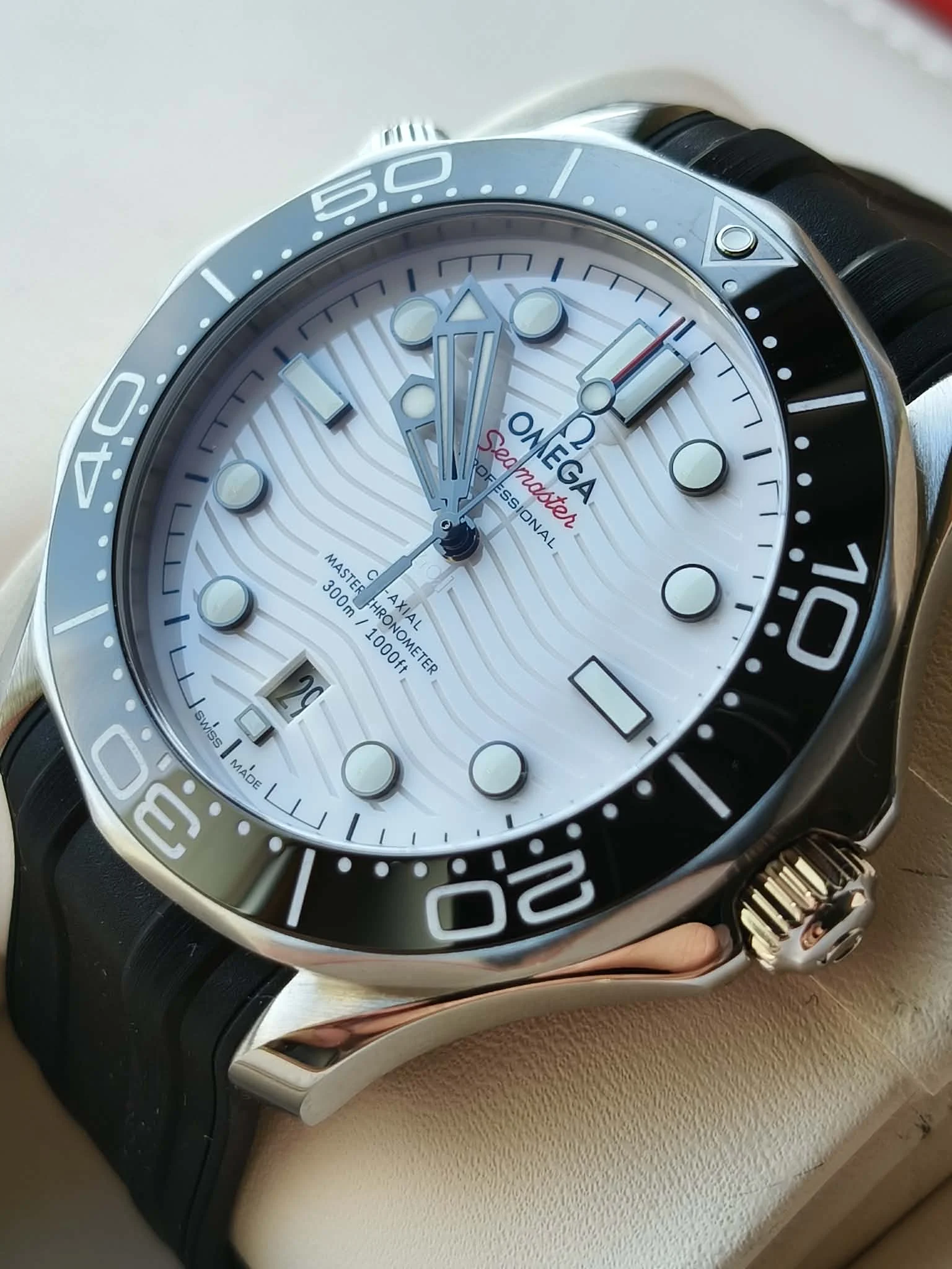 Tarcza w białym kolorze przyciąga wzrok charakterystycznym grawerem fal, wykonanym laserowo w ceramice. Nakładane indeksy godzinowe oraz szkieletowane wskazówki wypełnione białą substancją Super-LumiNova gwarantują znakomitą czytelność w każdych warunkach oświetleniowych. Okienko daty umieszczone na godzinie 6 zachowuje idealną symetrię tarczy, podkreślając jej nowoczesny i uporządkowany charakter.