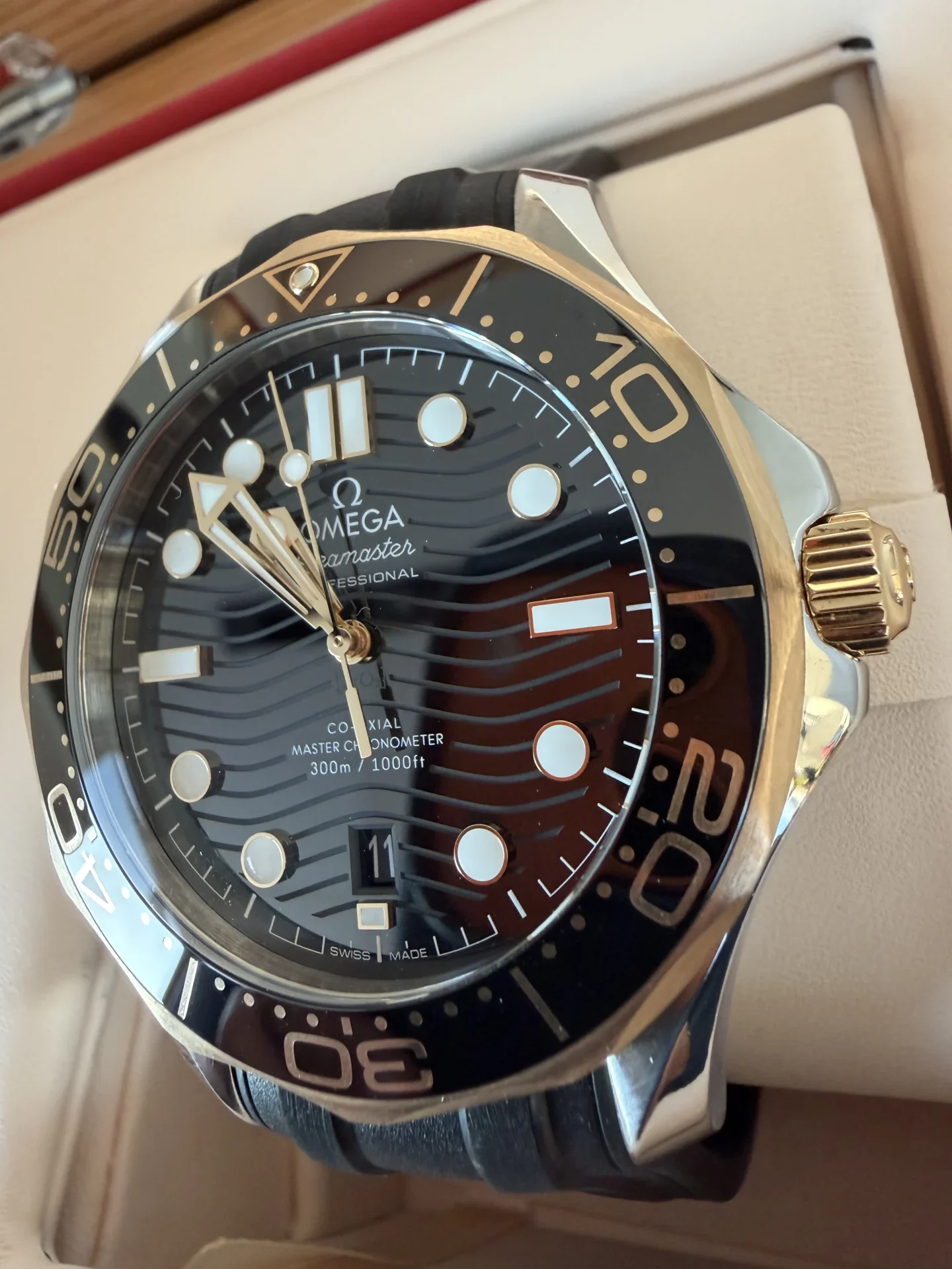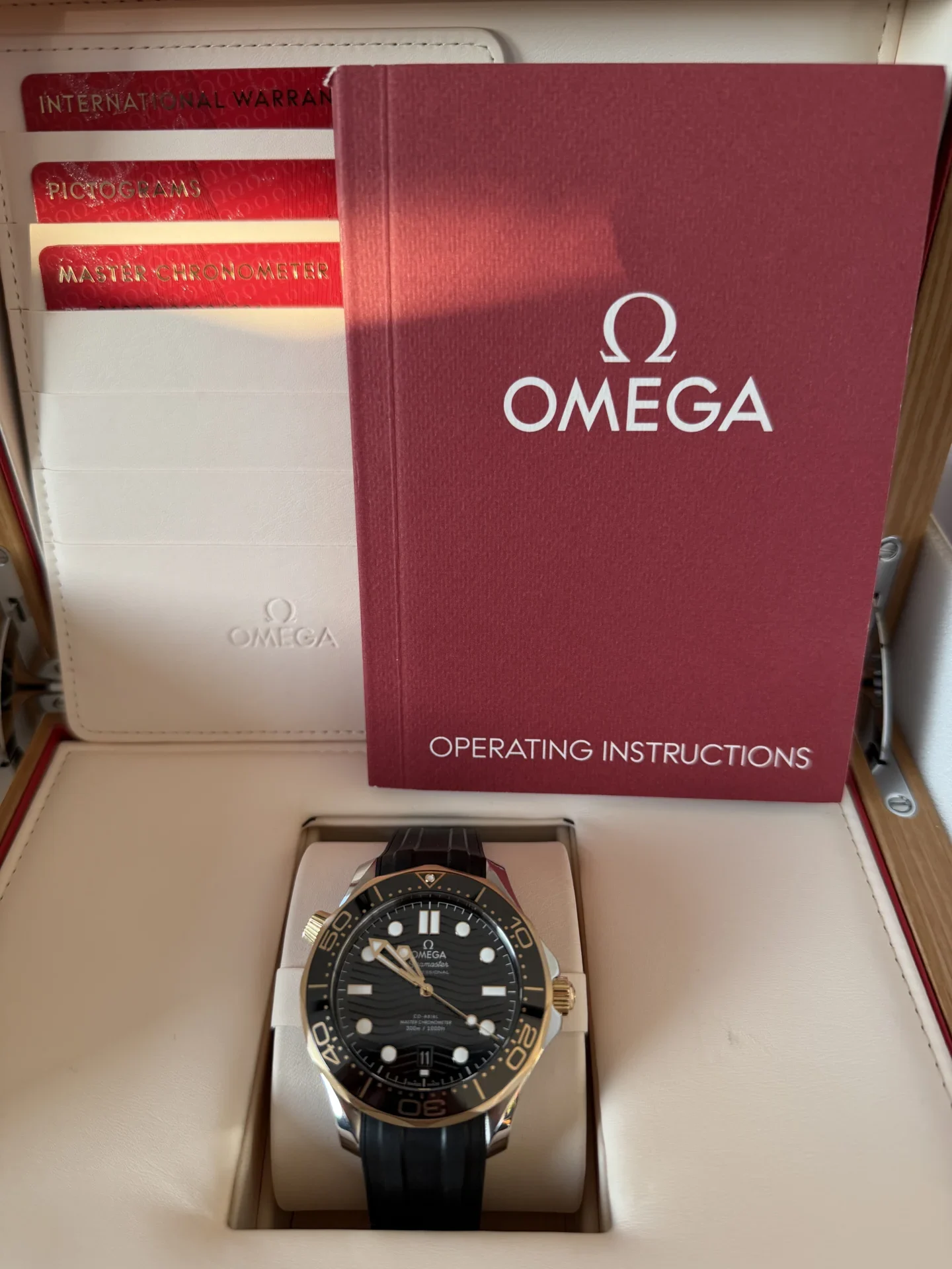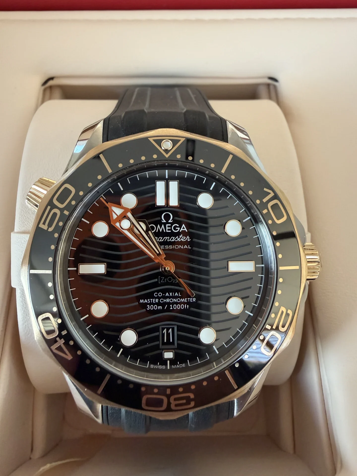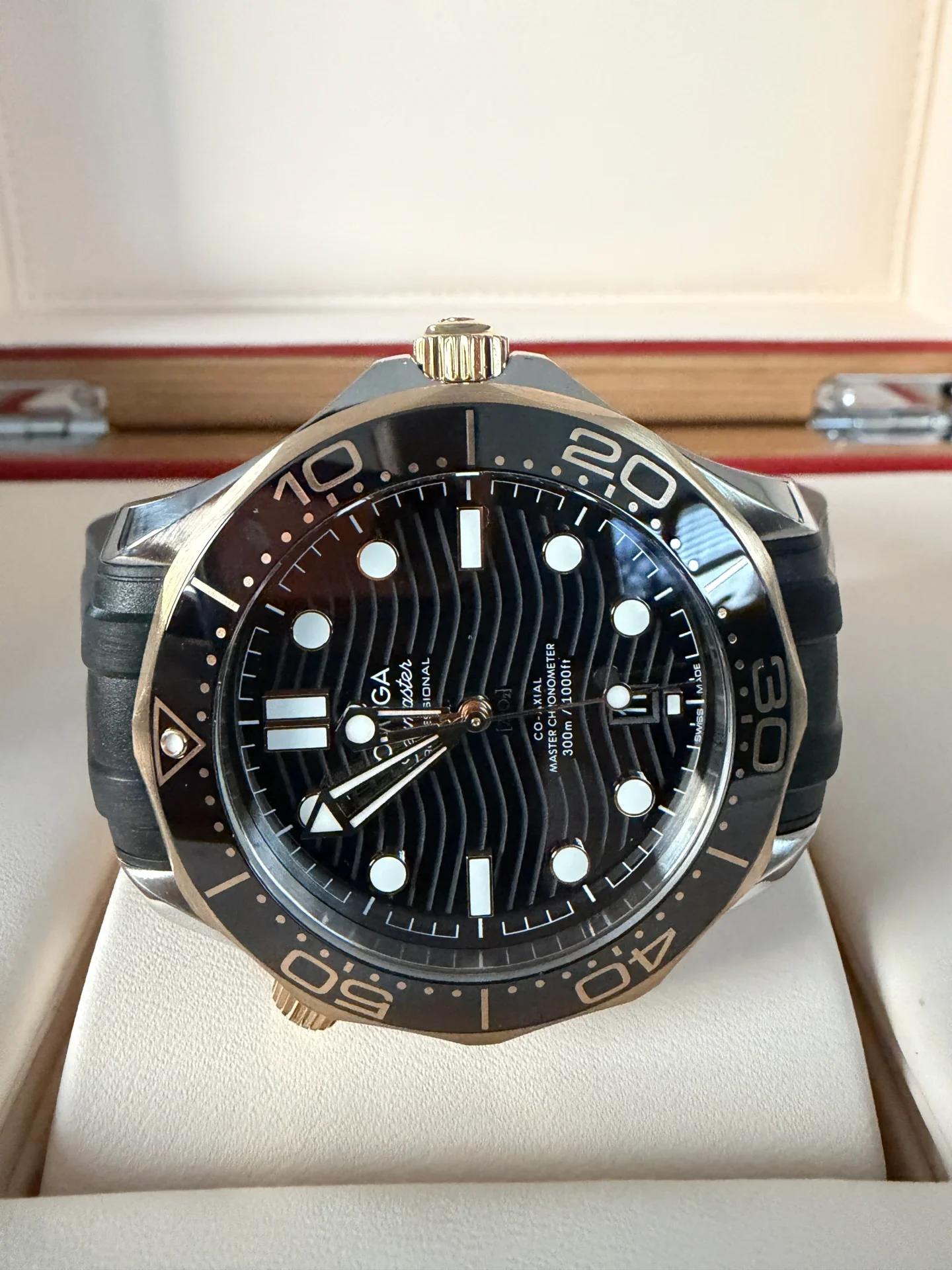 Omega Seamaster Diver 300M 210.22.42.20.01.001 to kwintesencja zegarkowego ducha przygody, technologicznej precyzji i ponadczasowej elegancji — idealny wybór dla mężczyzny aktywnego, kochającego wodę, podróże i styl. Koperta o średnicy 42 mm wykonana jest ze stali nierdzewnej w połączeniu z żółtym złotem 18K — zestawienie materiałów, które łączy solidność z luksusowym akcentem. Polerowane i satynowane powierzchnie koperty — z zaokrąglonymi, dopracowanymi krawędziami — nadają zegarkowi elegancki, a zarazem sportowy charakter, podkreślając morską tradycję kolekcji Seamaster. Tarcza tego modelu zachwyca głęboką czernią, a jej powierzchnię zdobi charakterystyczny dla Diverów laserowo grawerowany motyw fal — symbol oceanu, którego dziedzictwo Omega pielęgnuje od dziesięcioleci. Bezel jest jednokierunkowy, z czarnej ceramiki i z białą emaliowaną skalą nurkową, co zapewnia czytelność i funkcjonalność podczas nurkowania. Na tarczy widnieją nakładane indeksy oraz ażurowane wskazówki wykonane z 18K żółtego złota, wypełnione luminową (Super-LumiNova), co gwarantuje doskonałą czytelność w ciemności i w głębinach. Na godzinie 6 znajduje się dyskretne okienko datownika. Serce zegarka stanowi certyfikowany przez METAS mechanizm z automatycznym naciągiem — kaliber 8800. Ten zaawansowany mechanizm z koaksjalnym wychwytem jest odporny na pola magnetyczne (ponad 15 000 gaussów), zapewnia precyzyjny chód i stabilność oraz oferuje około 55 godzin rezerwy chodu. Dekiel z przezroczystym szkłem szafirowym pozwala podziwiać kunsztownie wykończony mechanizm z charakterystycznym falowanym zdobieniem mostków i rotora. Wodoodporność do 300 metrów, zakręcana koronka oraz koniczny zawór helowy czynią Diver 300M sprzętem gotowym do prawdziwego nurkowania — lecz jednocześnie jego eleganckie wykończenie i luksusowe akcenty sprawiają, że doskonale prezentuje się także w miejskim otoczeniu, na co dzień lub podczas podróży. Czarno-złota kolorystyka i czarny kauczukowy pasek (lub opcjonalnie bransoleta) nadają zegarkowi uniwersalnego stylu — od garnituru po strój nurkowy. Omega Seamaster Diver 300M 210.22.42.20.01.001 to więcej niż tylko narzędzie do pomiaru czasu — to manifest wolności, morskiego dziedzictwa i technicznego mistrzostwa. Zegarek dla tych, którzy chcą zanurzyć się w przygodzie z klasą, precyzją i stylem sygnowanym przez Omega.