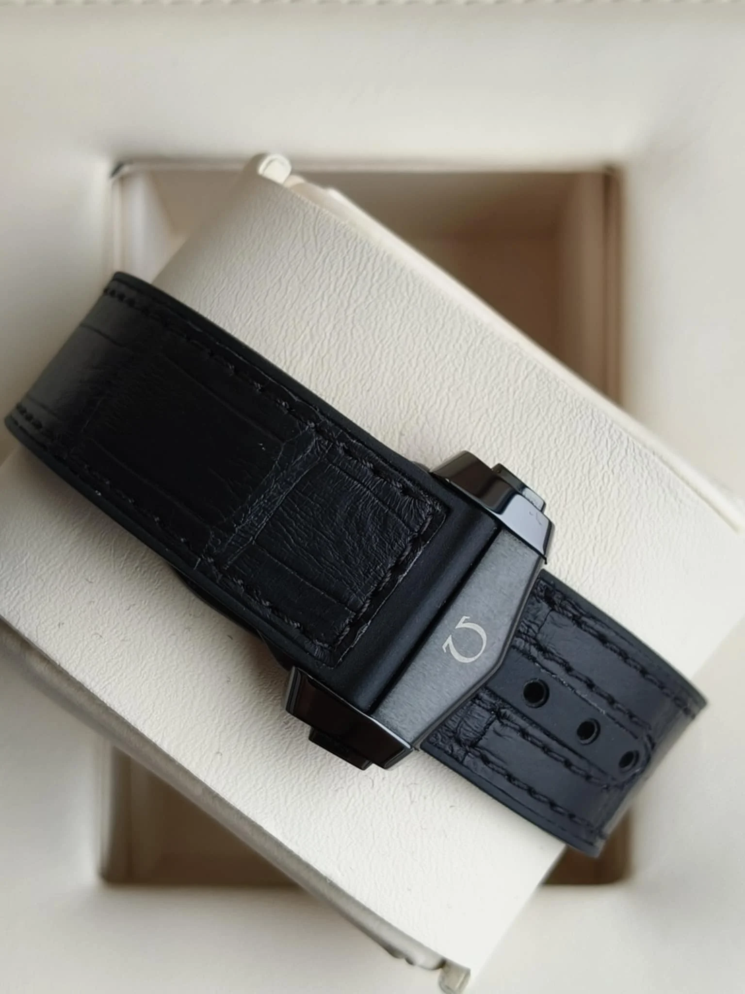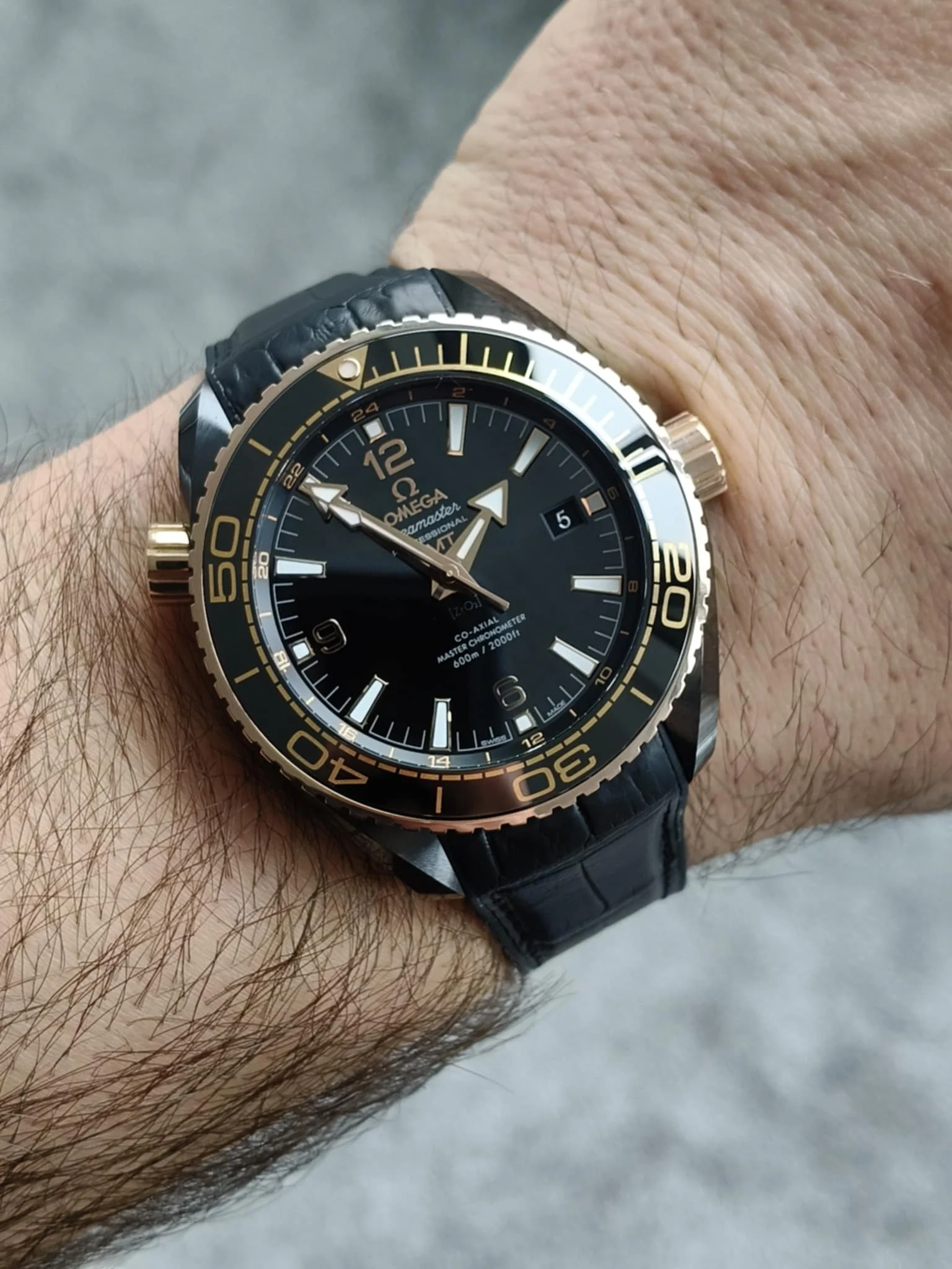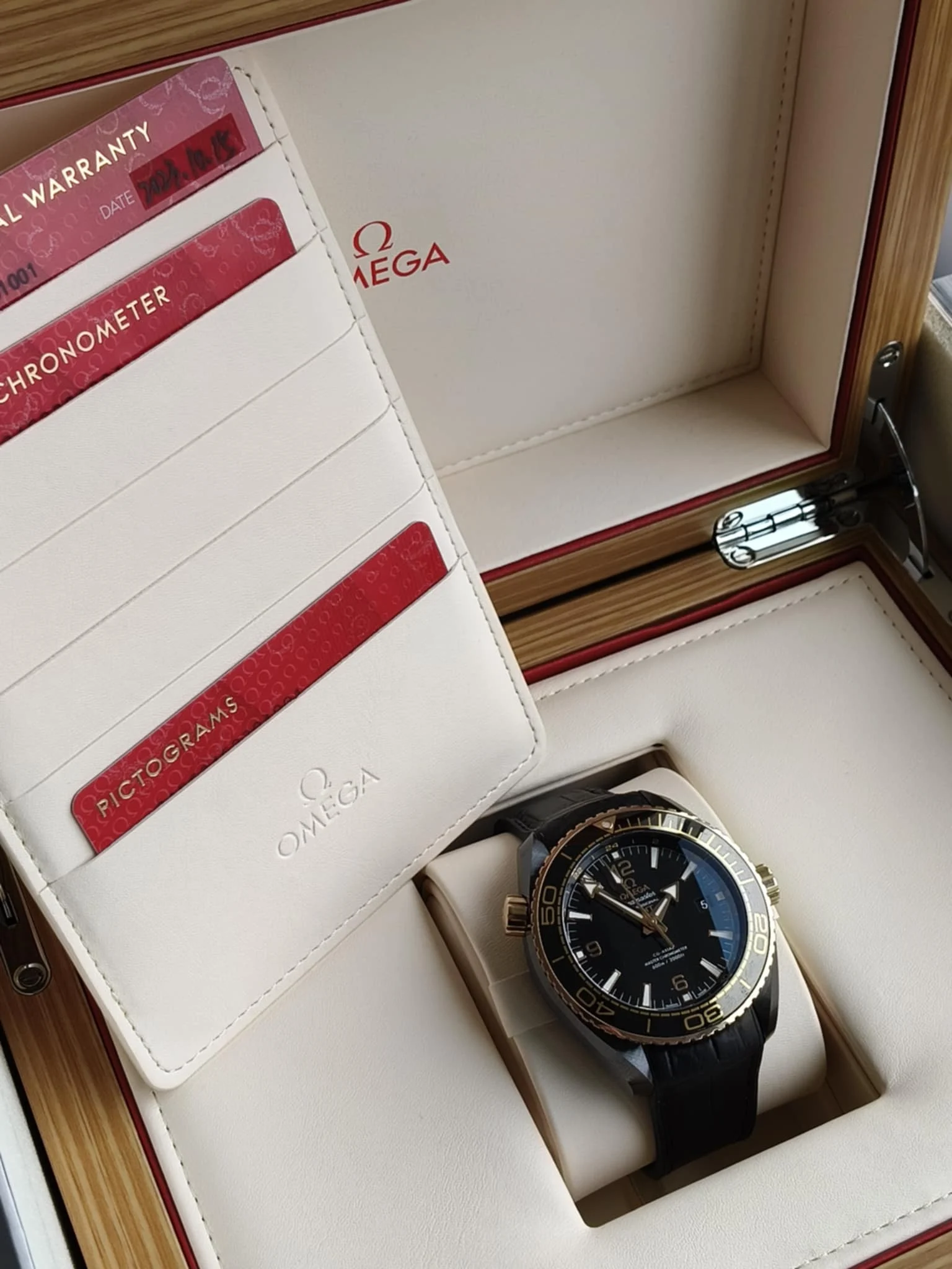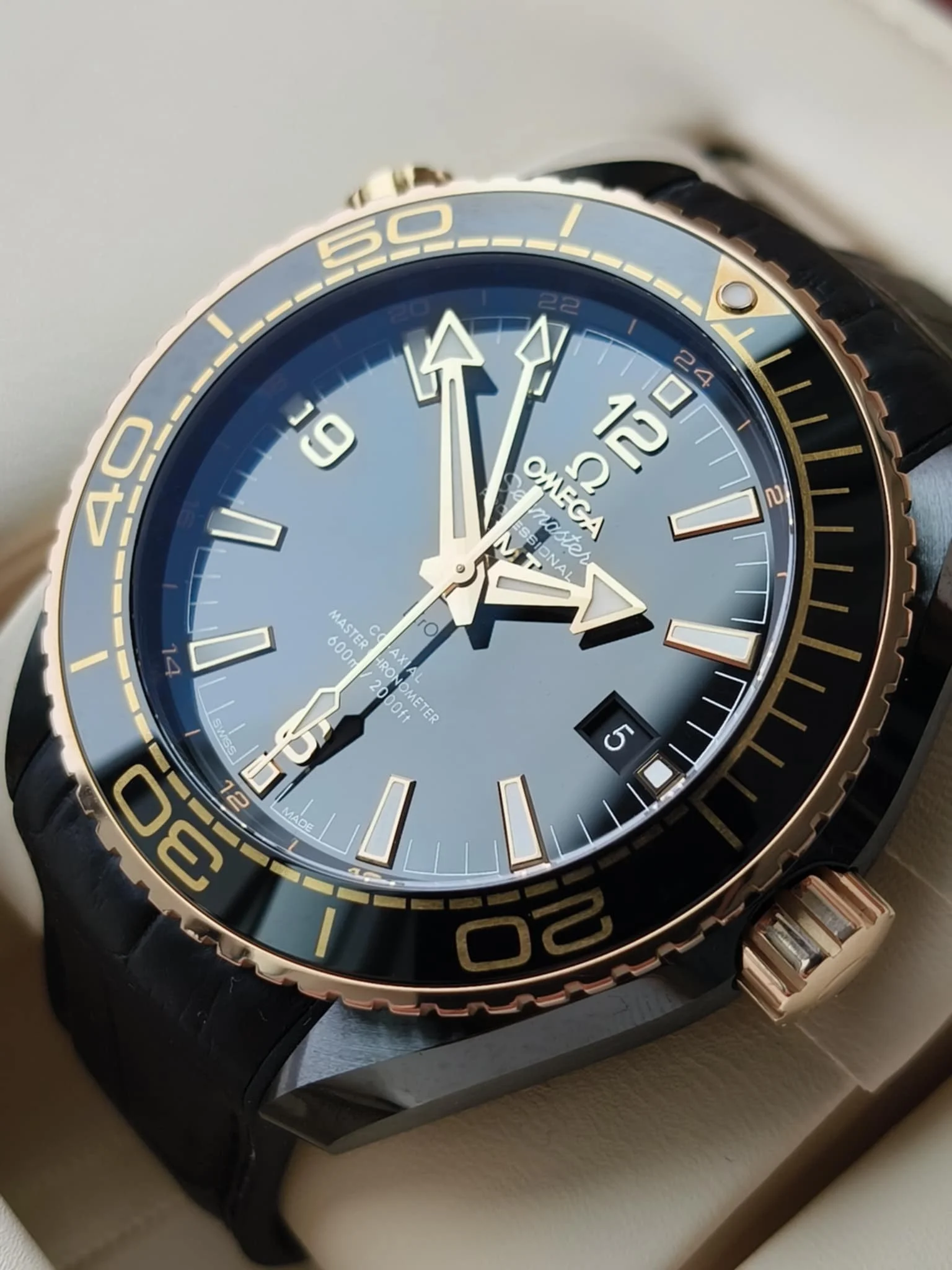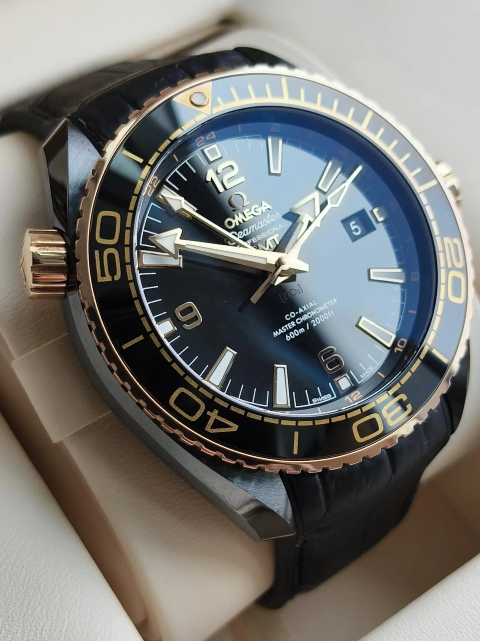 Omega Planet Ocean Deep Black 215.63.46.22.01.001 jest częścią kolekcji Planet Ocean, która jest znana ze swojego związku z nurkowaniem oraz wysokich standardów w zakresie technologii zegarmistrzowskiej. Omega Planet Ocean Deep Black ma kopertę wykonaną z czarnej ceramiki, co sprawia, że jest lekka, a jednocześnie bardzo wytrzymała. Ceramika jest odporna na zarysowania i nie blaknie z upływem czasu. Zegarek ma charakterystyczną, głęboką czarną tarczę, która kontrastuje ze złotymi wskazówkami i indeksami. Obrotowy bezel wykonany jest z ceramiki i 18 karatowego złota co zapewnia mu dodatkową trwałość i odporność na zarysowania. Zegarek napędzany jest automatycznym mechanizmem Omega Co-Axial 8906, który charakteryzuje się dużą precyzją i niezawodnością. Mechanizm ten jest również odporny na pole magnetyczne, co jest istotne w dzisiejszych czasach, gdy wiele przedmiotów codziennego użytku generuje pole magnetyczne. Model ten jest certyfikowany do głębokości 600 metrów (60 bar), co czyni go idealnym dla nurków oraz osób aktywnie spędzających czas pod wodą. Posiada również zawór helowy, który pozwala na bezpieczne korzystanie z zegarka podczas nurkowania na dużych głębokościach. Pasek wykonany jest z kauczuku i skóry aligatora. Omega ma długą historię związku z nurkowaniem i sportami wodnymi. Modele z serii Planet Ocean są regularnie wybierane przez profesjonalnych nurków oraz pasjonatów.
